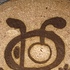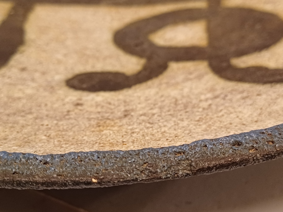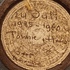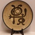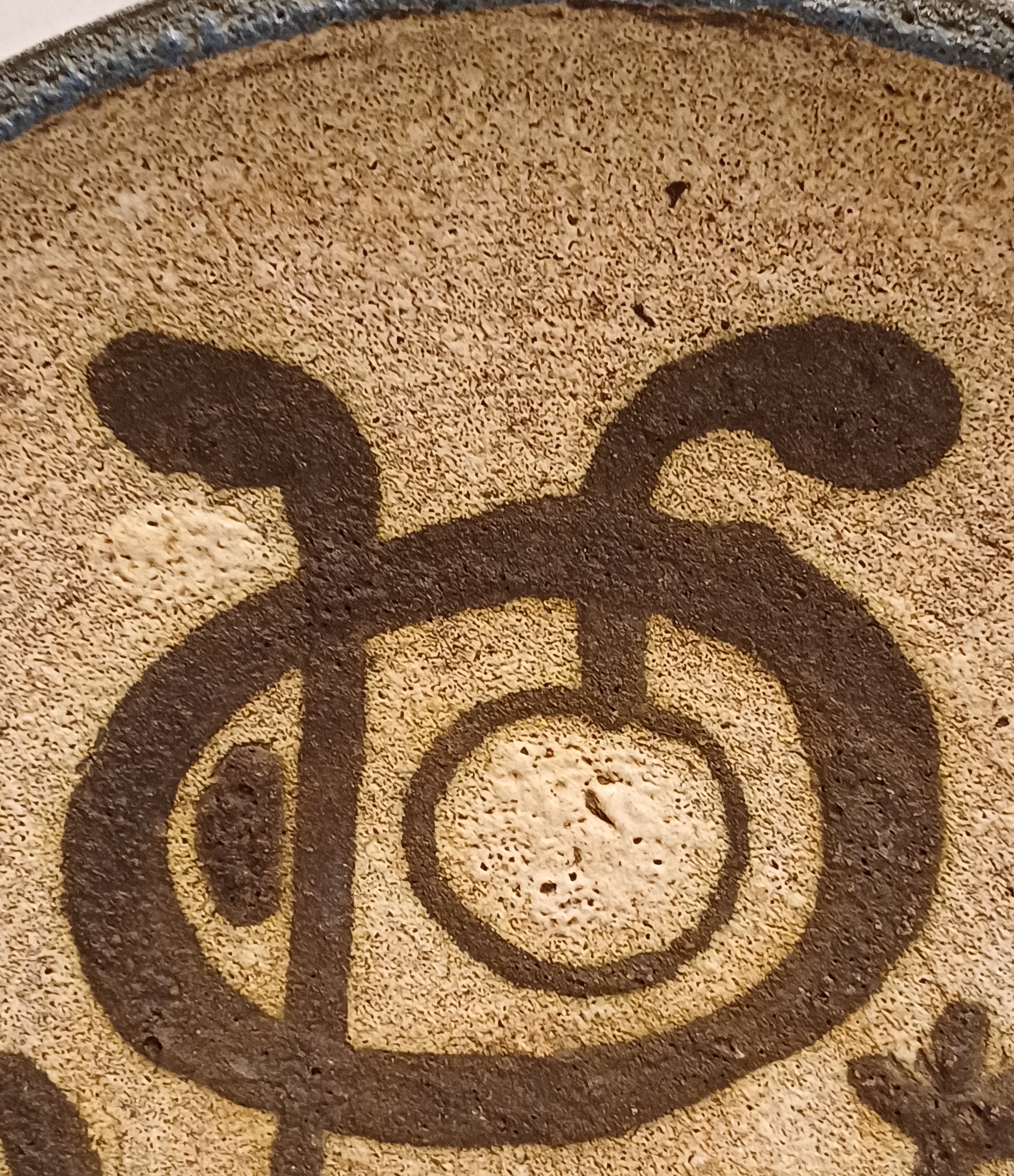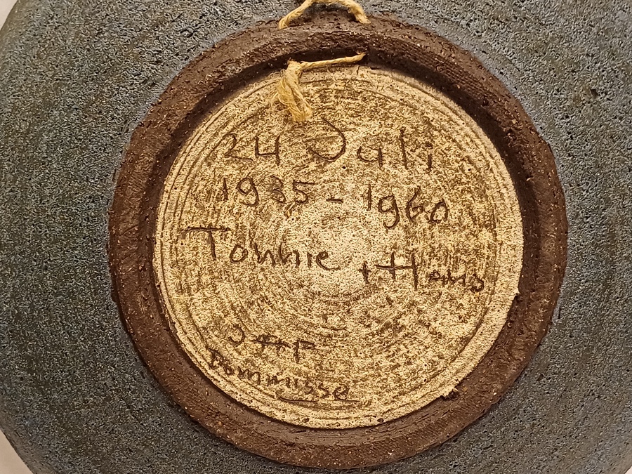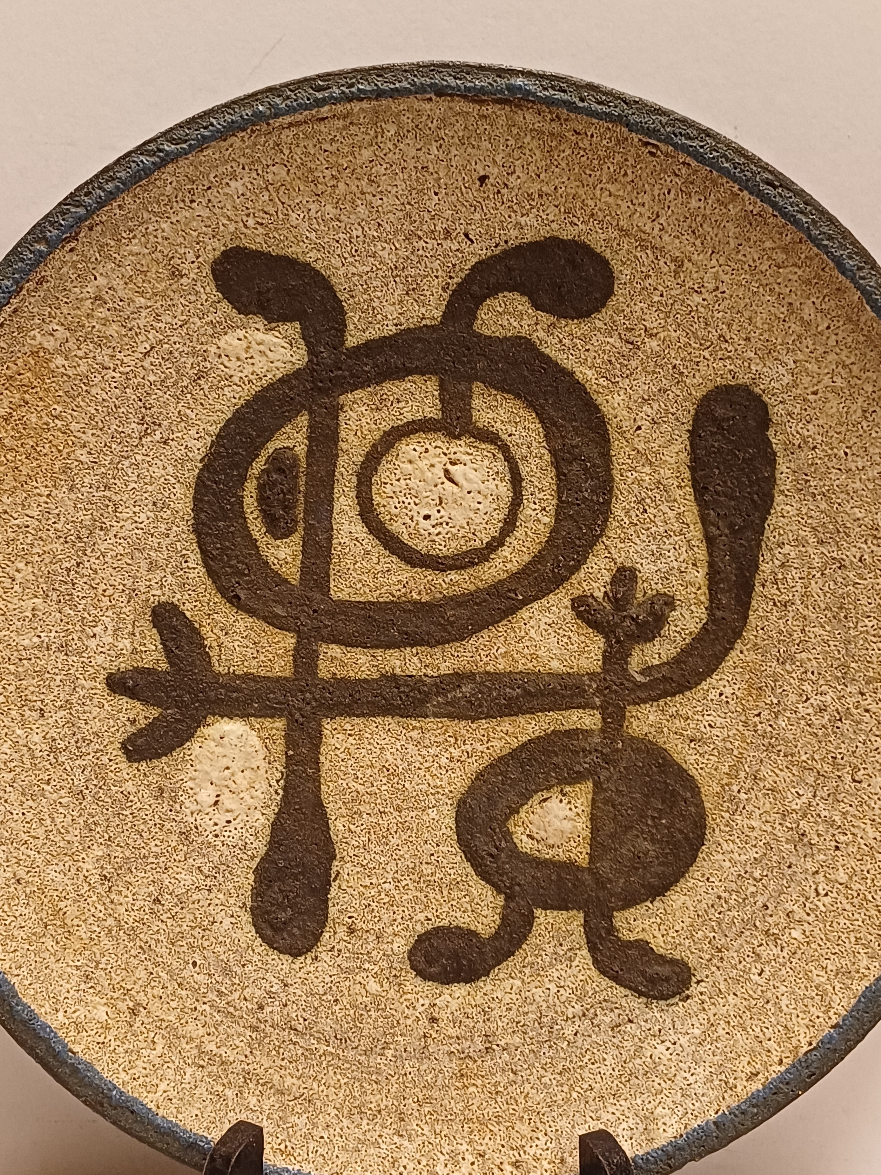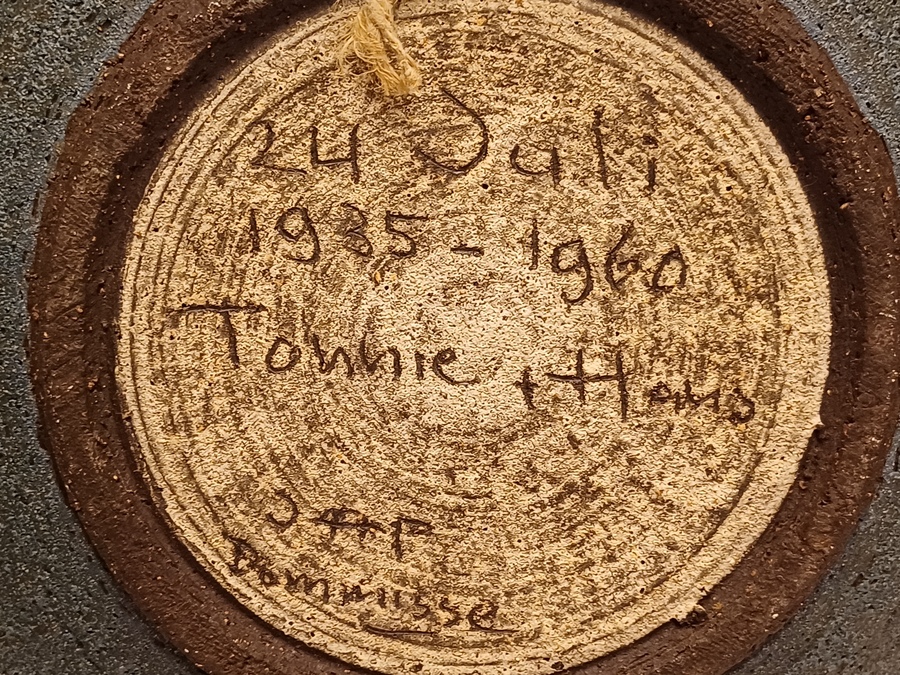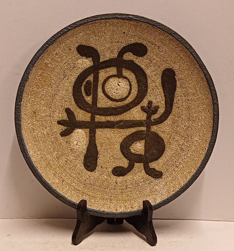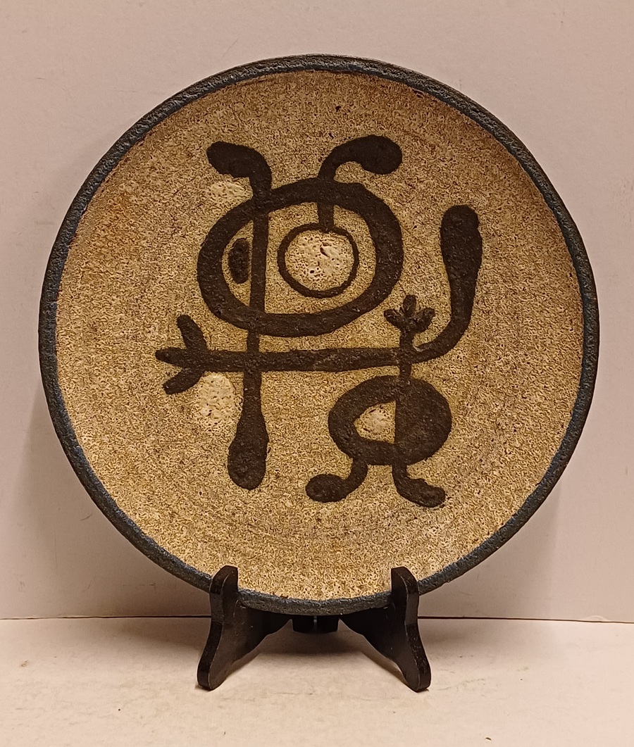 Wandbord met voorstelling van een gestileerd figuur op grijze ondergrond. Achterzijde voluit gesigneerd en 24 juli Tonnie + Hans 1935-1960.