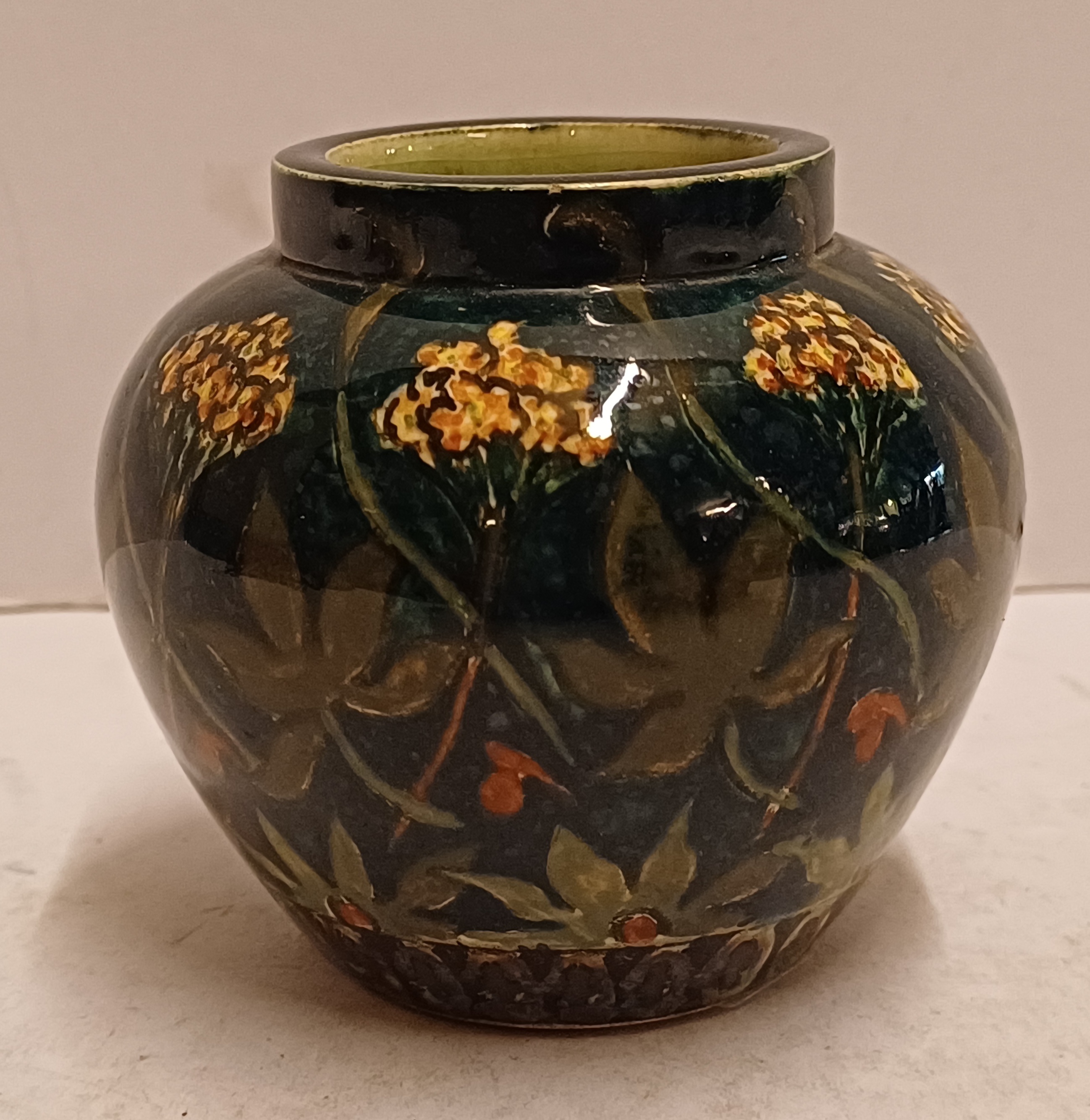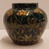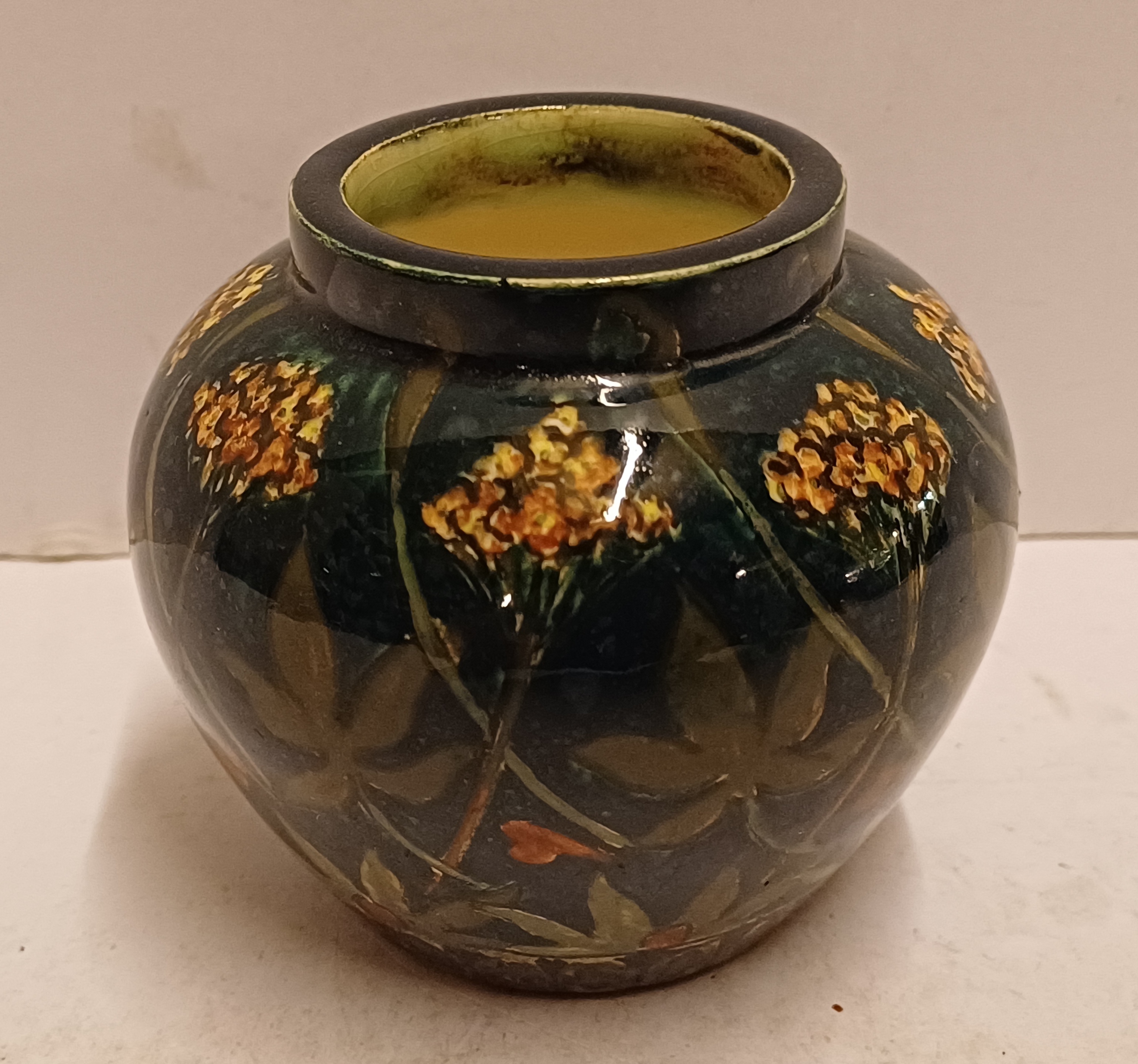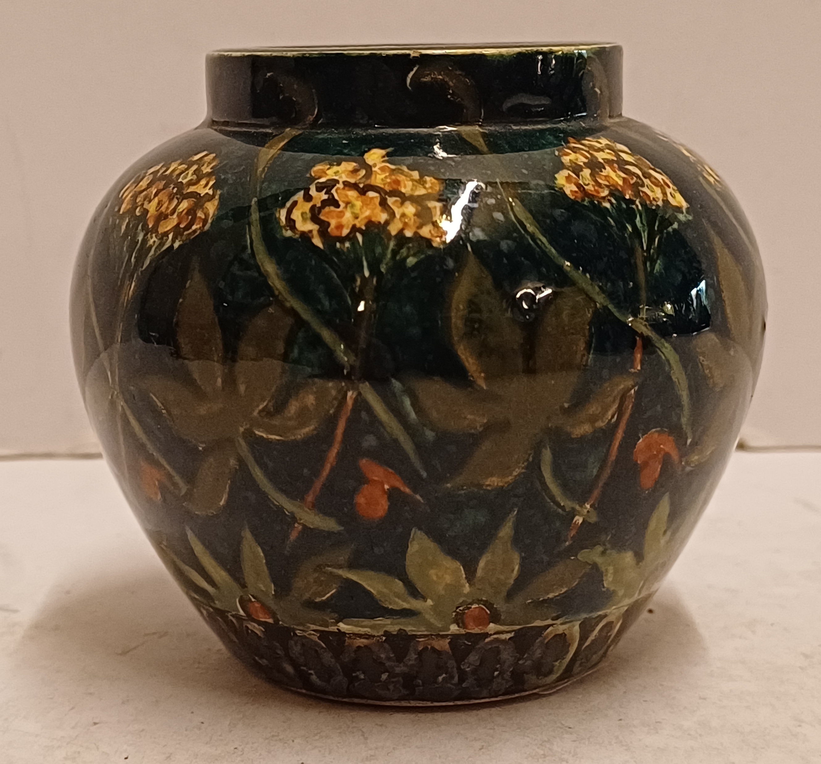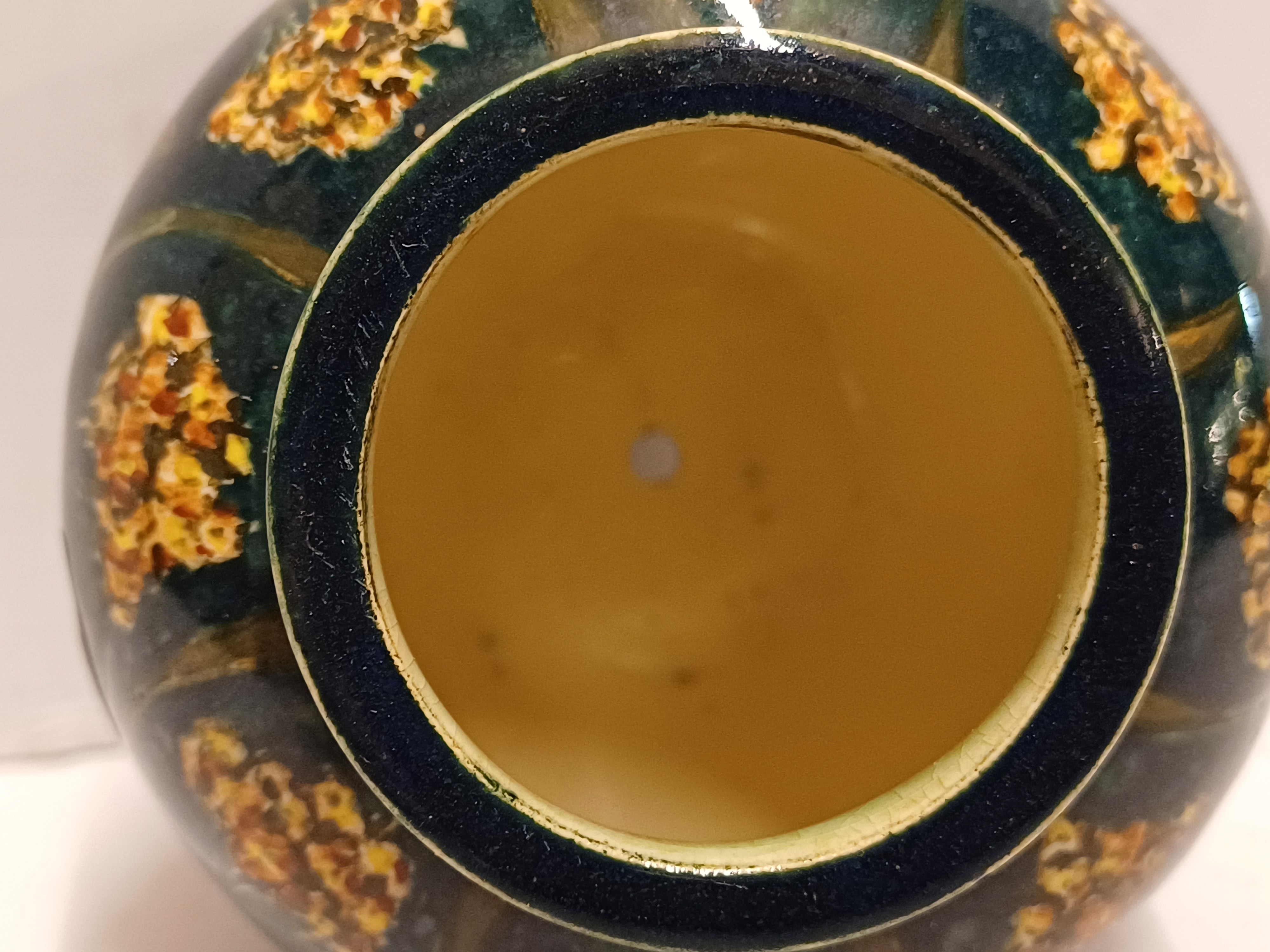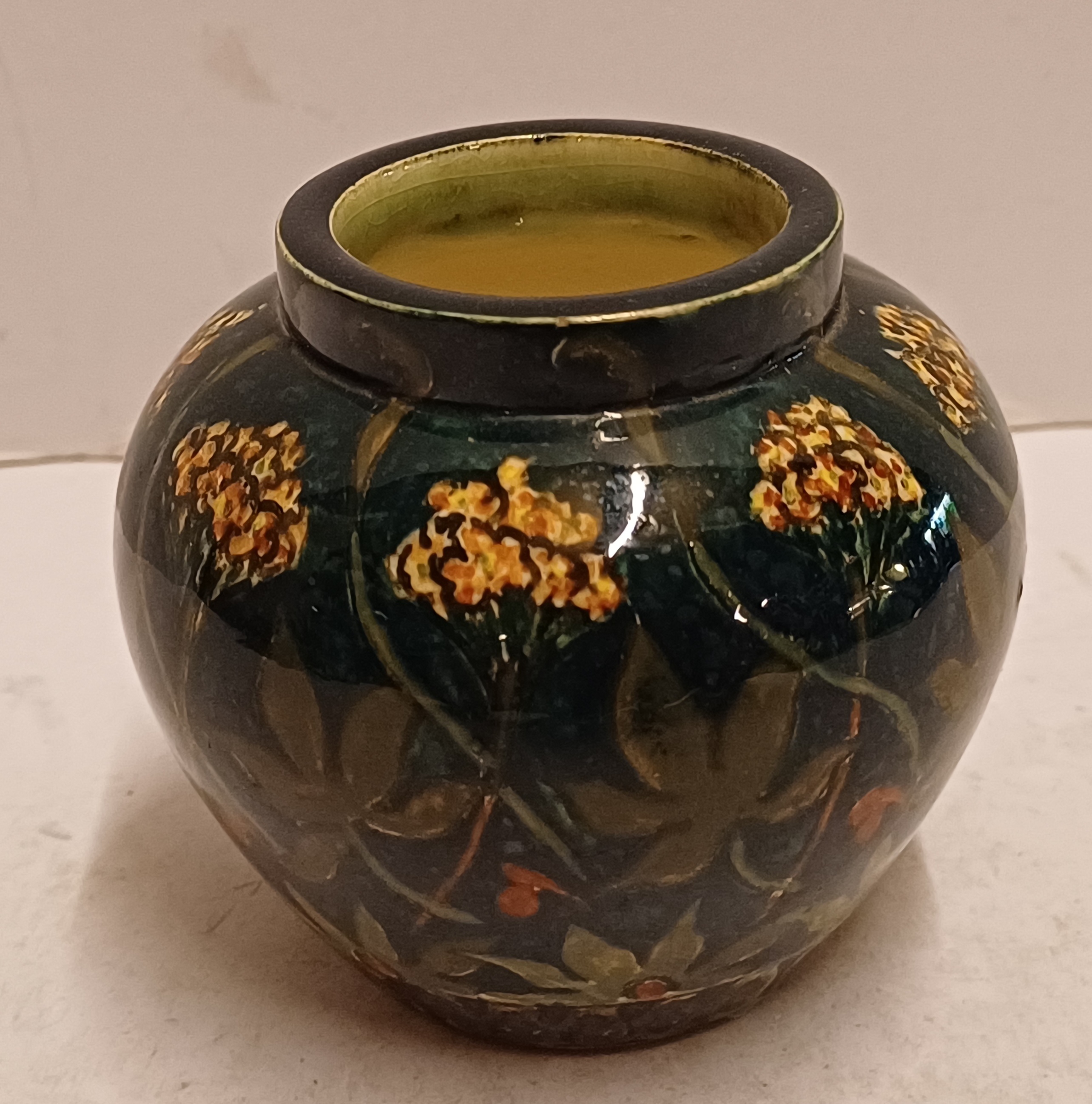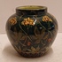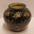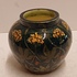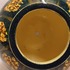 Maceta para cactus de loza con decoración floral estilizada sobre fondo azul. Parte inferior firmada y con la letra anual M = 1896.