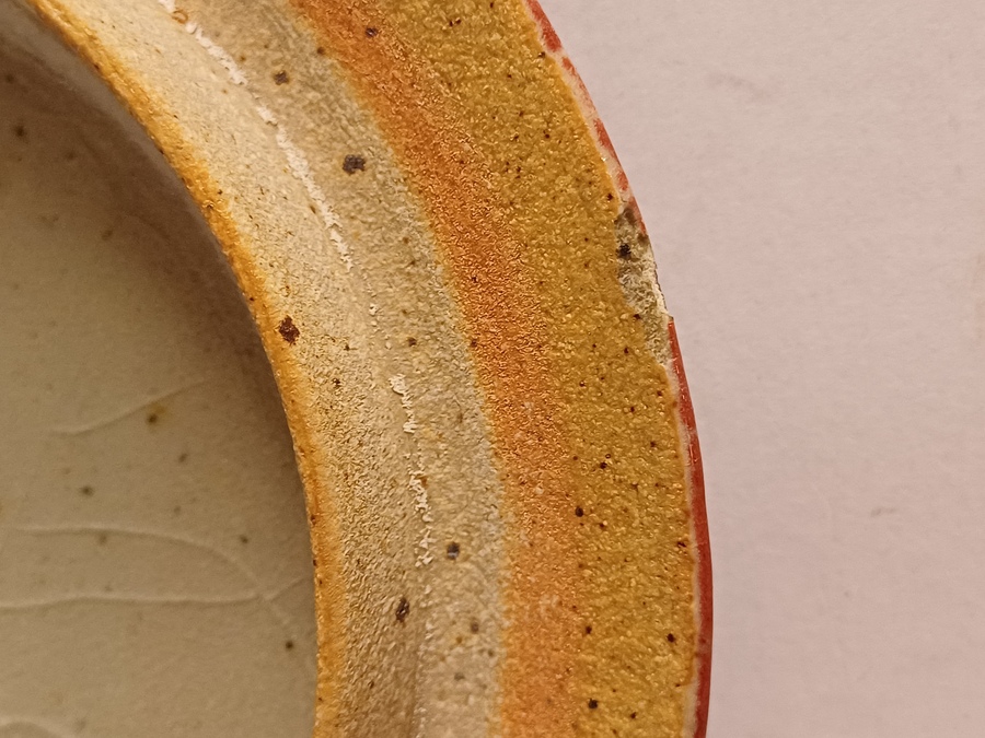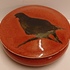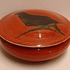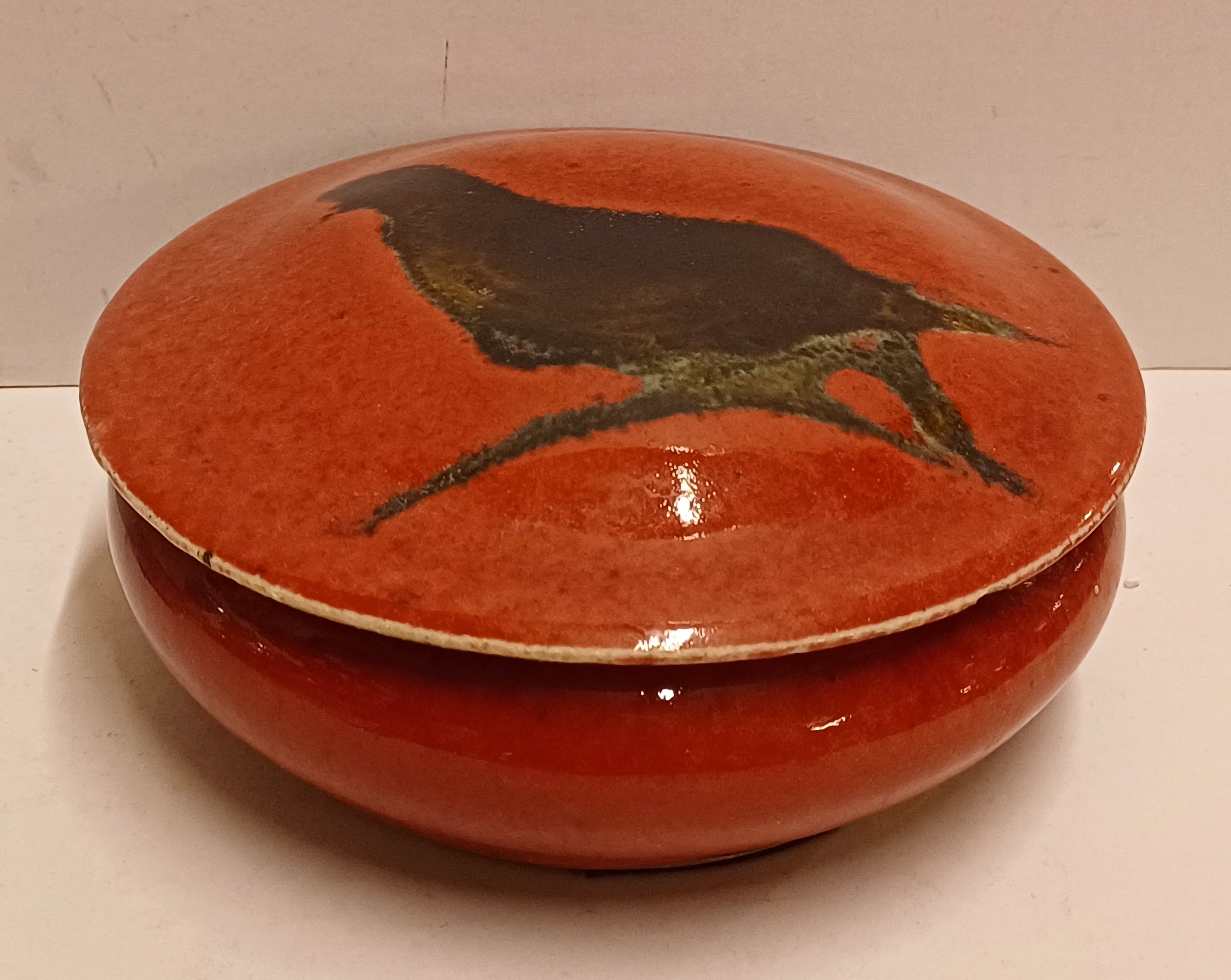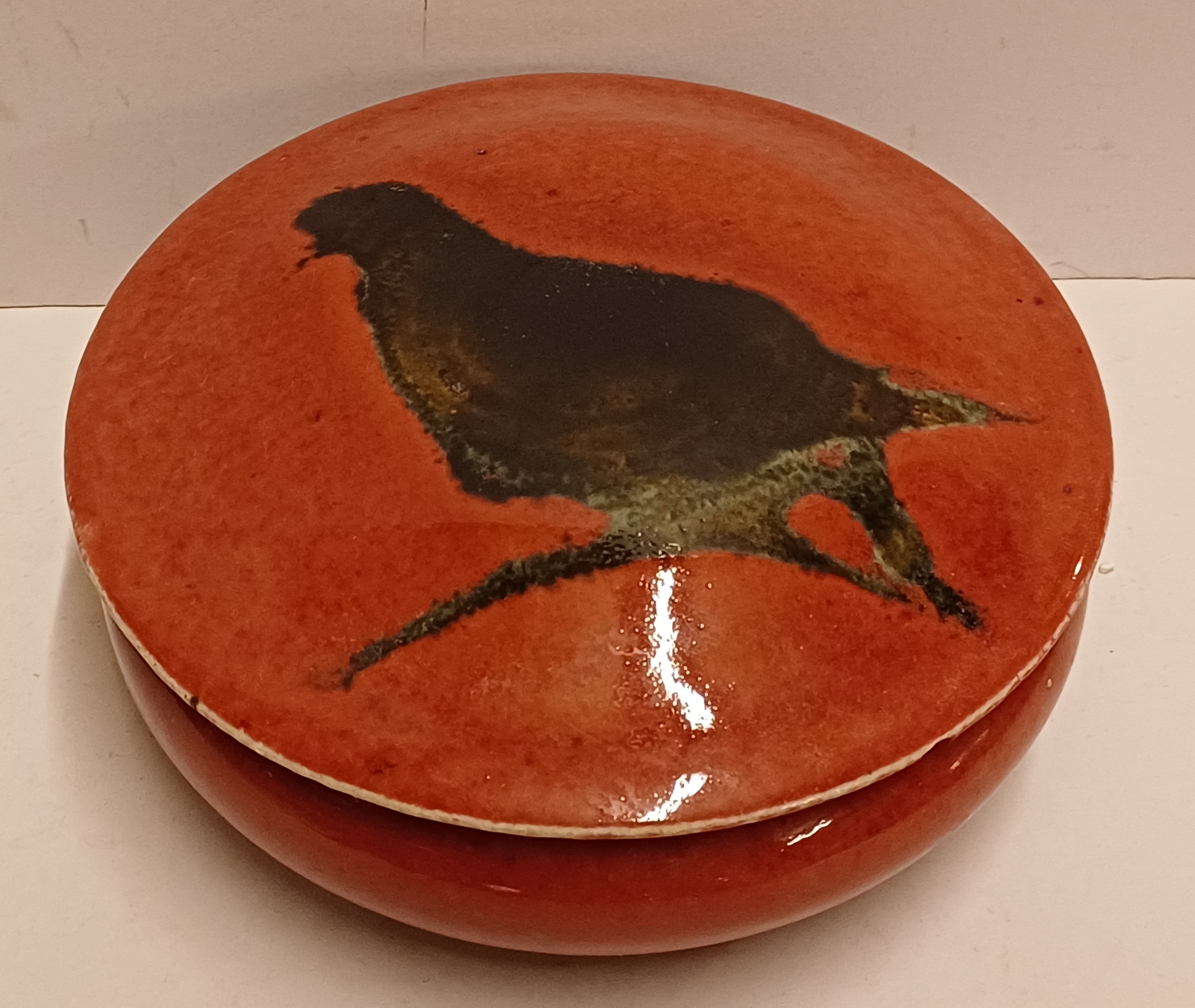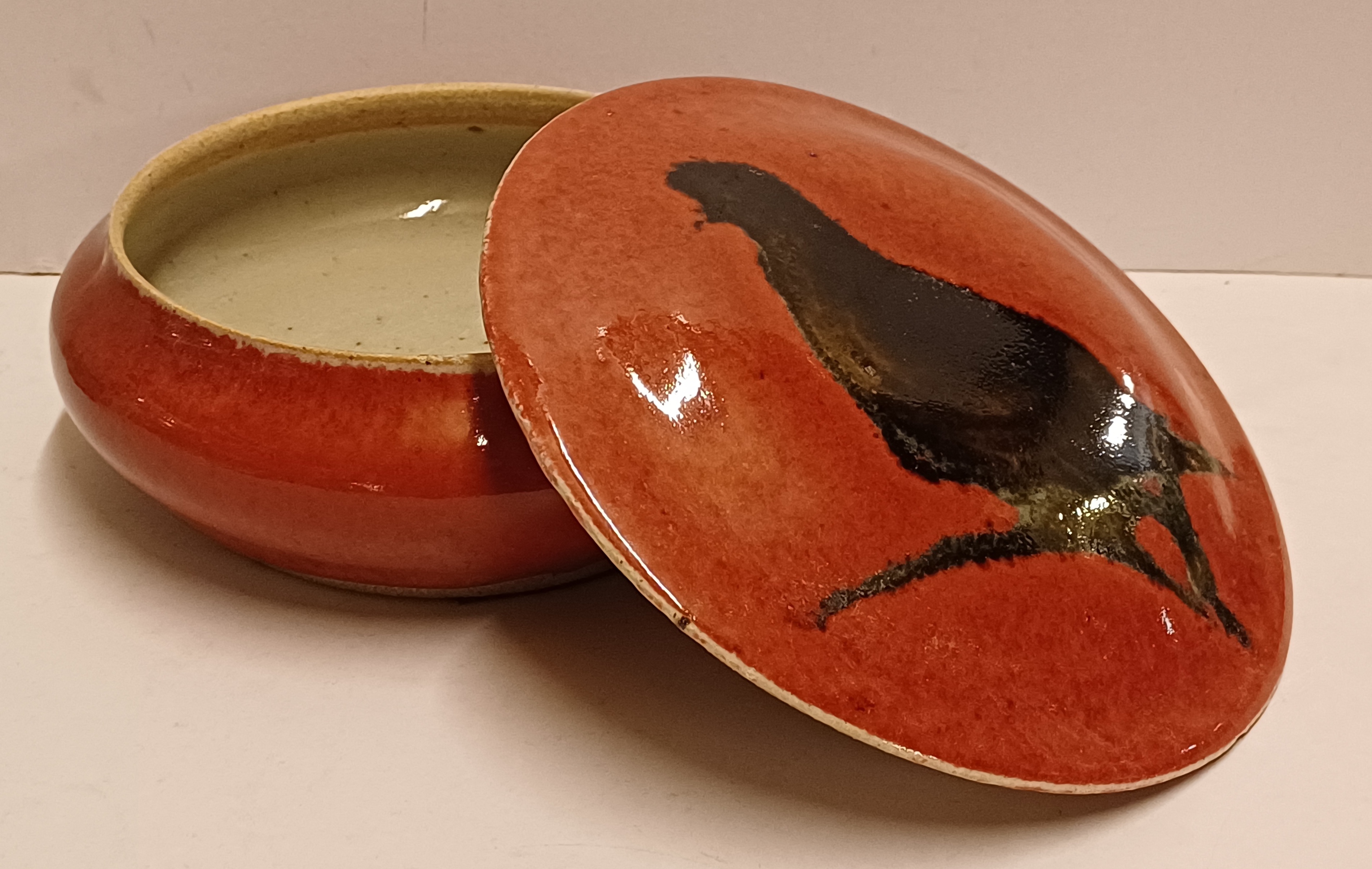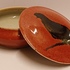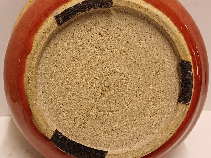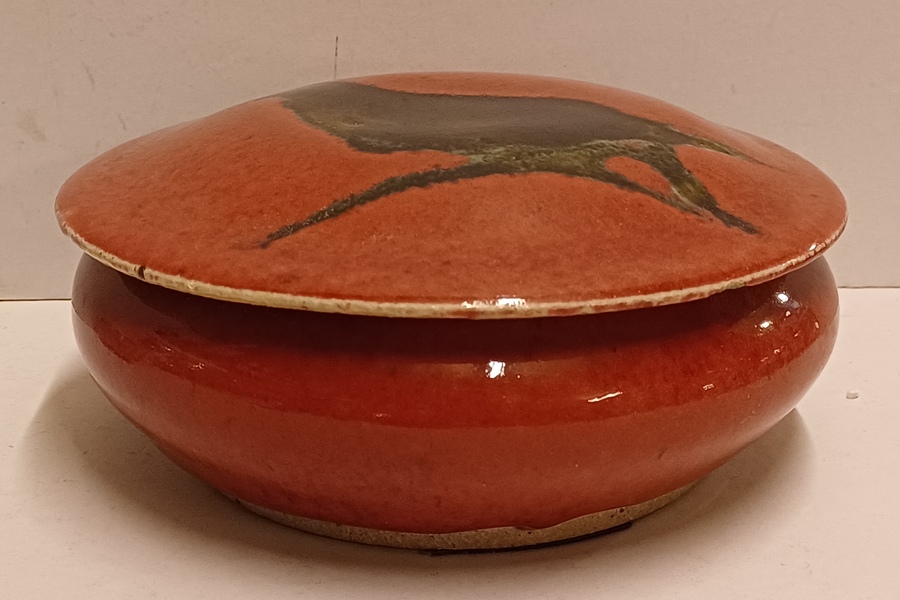 Caja con tapa de gres con esmalte Sang de Boeuf con mancha oscura. No firmado.