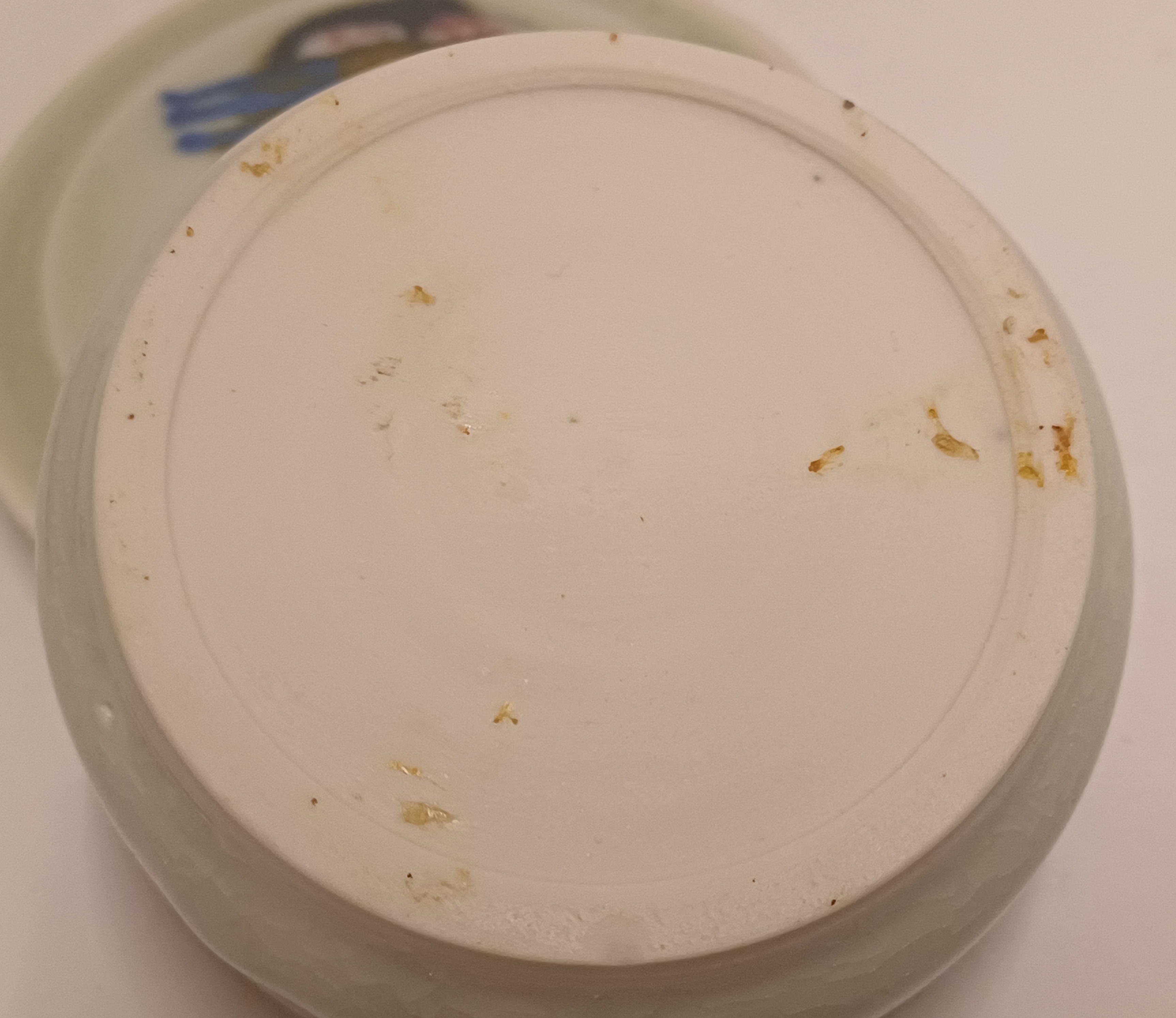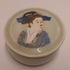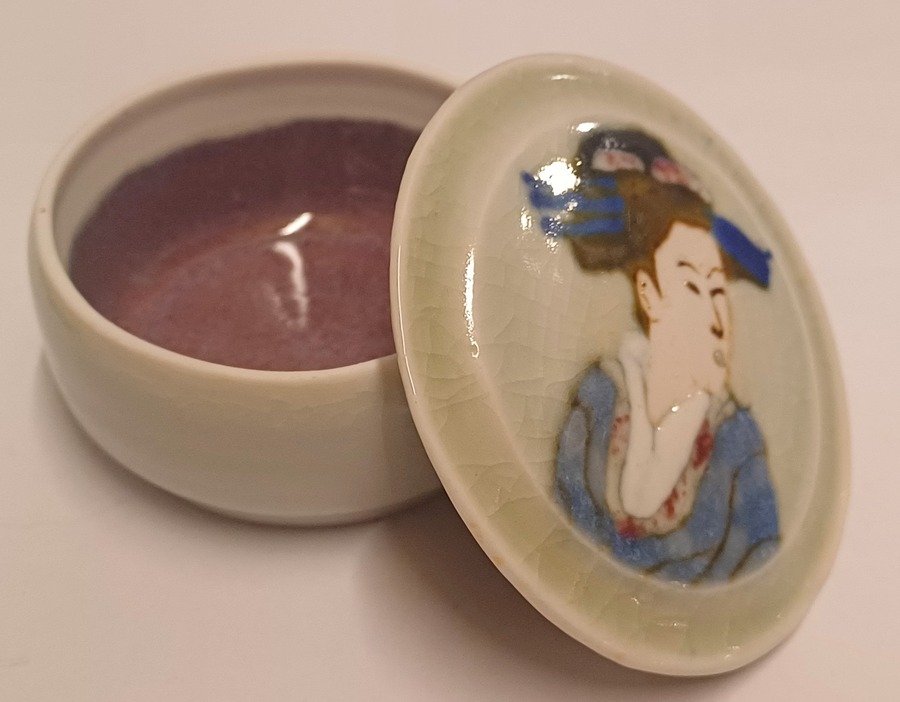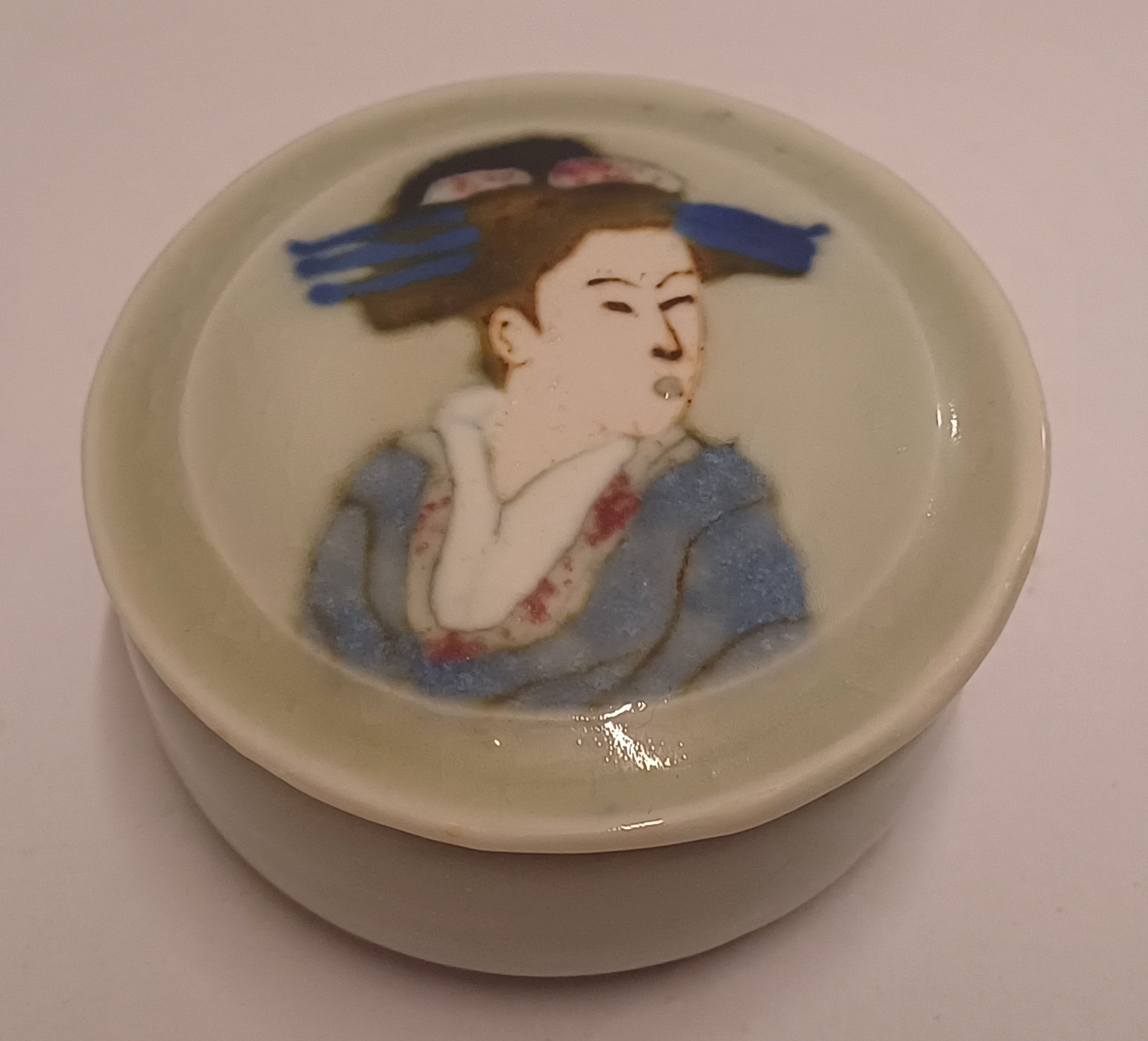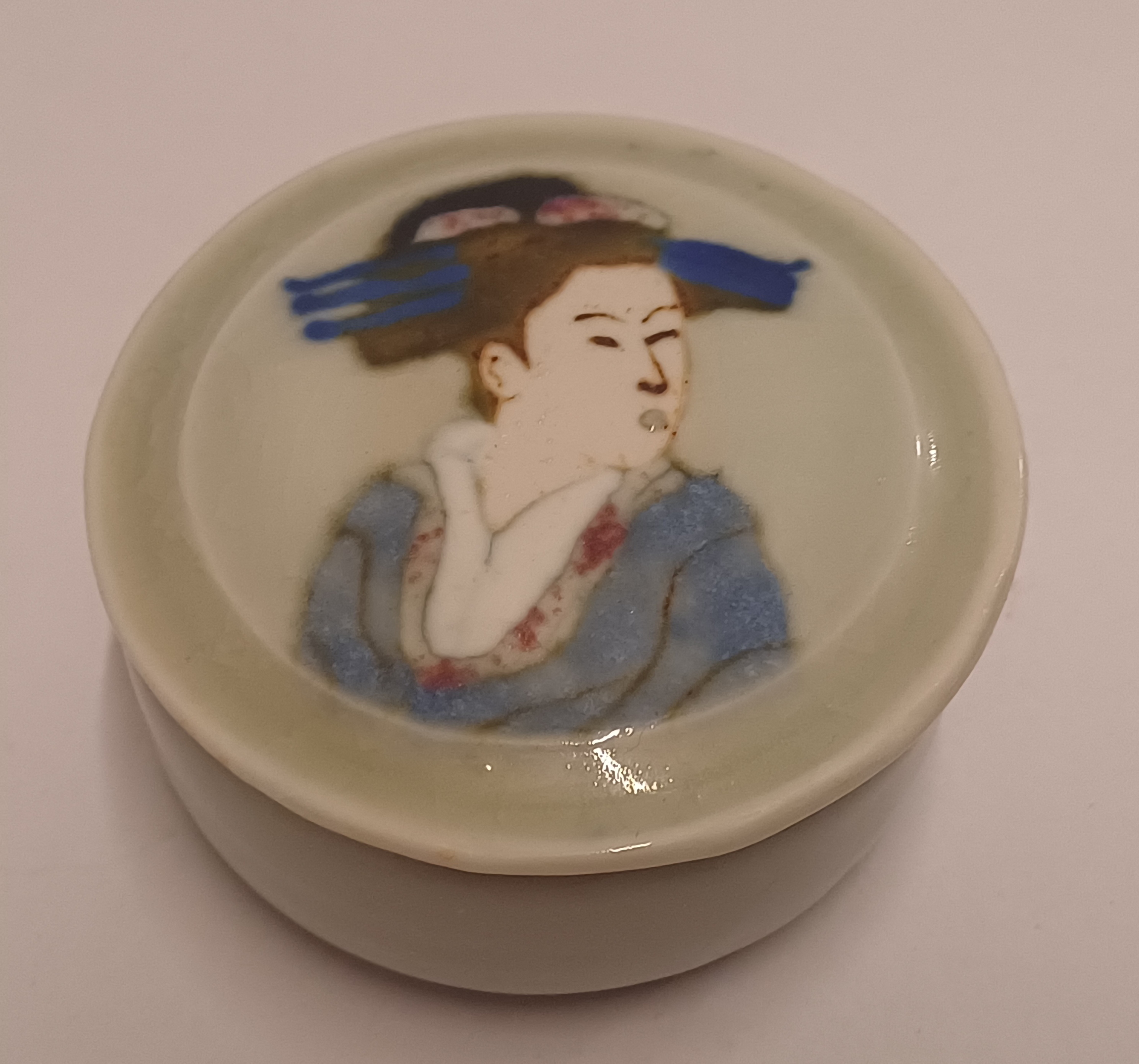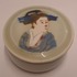 Klein steengoed dekseldoosje met decor van Geisha op de deksel. Onderzijde niet gesigneerd.