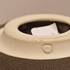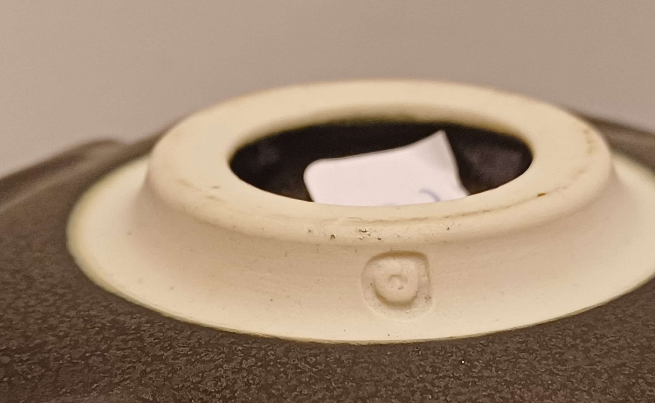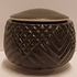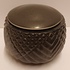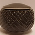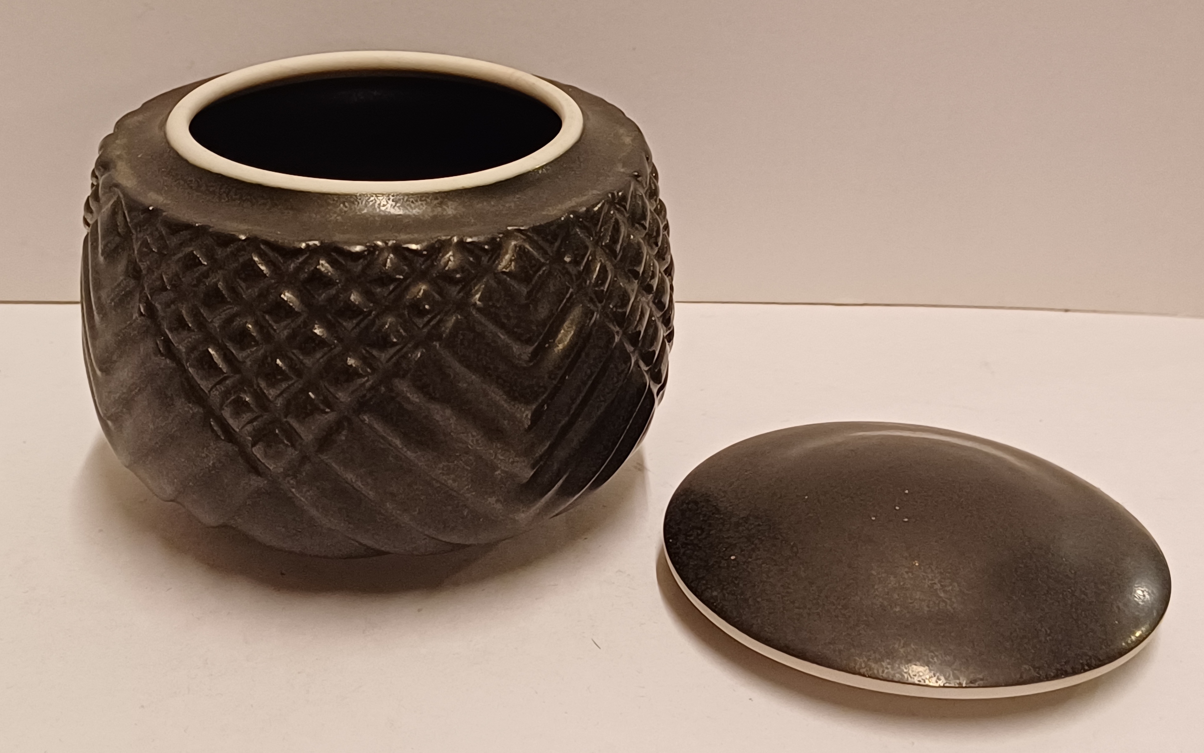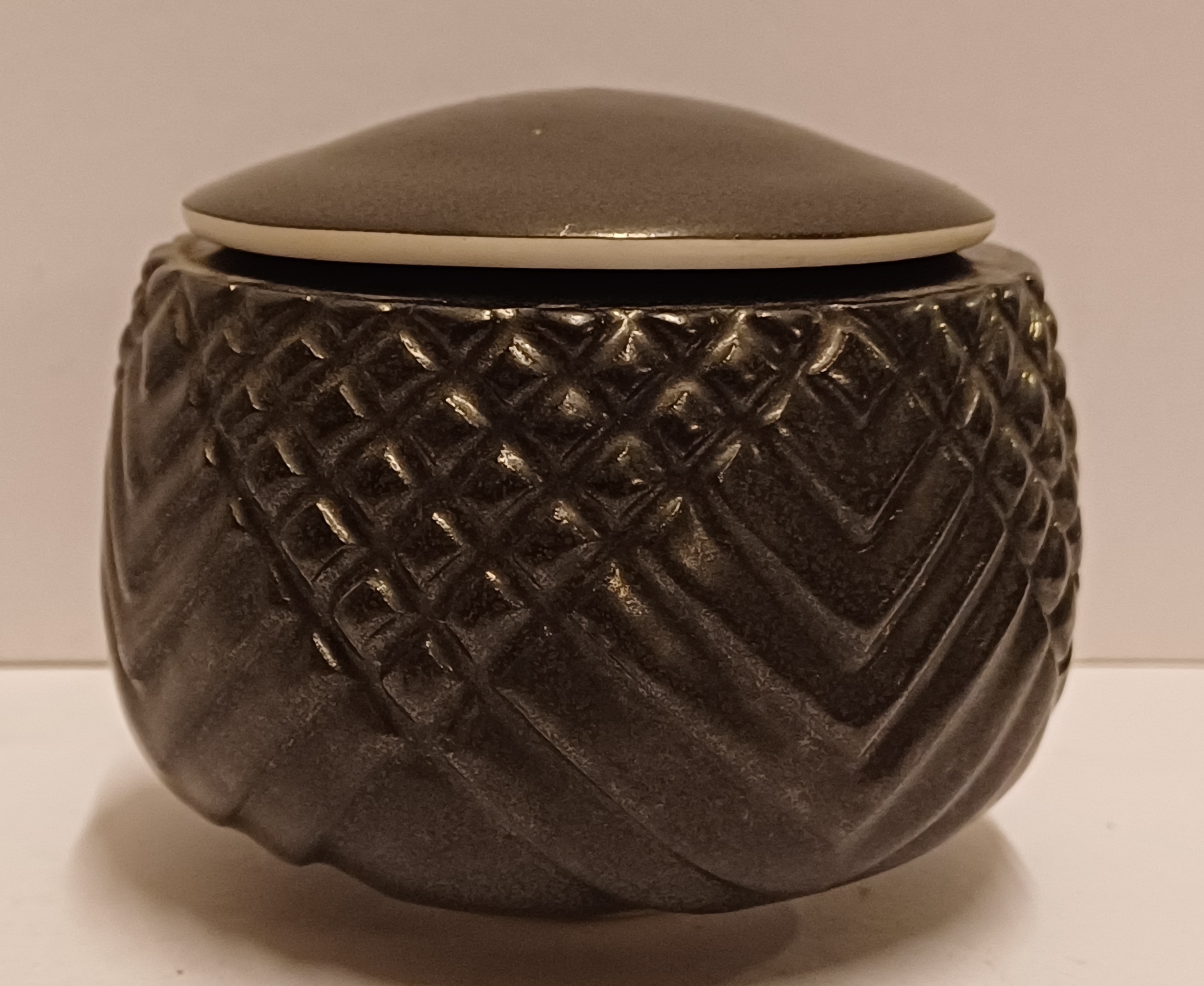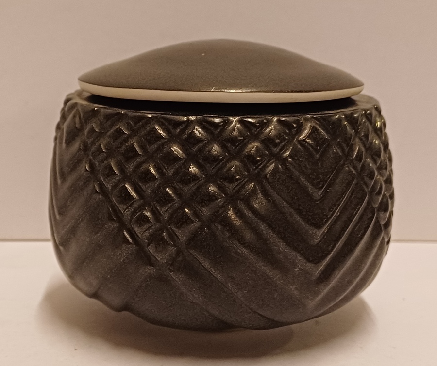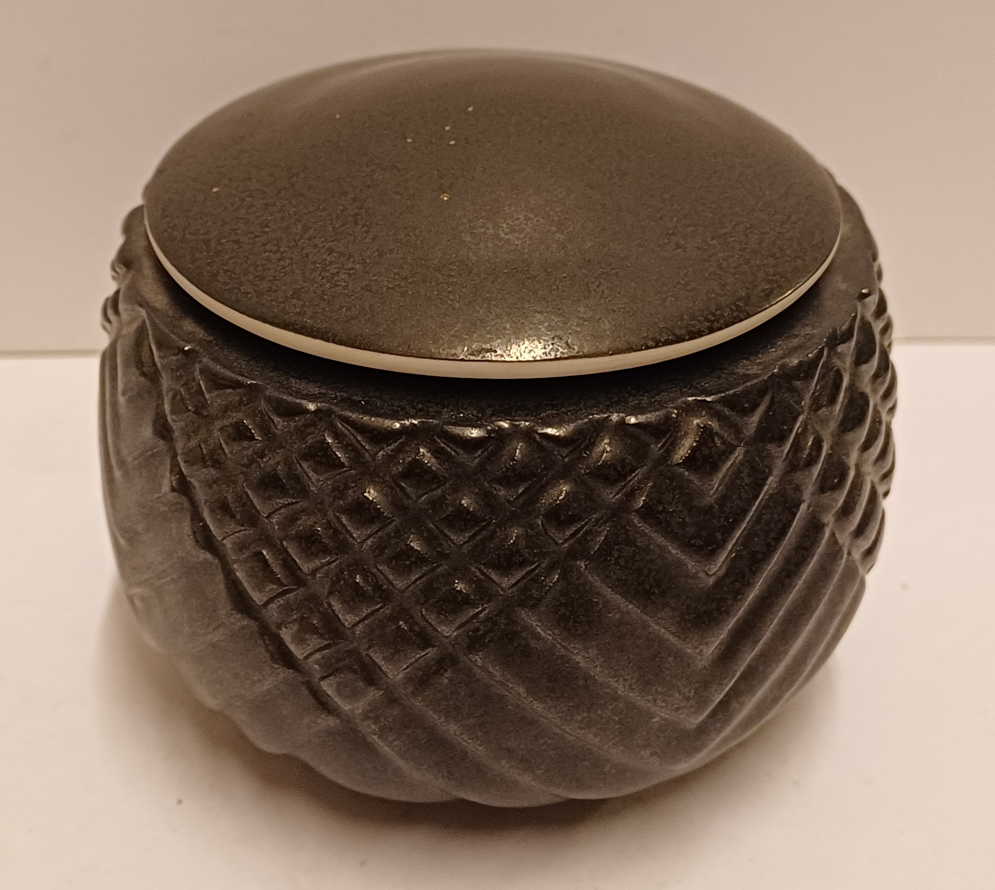 Steengoed dekseldoos met relief decor en zwarte glazuur. Zijkant met kunstenaars signatuur.