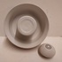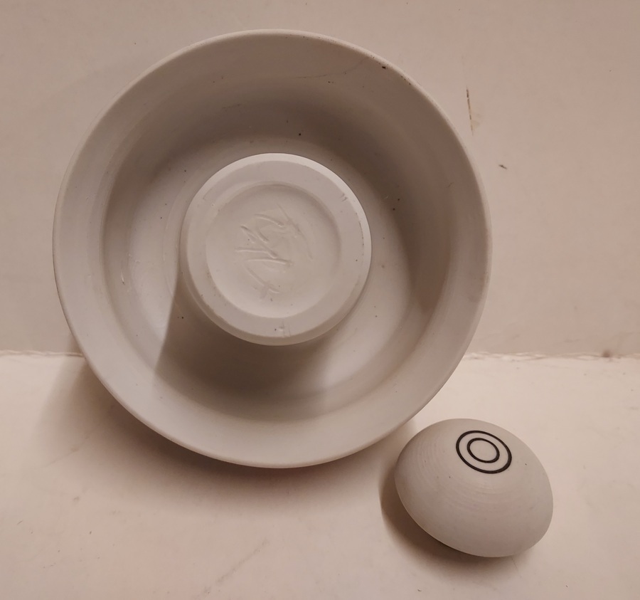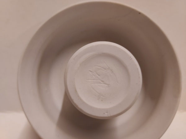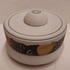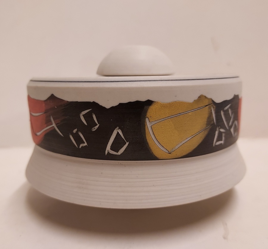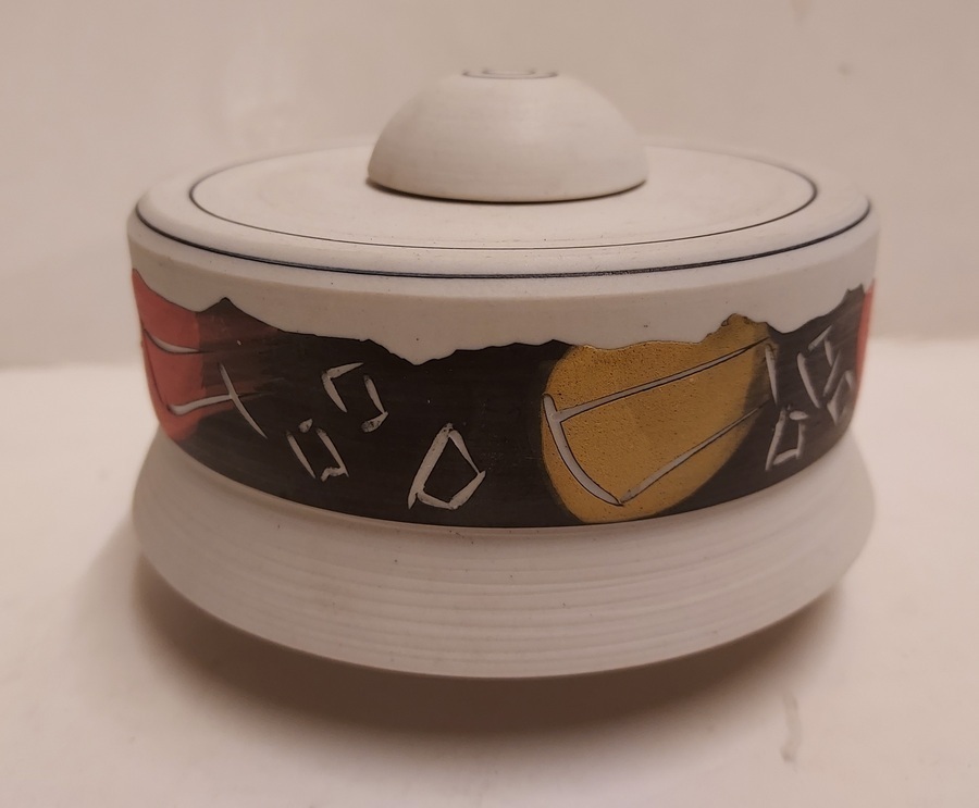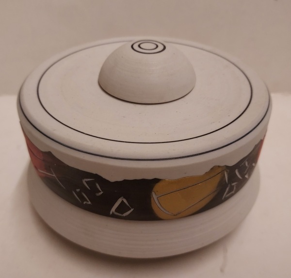 Olla de porcelana con tapa y decoración abstracta multicolor. Parte inferior con monograma.