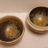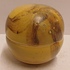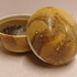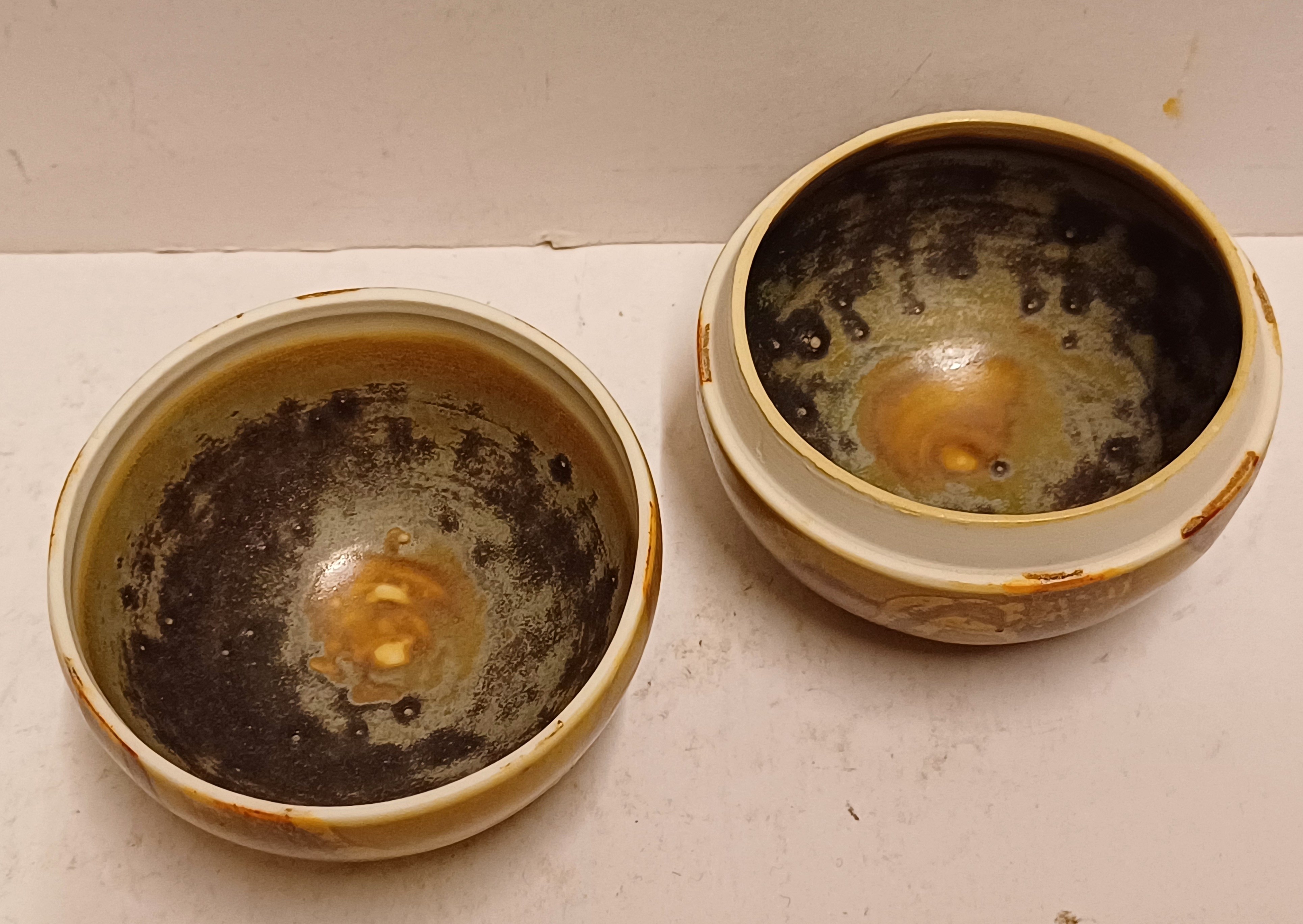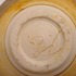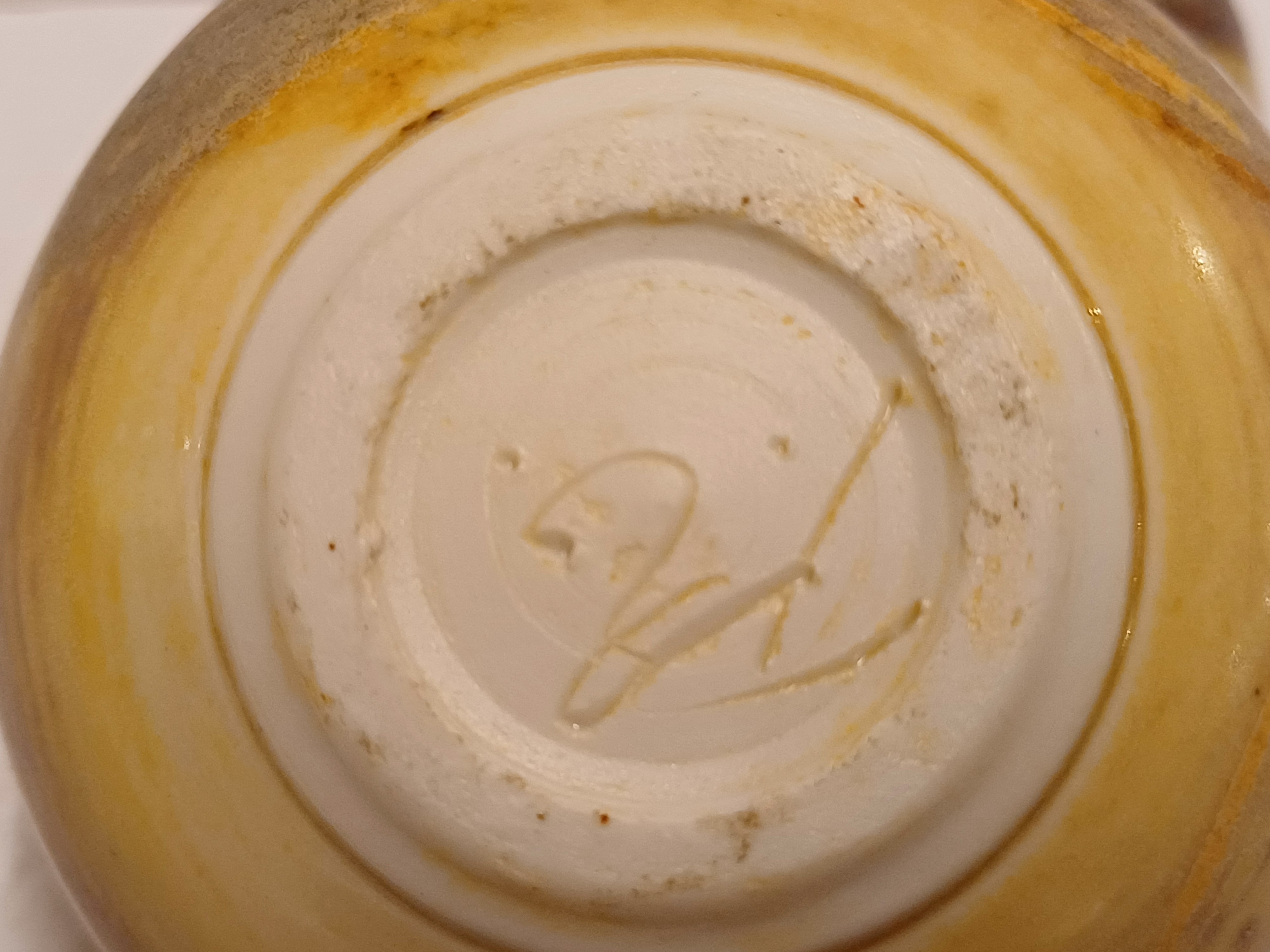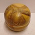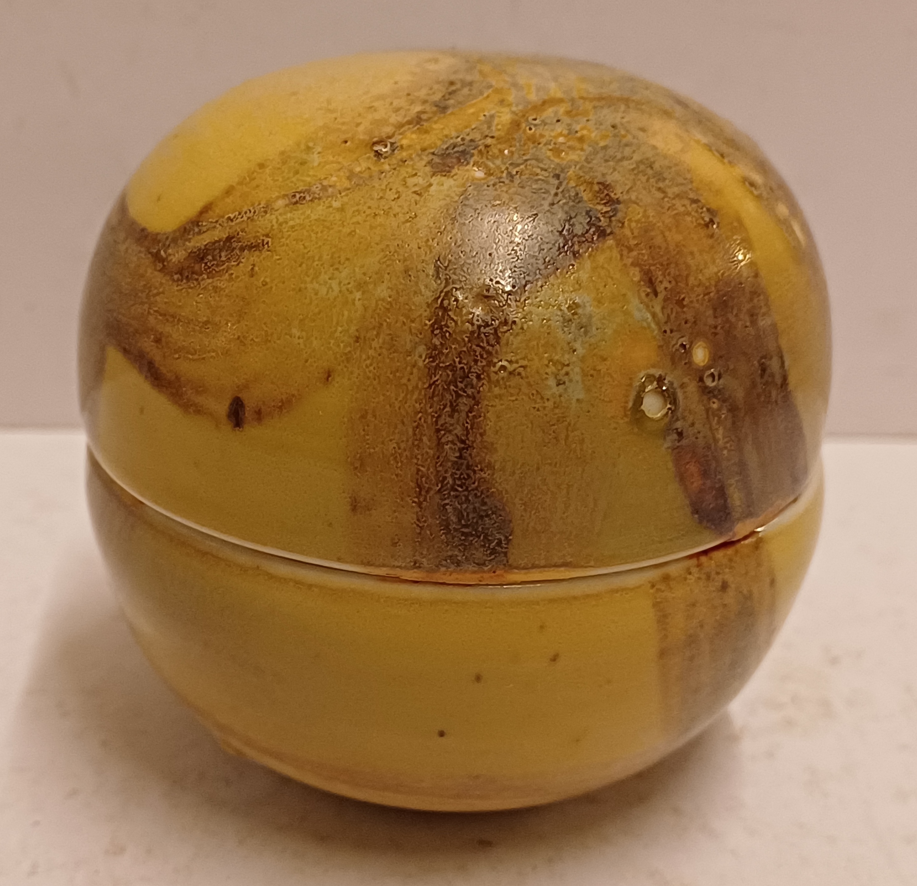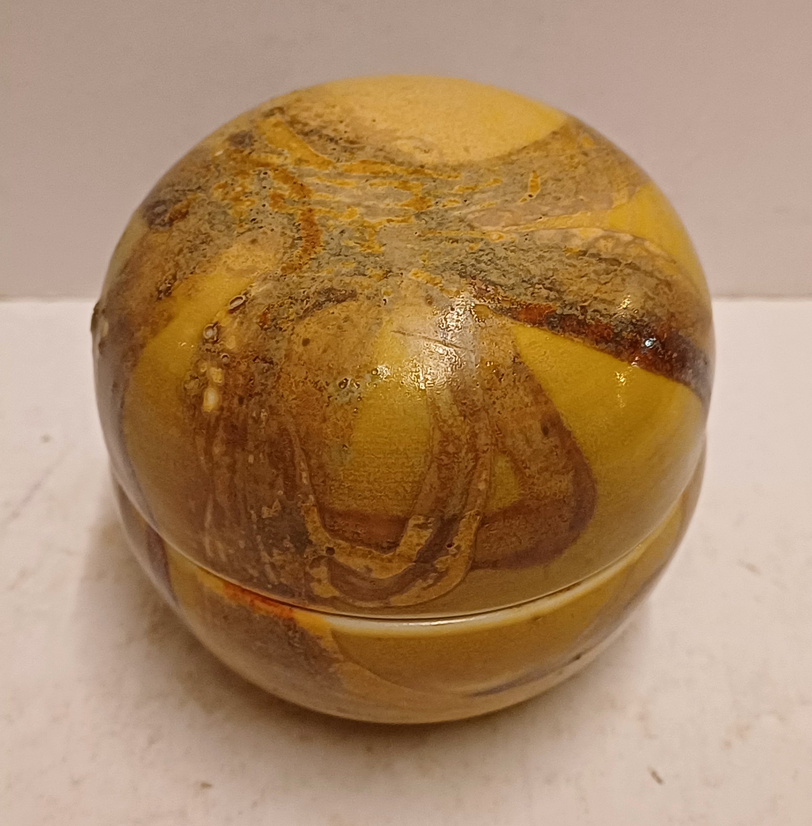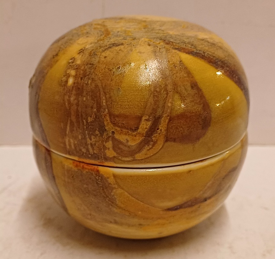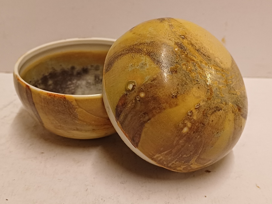 Caja redonda de cerámica con tapa, esmaltada en beige con manchas marrones. Parte inferior con firma.