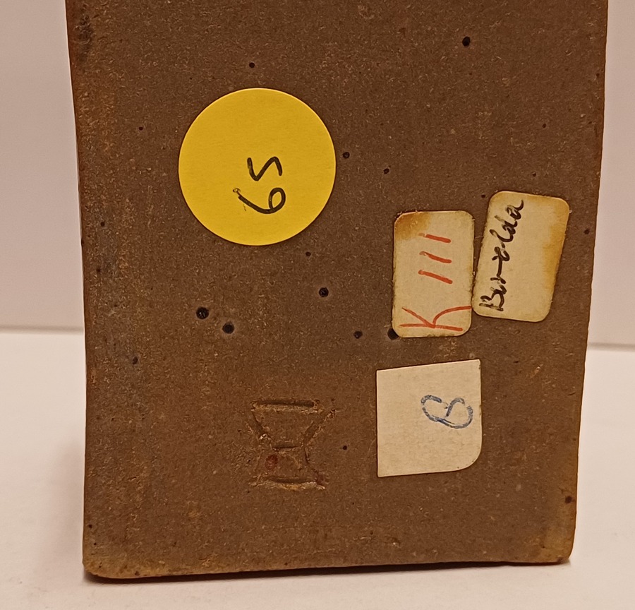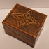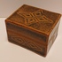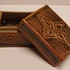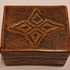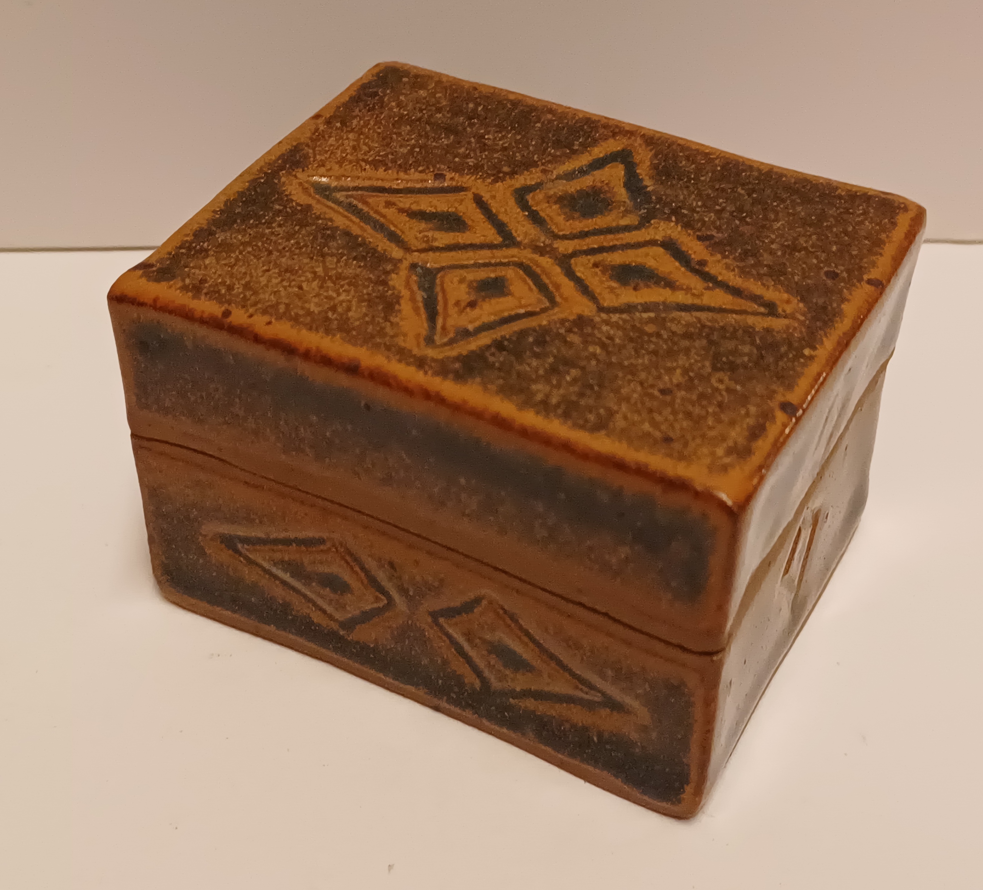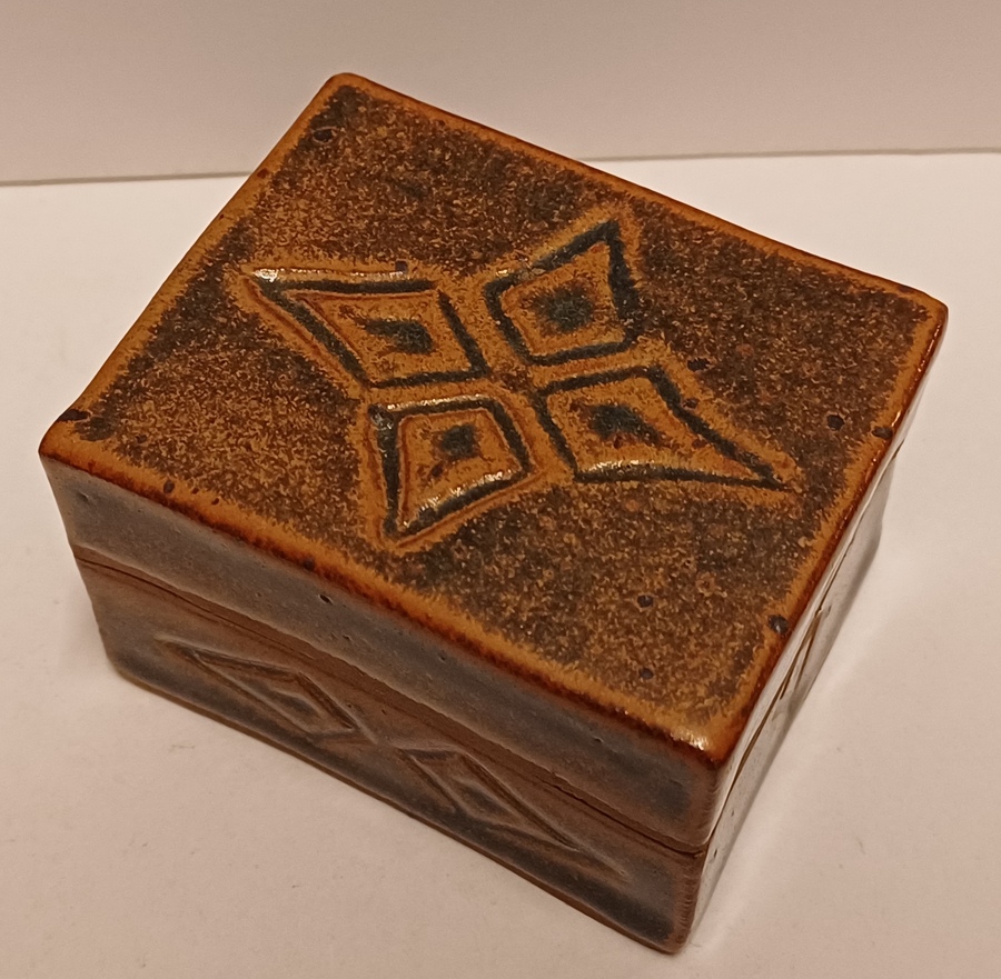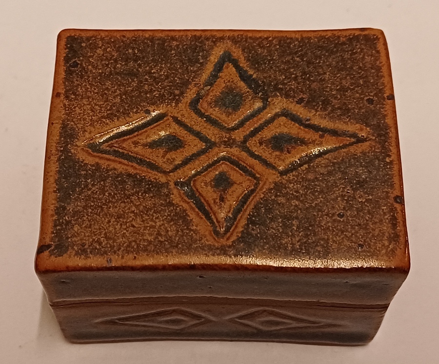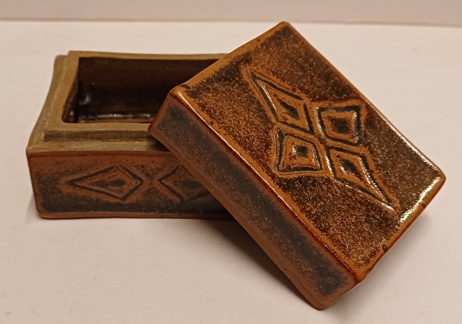 Steengoed rechthoekig dekseldoosje met bruine tenmoku glazuur en ingekerfde decoratie. Onderzijde gesigneerd