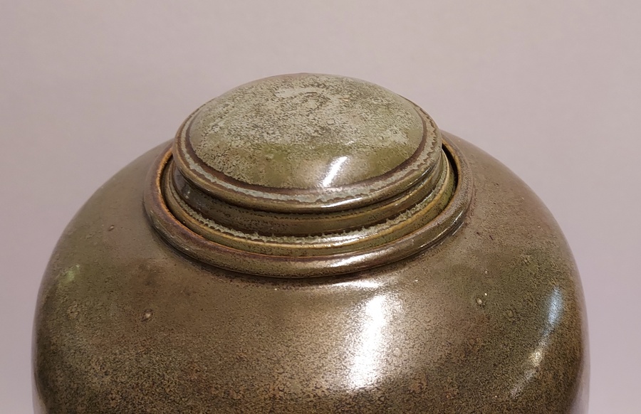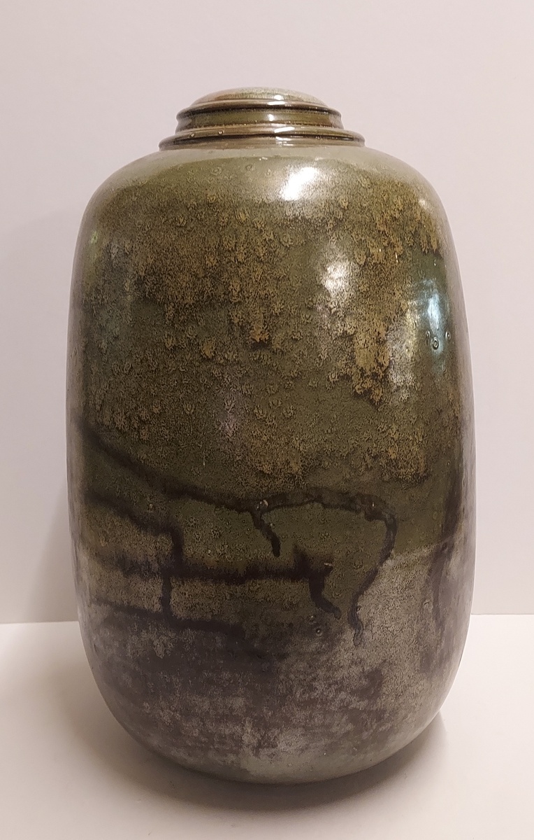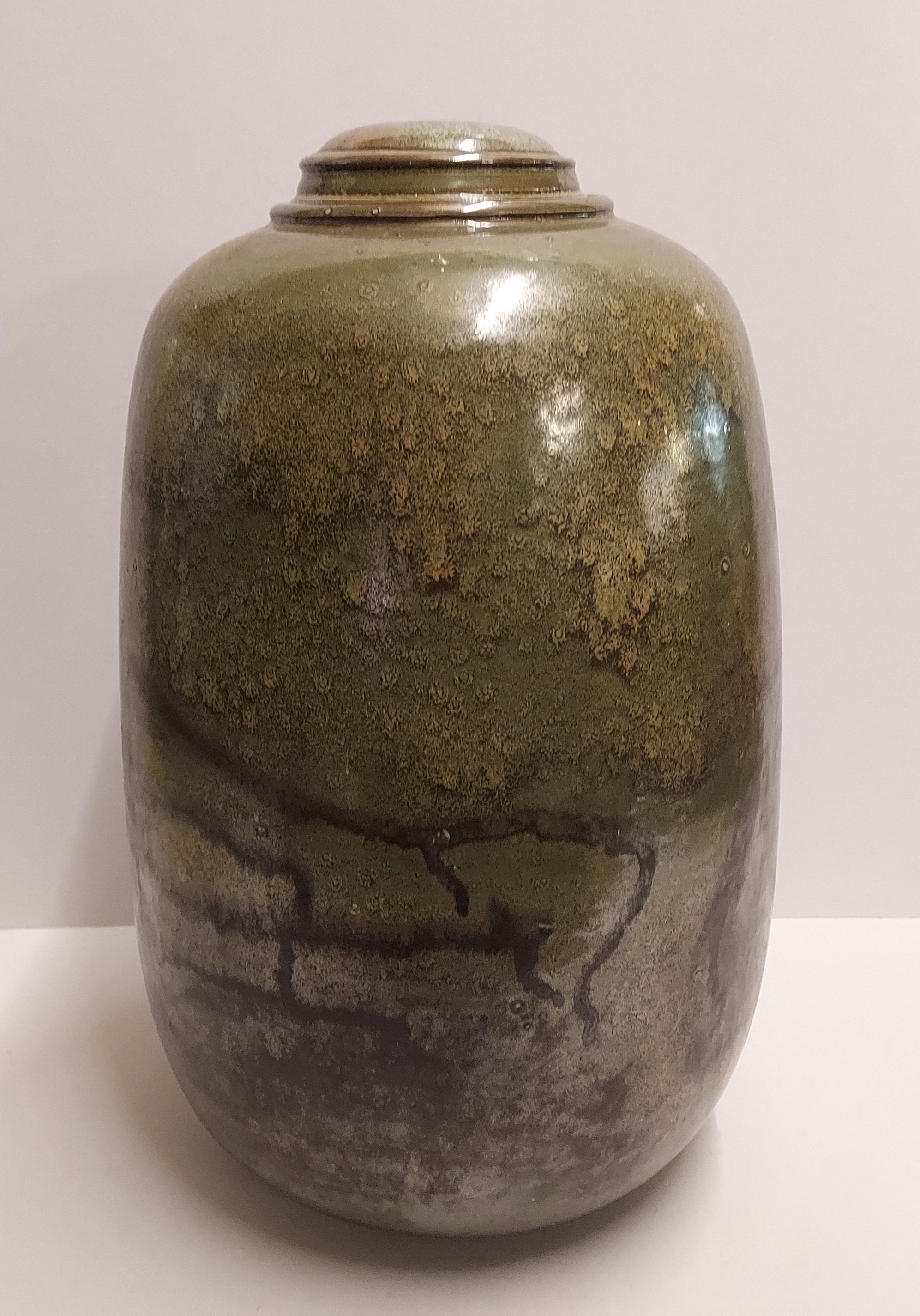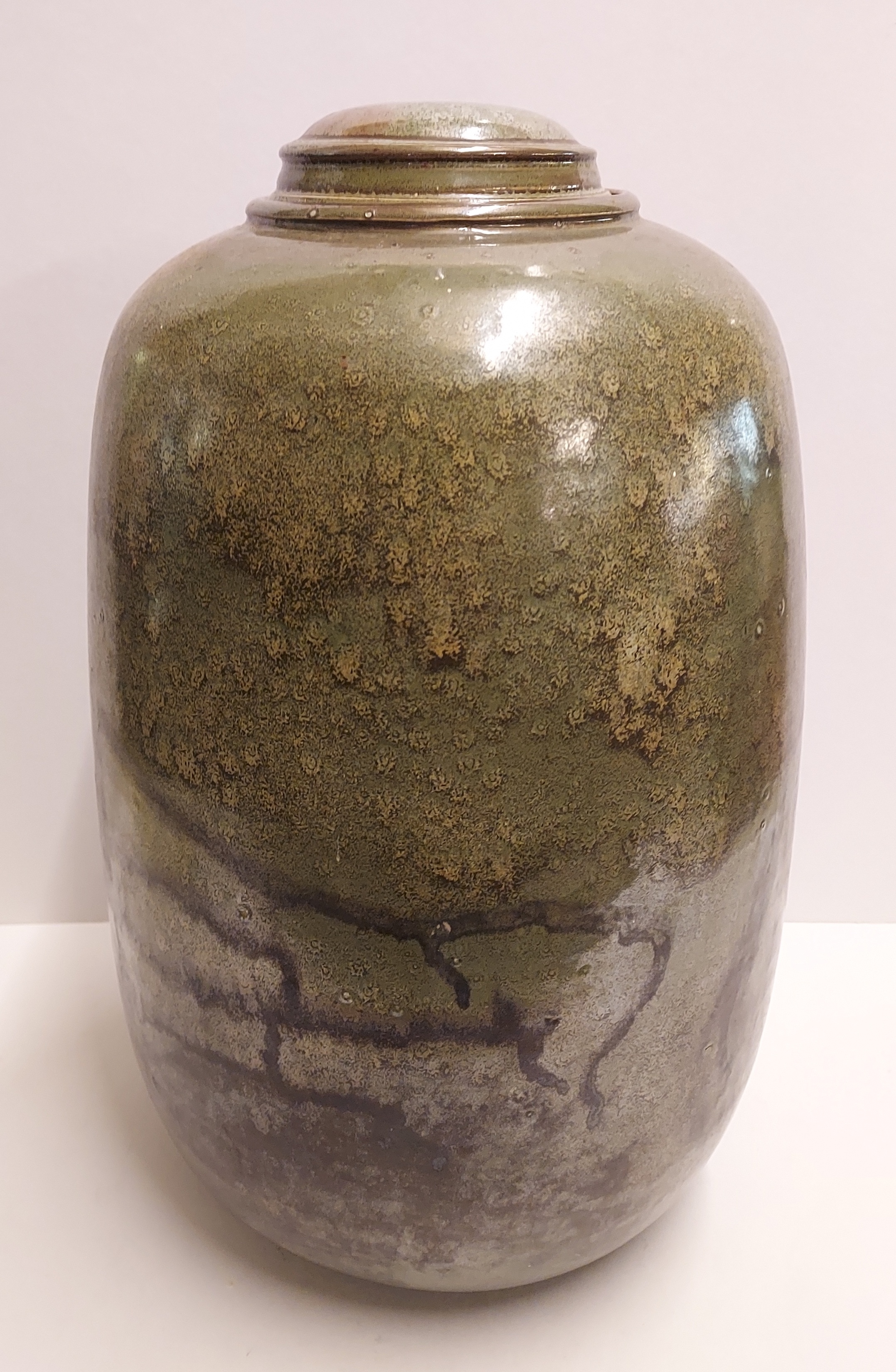 Gran olla con tapa esmaltada en verde. La parte inferior está marcada y fechada en 87.