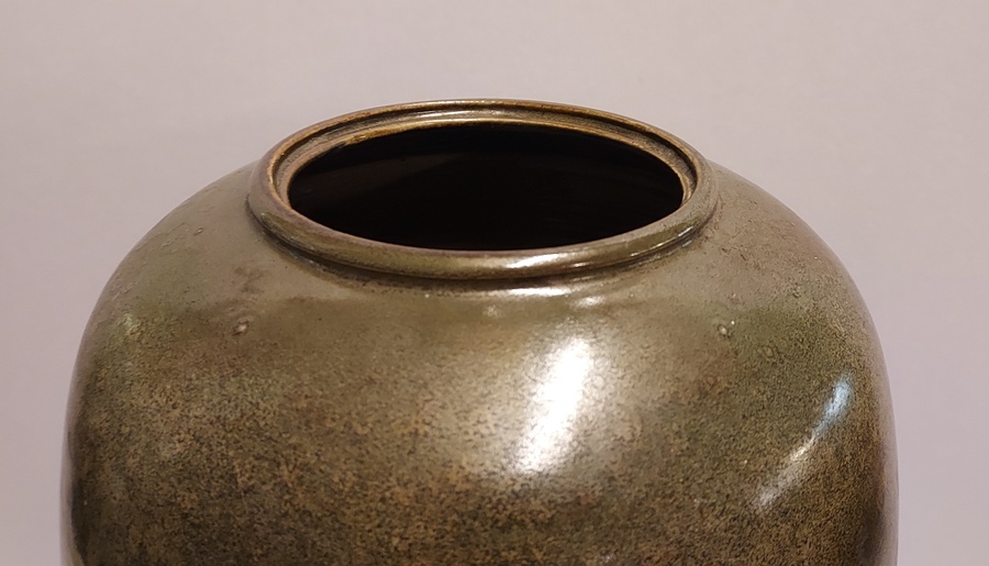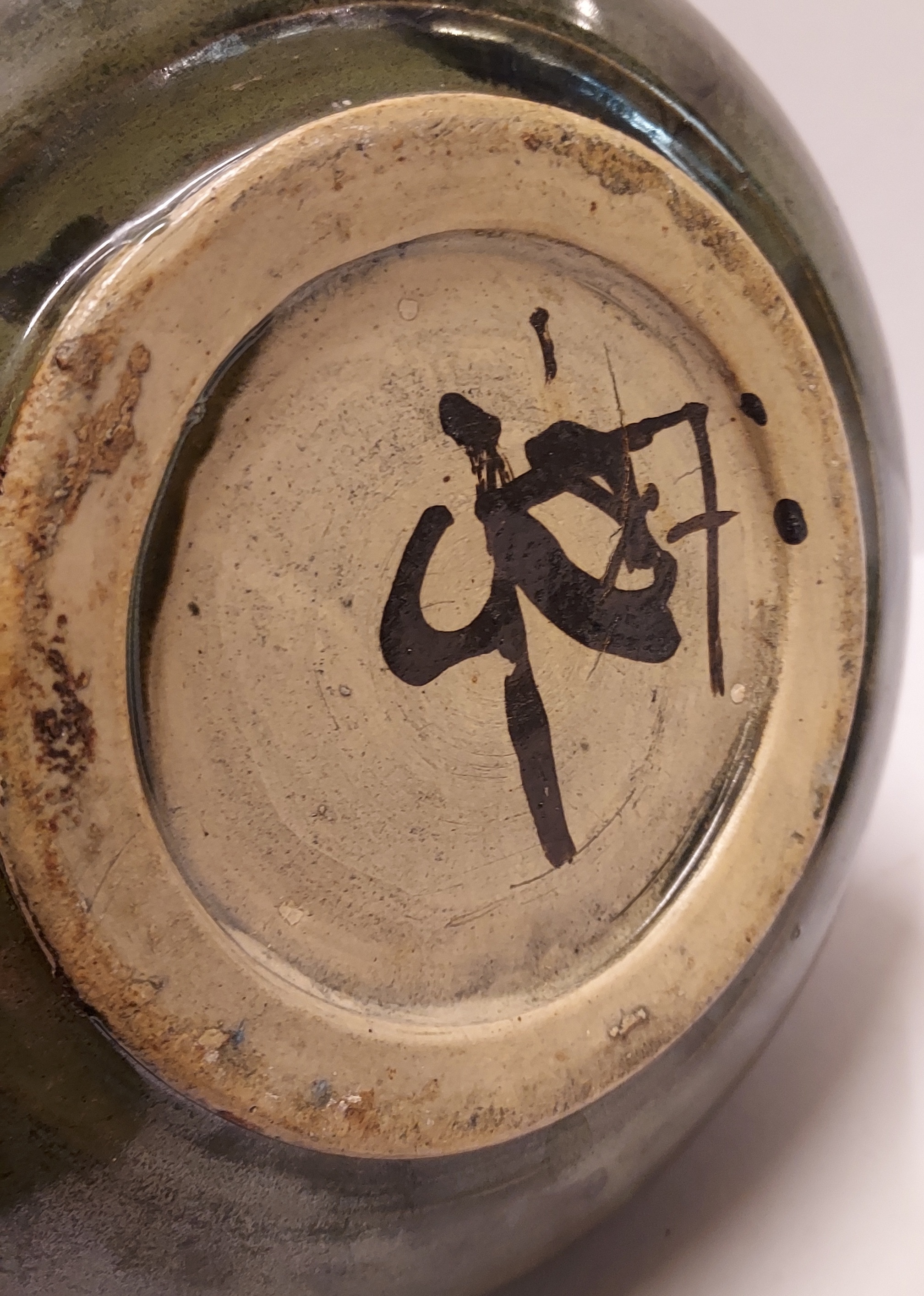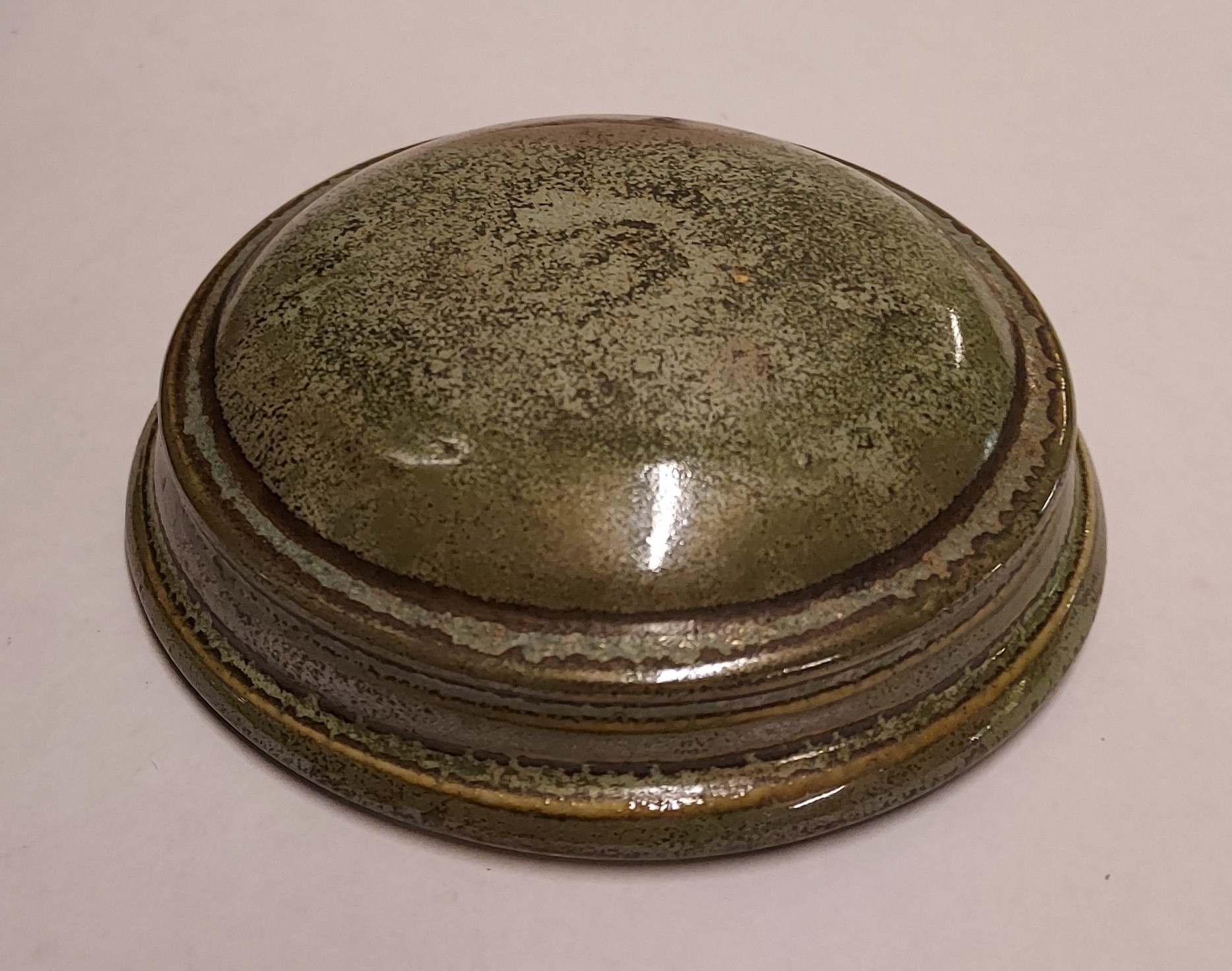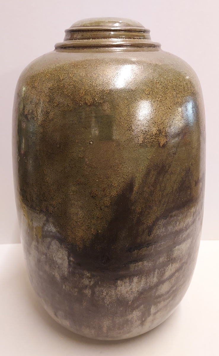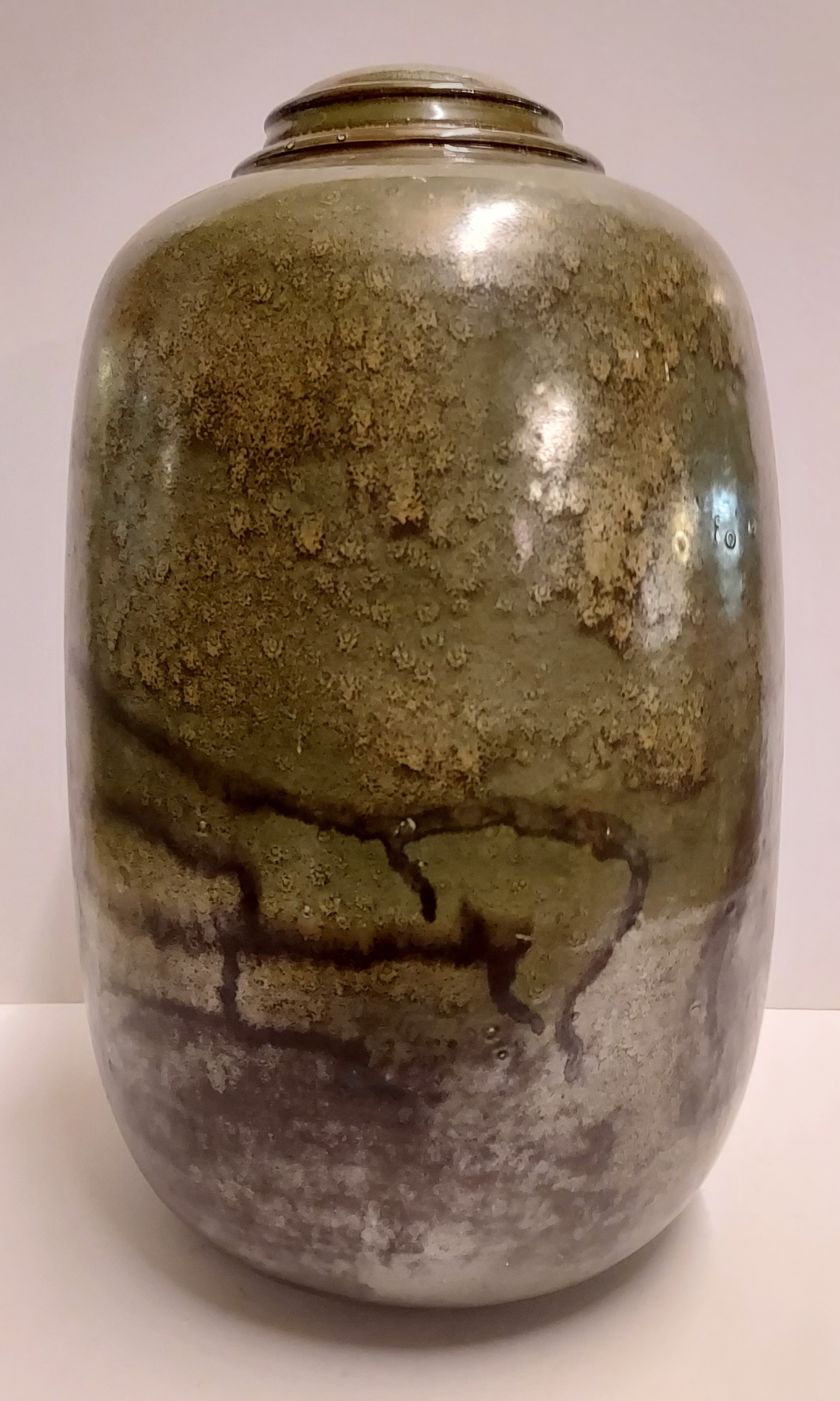 Gran olla con tapa esmaltada en verde. La parte inferior está marcada y fechada en 87.