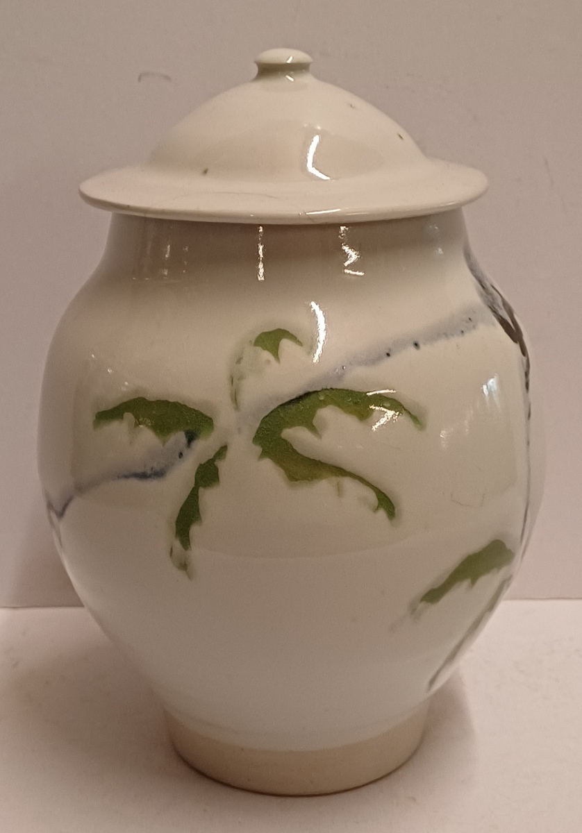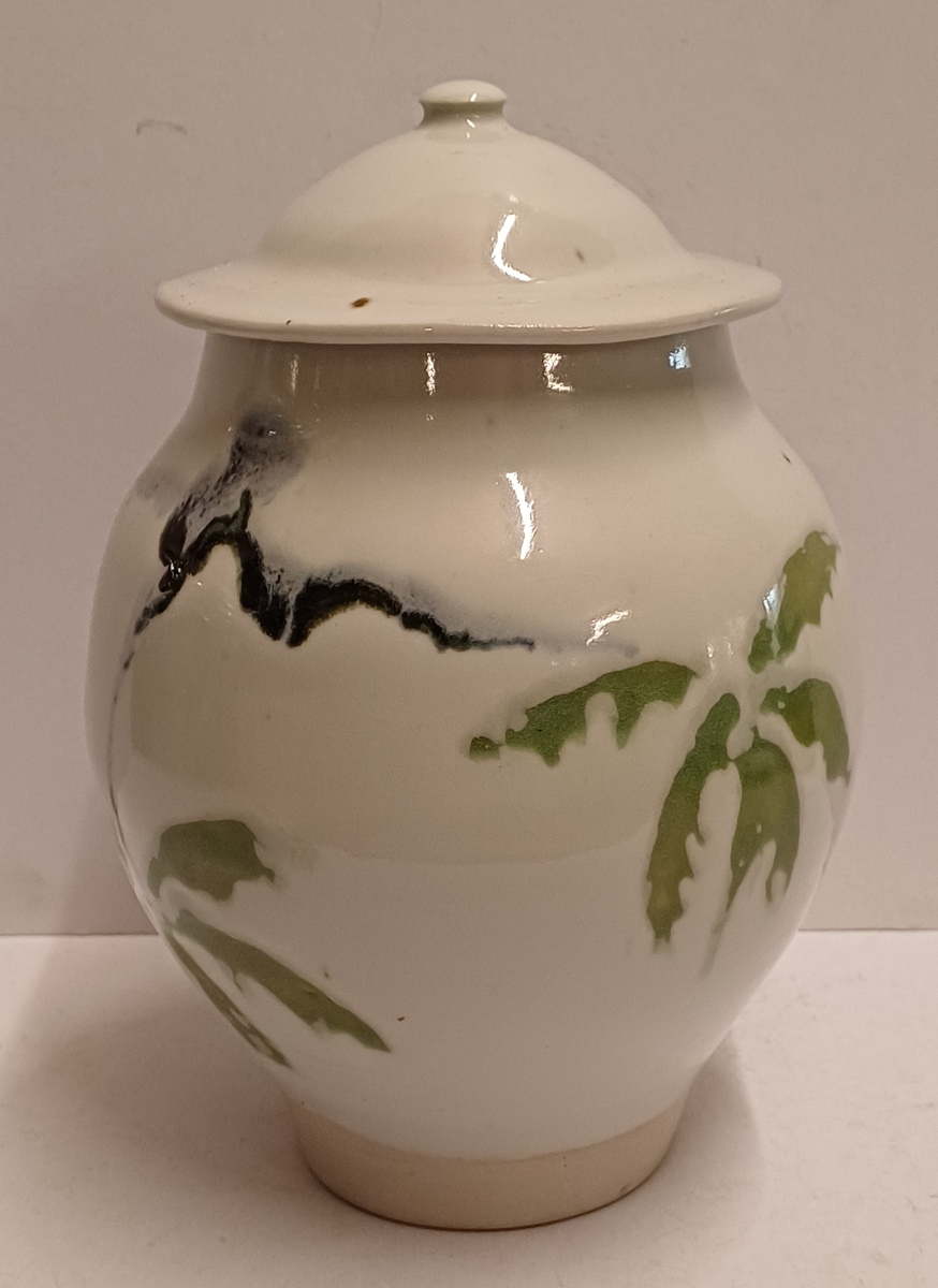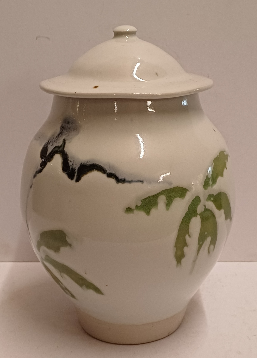 Tarro con tapa de gres con decoración en verde y negro sobre fondo blanco. Parte inferior del tarro firmada.