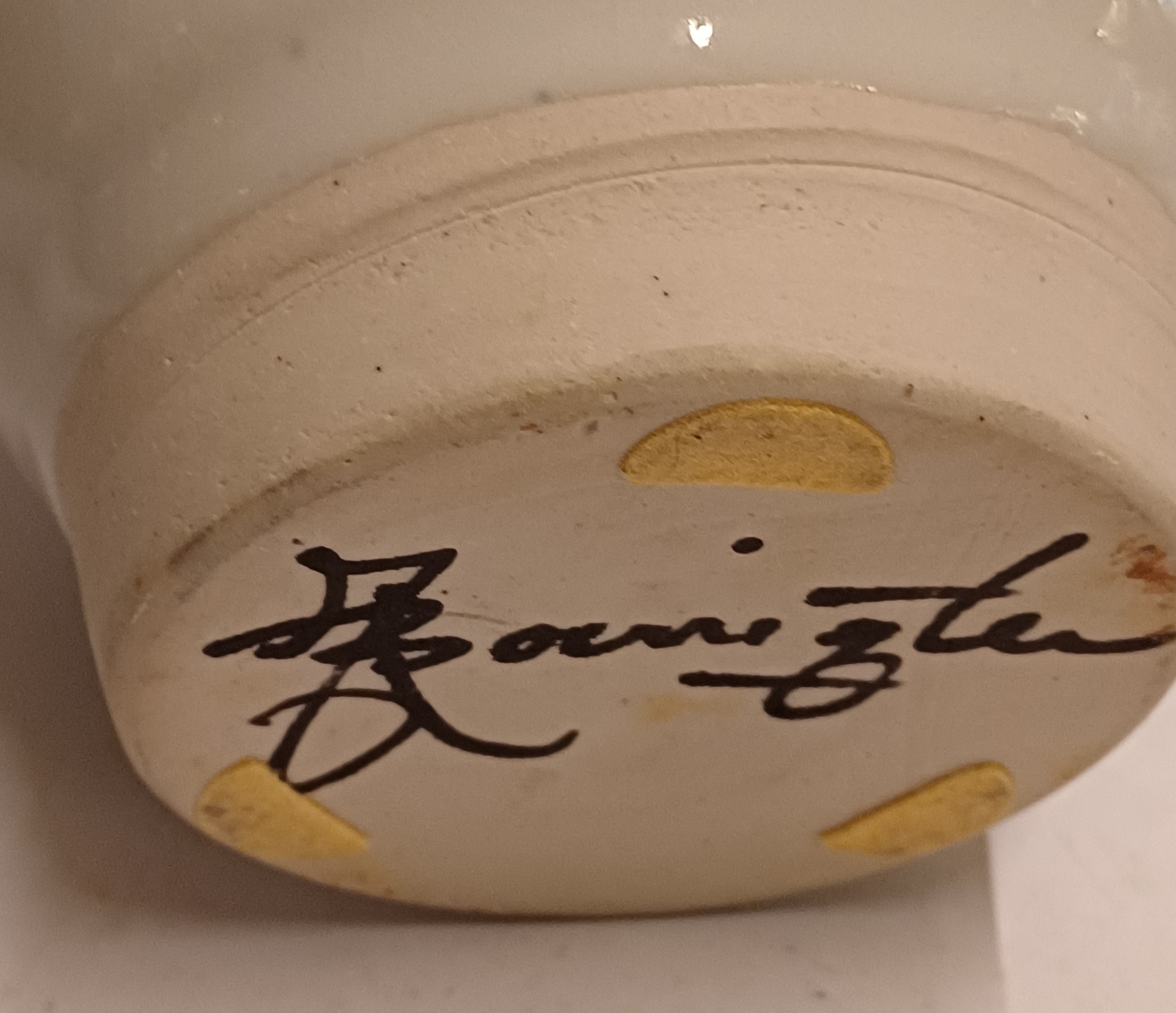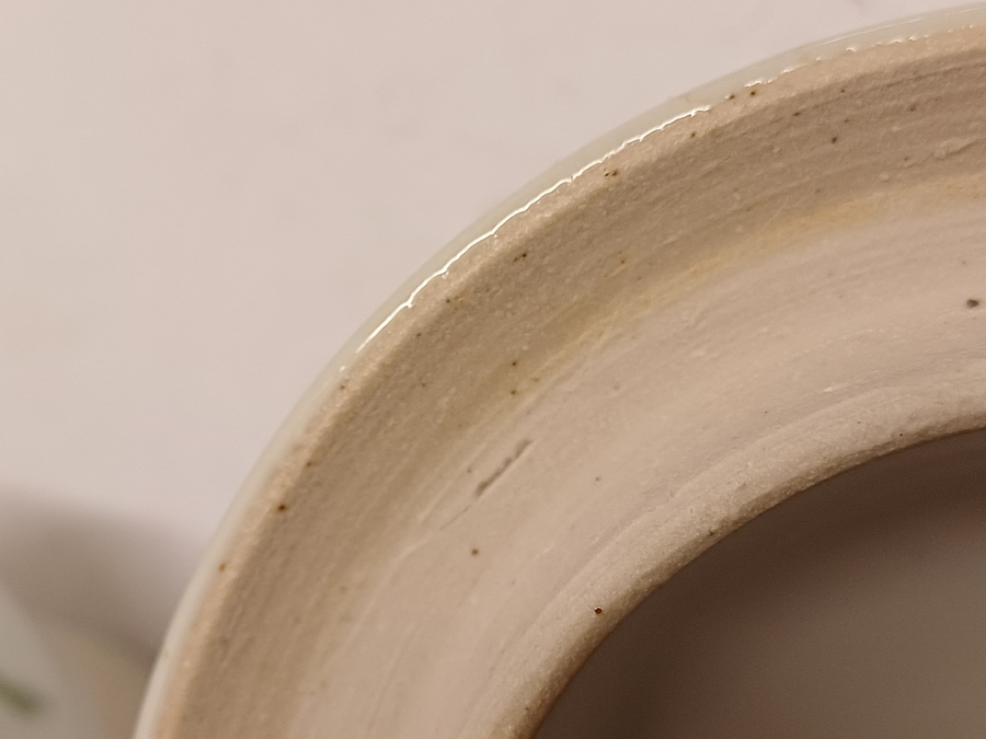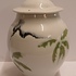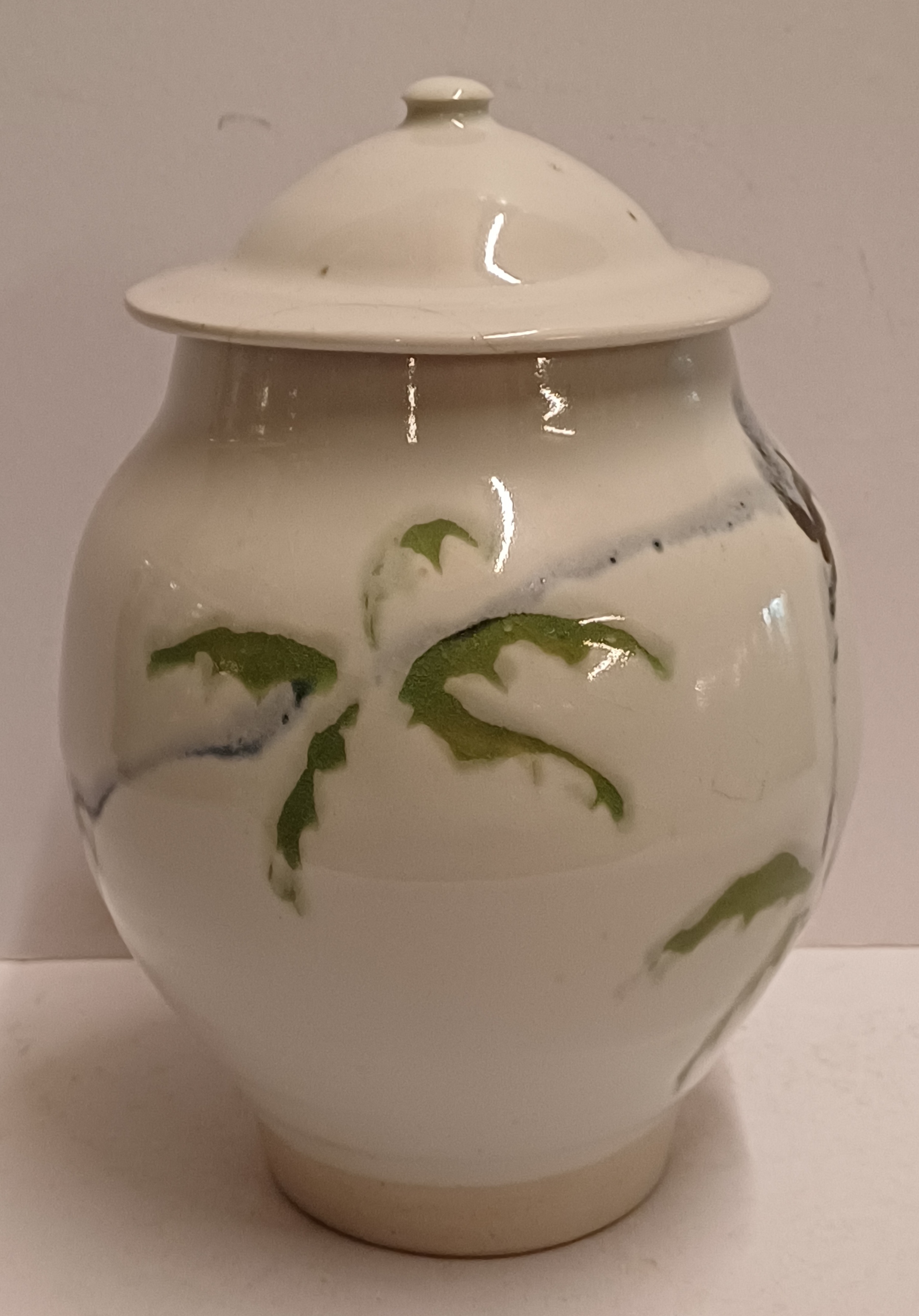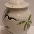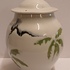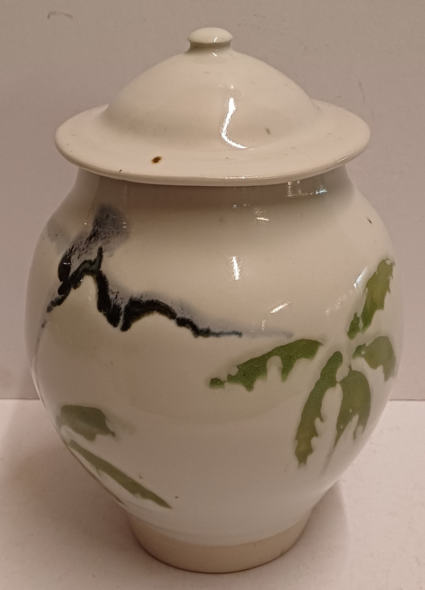 Tarro con tapa de gres con decoración en verde y negro sobre fondo blanco. Parte inferior del tarro firmada.