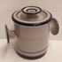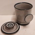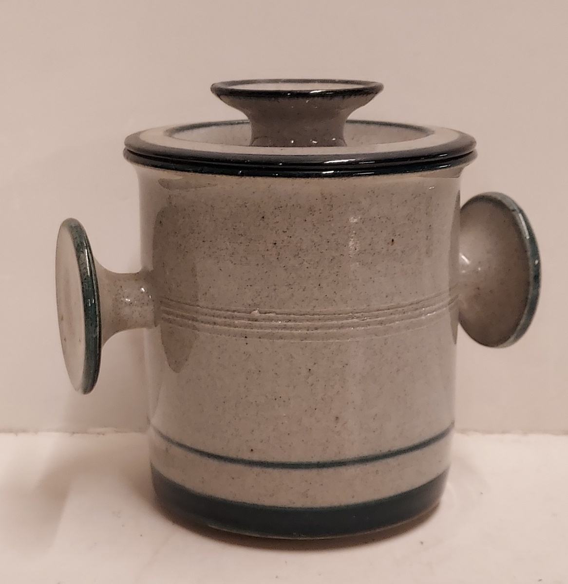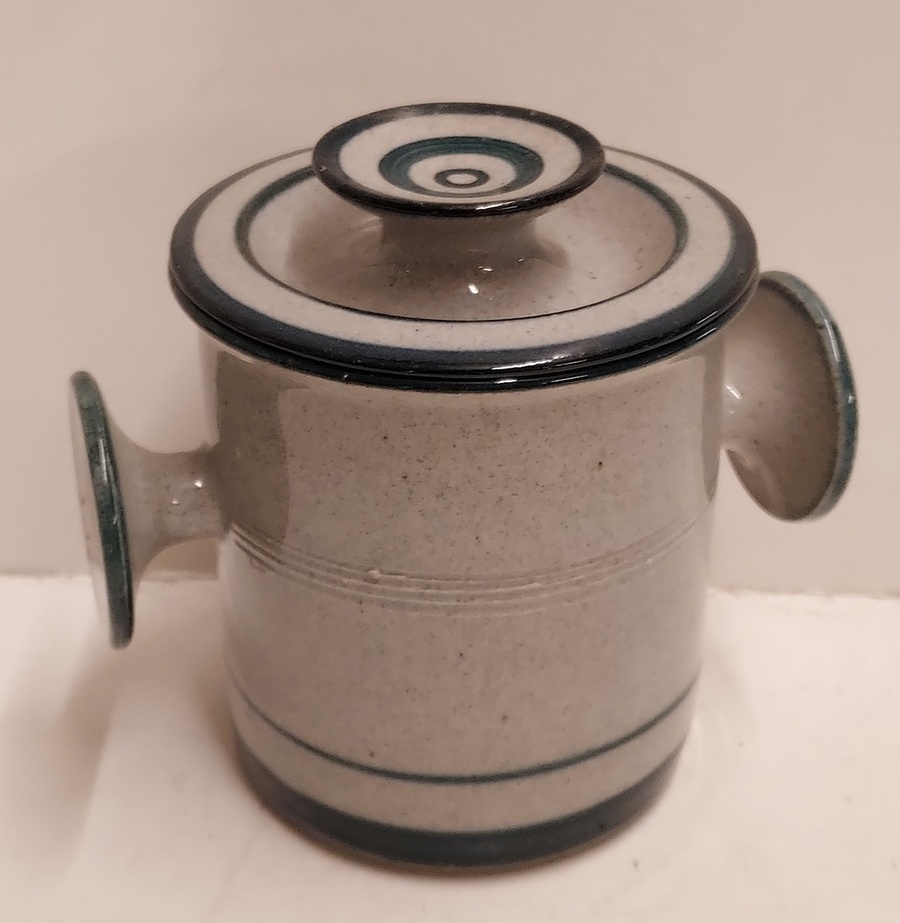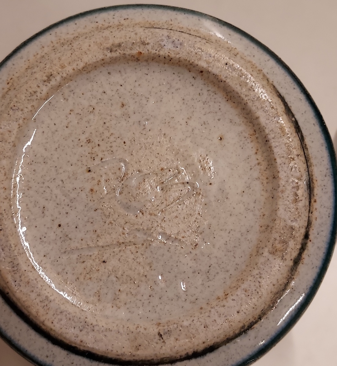 Cerámica esmaltada en gris con bandas azul oscuro. Parte inferior con monograma.