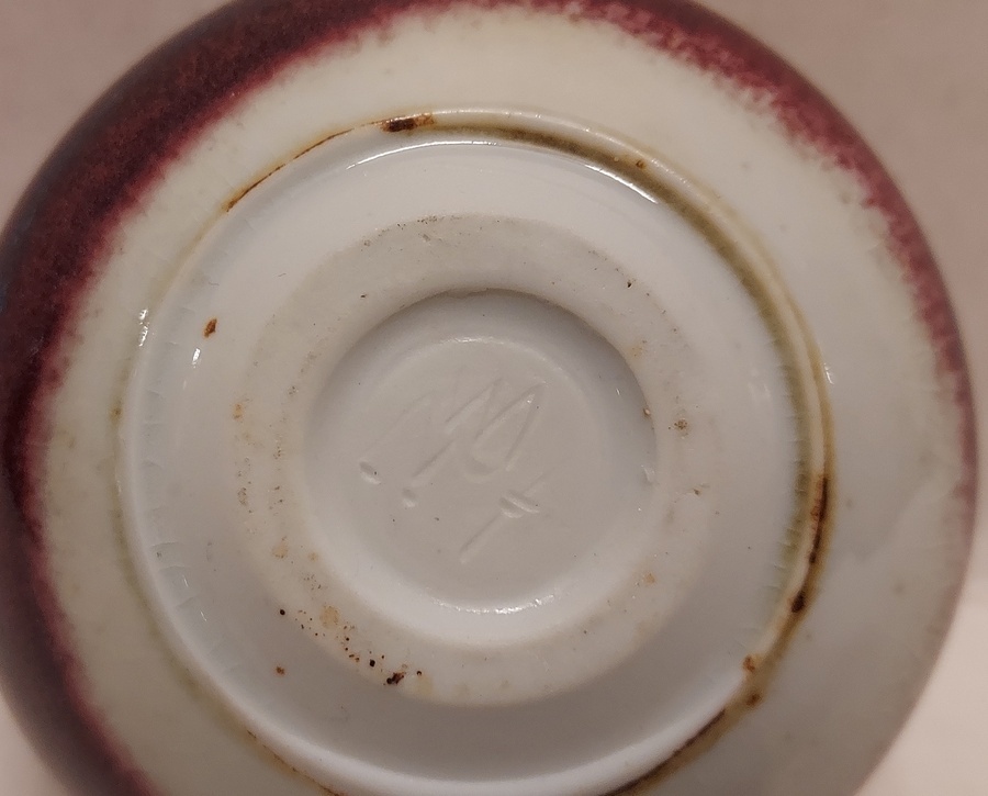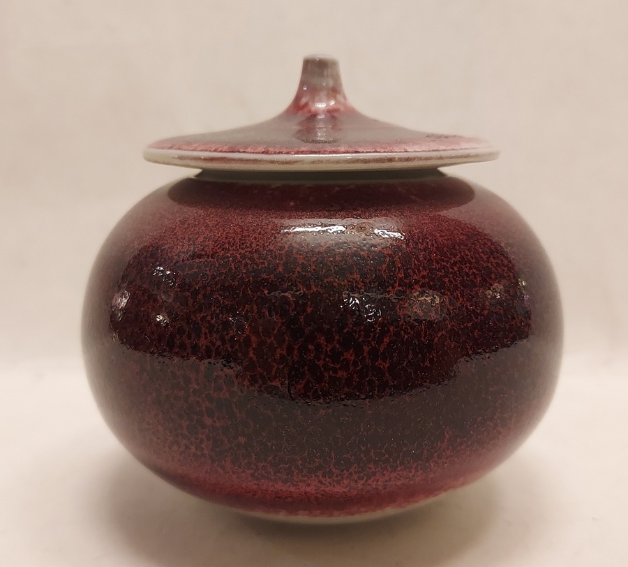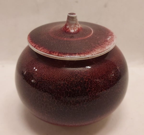 Tarro con tapa con esmalte sang de boeuf. Parte inferior con monograma.