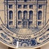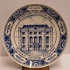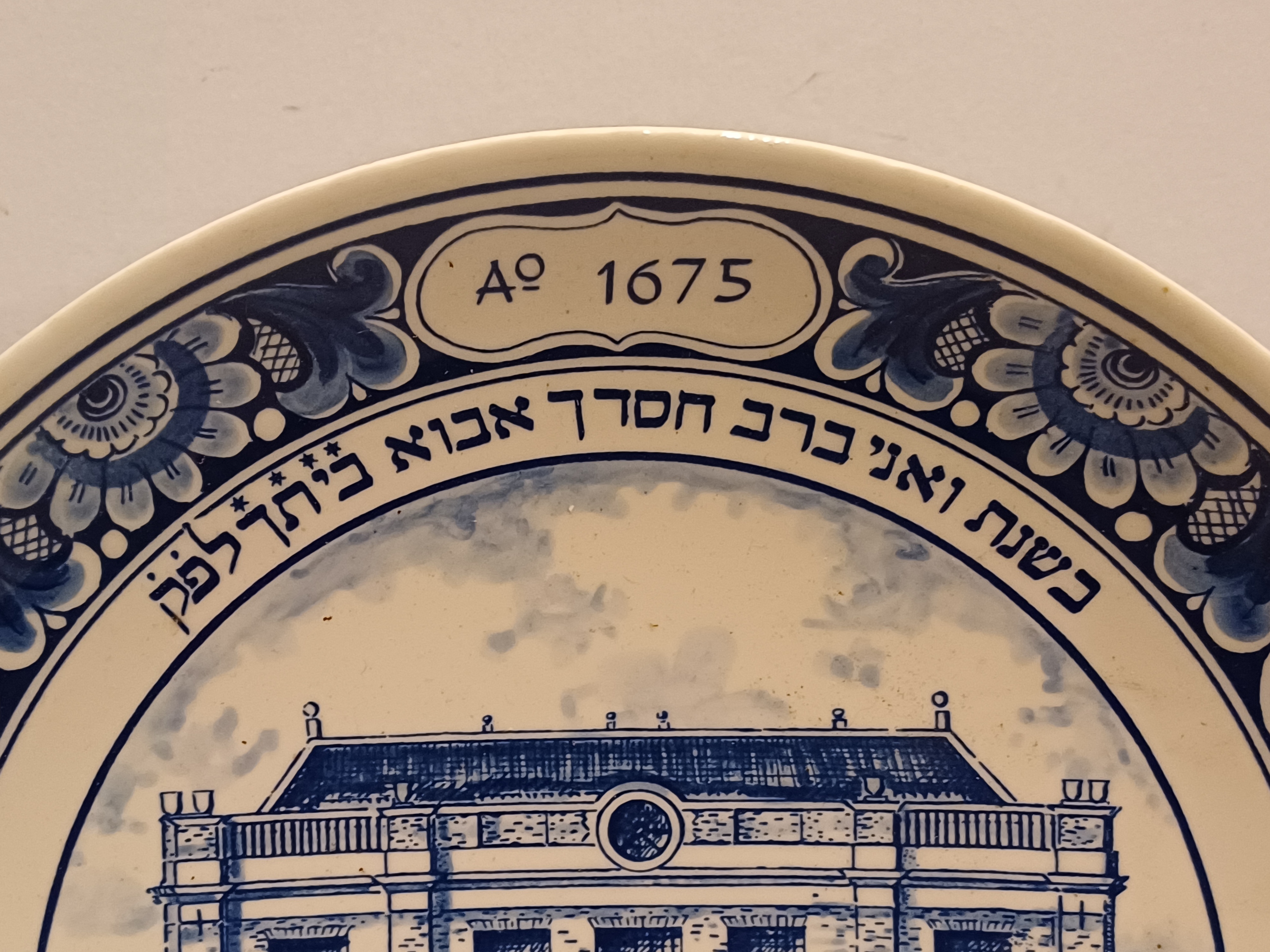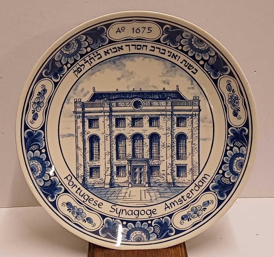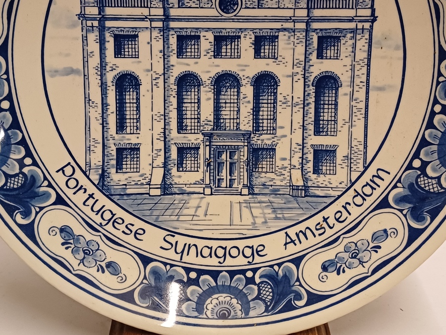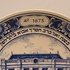 Plato de Delft azul que muestra la sinagoga portuguesa de Ámsterdam en el centro. En el borde, A. 1675 con texto en yidis. Parte posterior con marca de fábrica.