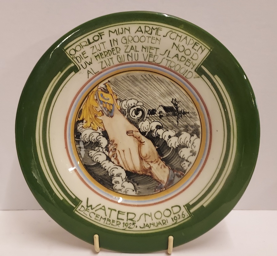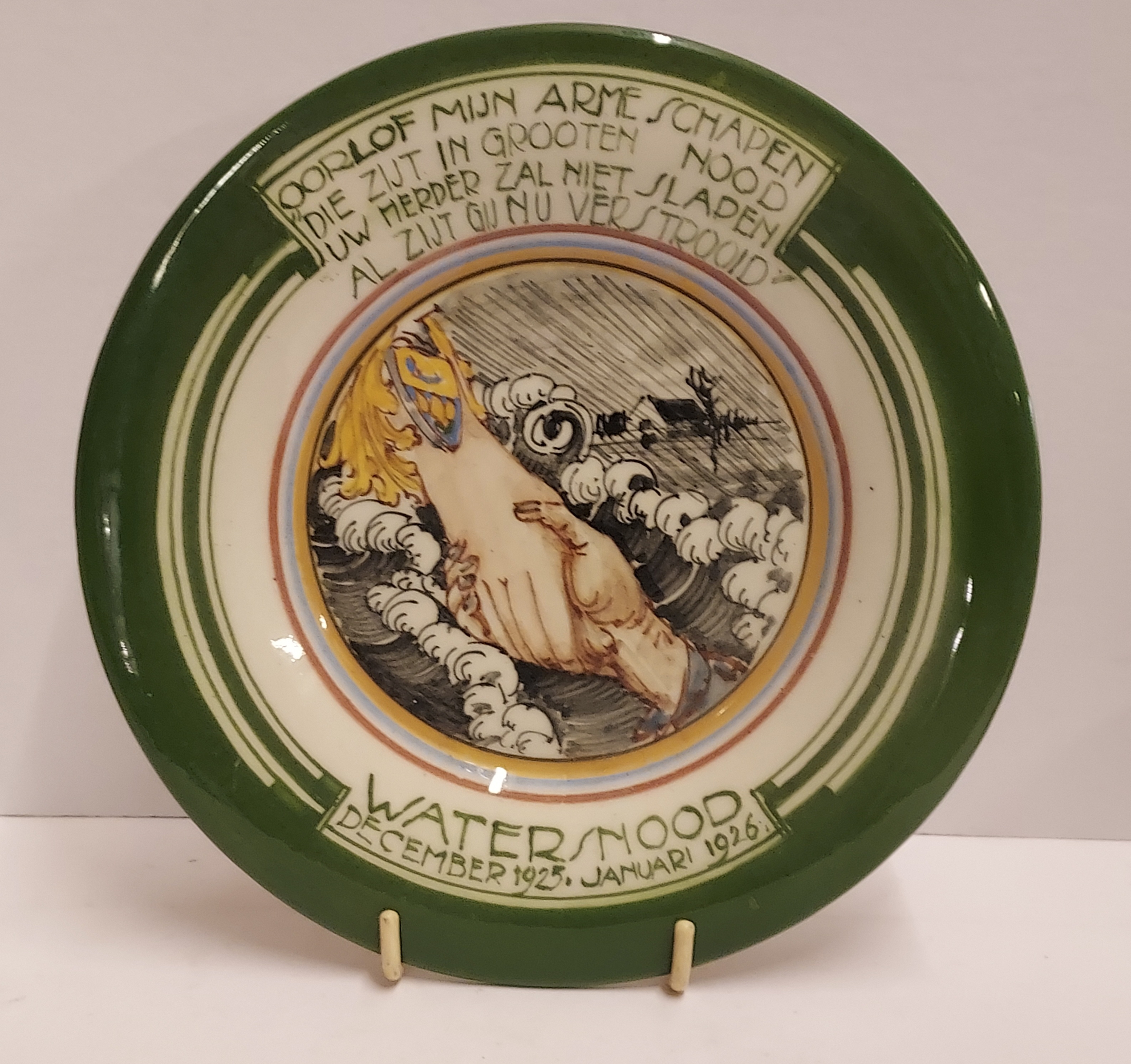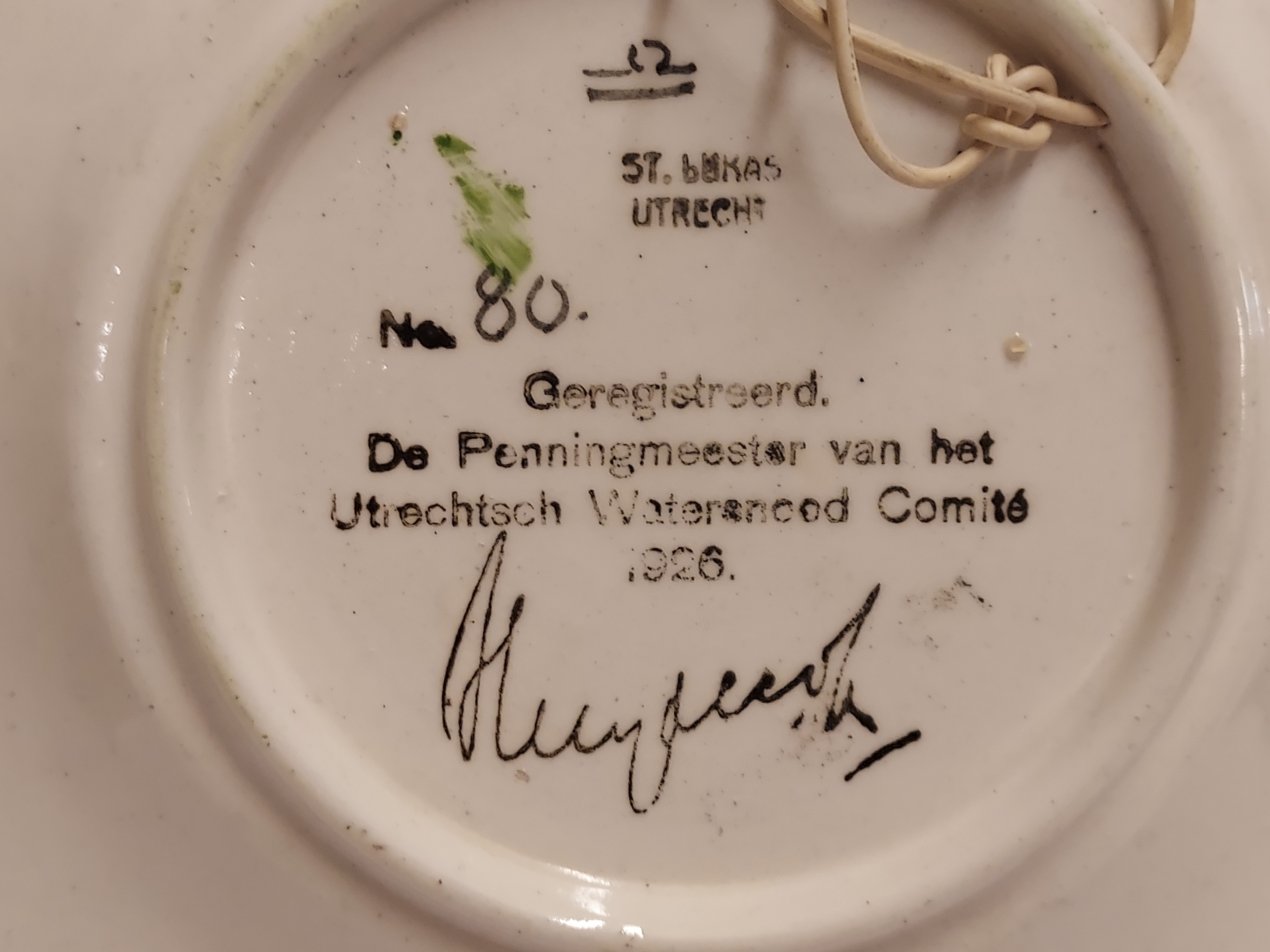 Representación de una mano que se extiende a otra mano. Con el texto "Oorlof mijn arme schapen die zijt in grooten nood uw herder zal niet slapen al zijt gij nu verstrooid. Watersnood december 1925-januari 1926". En el reverso con marca de fábrica y número 80. Registrado por el tesorero del comité de inundaciones de Utrecht 1926.