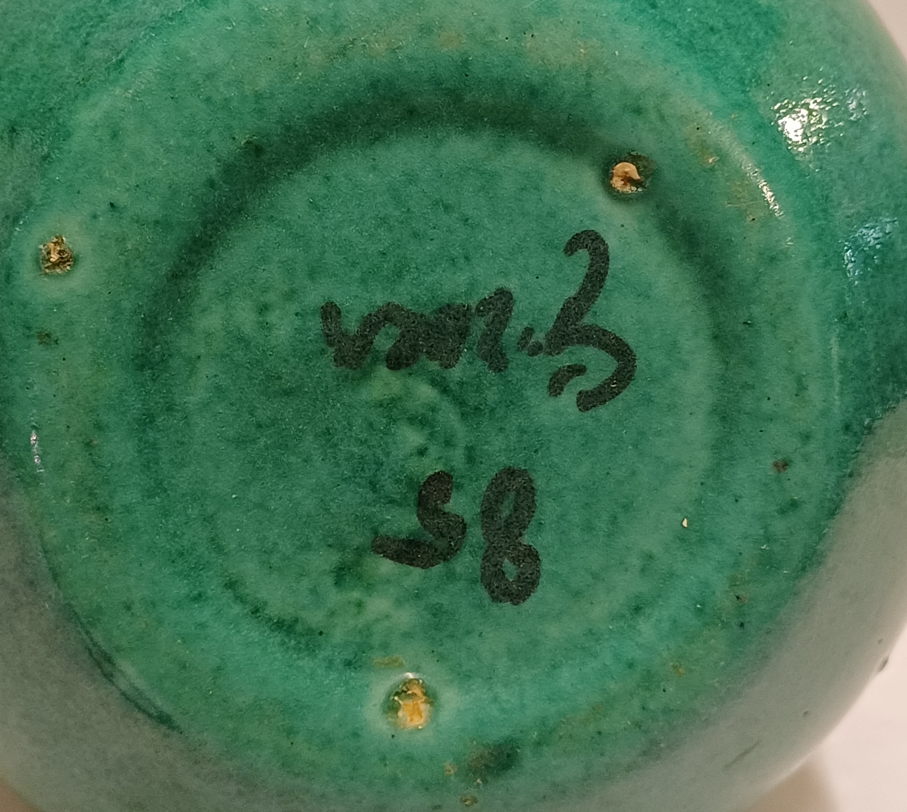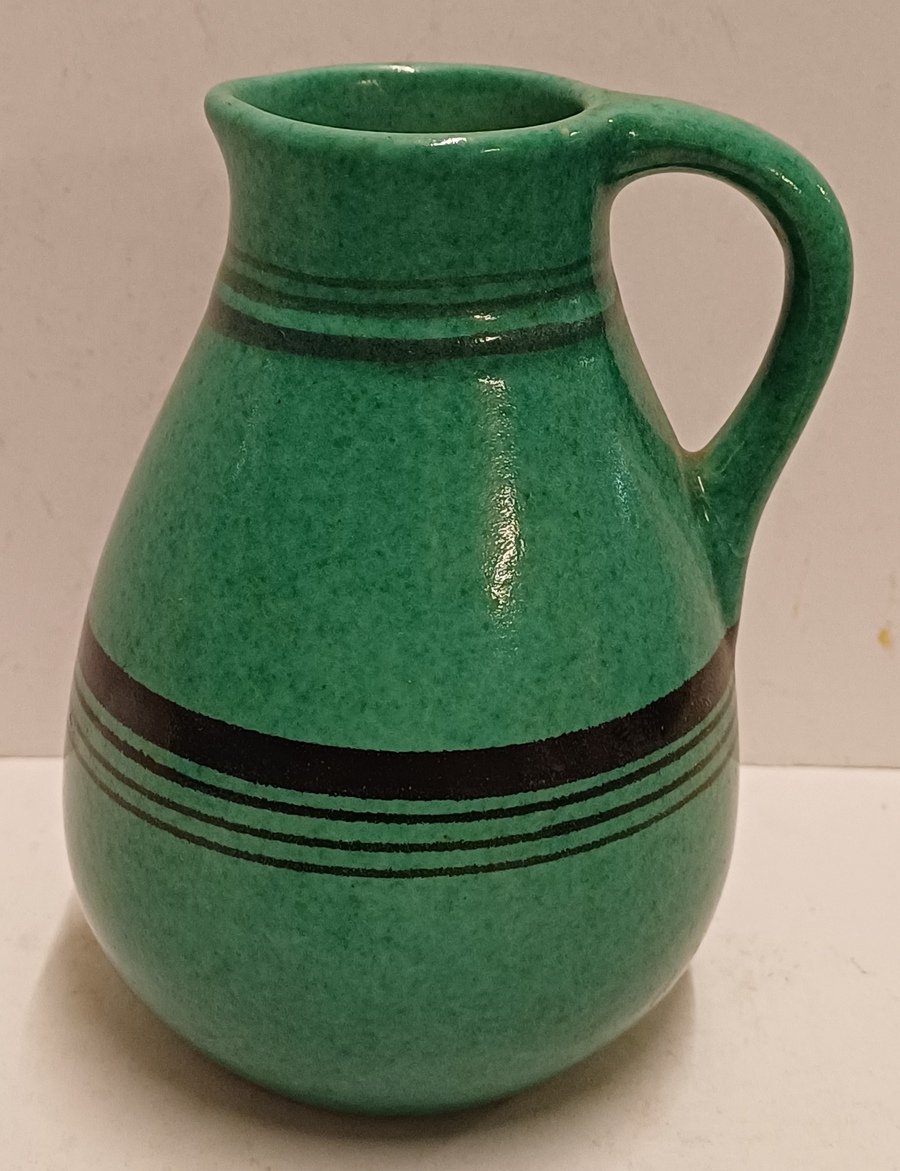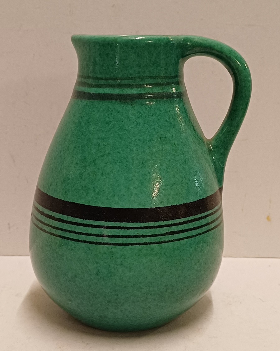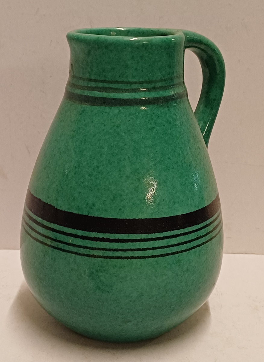Aardewerken kan met zwarte band decoratie op groen fond. Onderzijde onduidelijk gesigneerd.