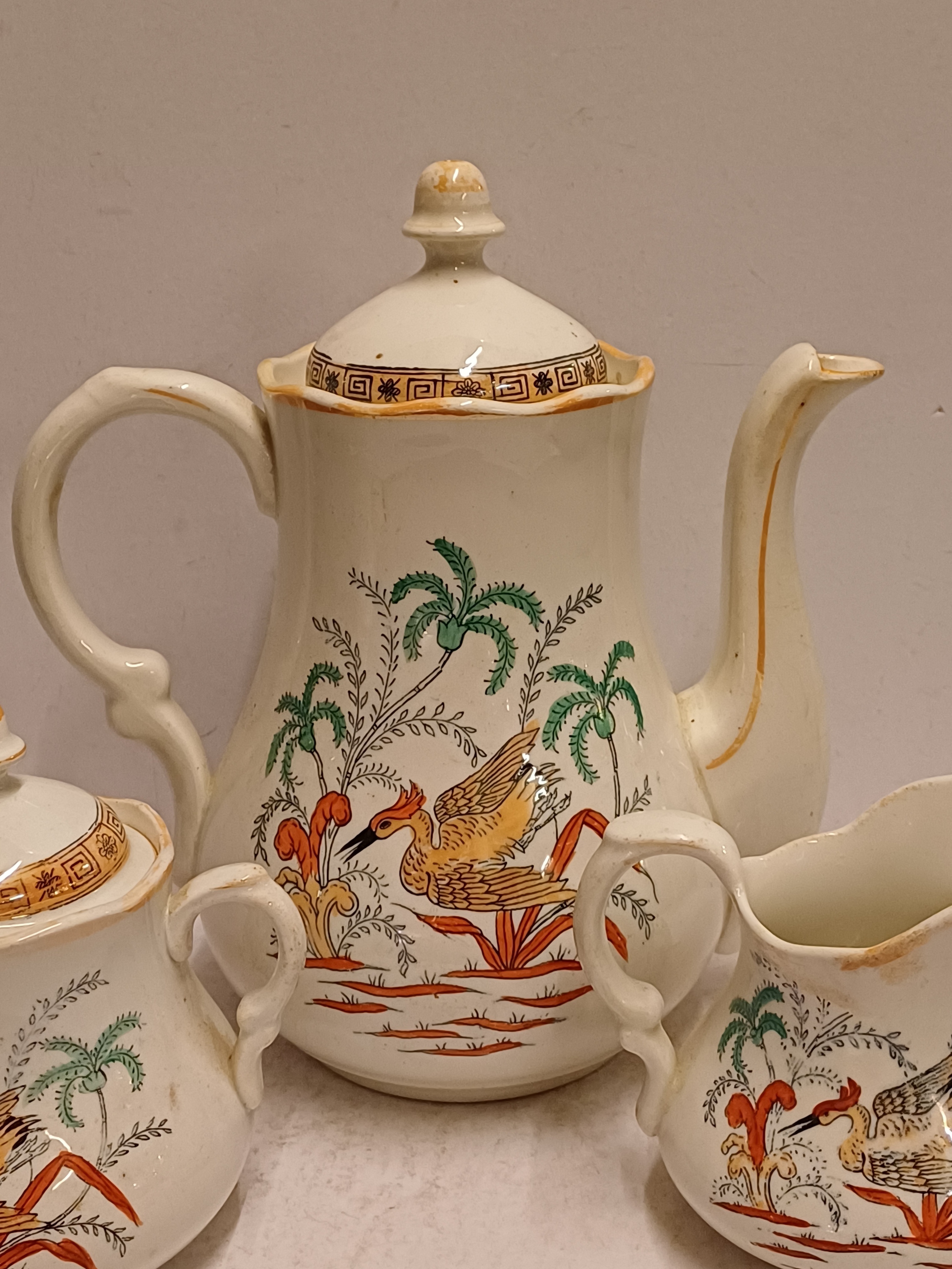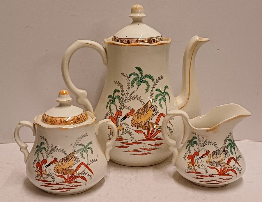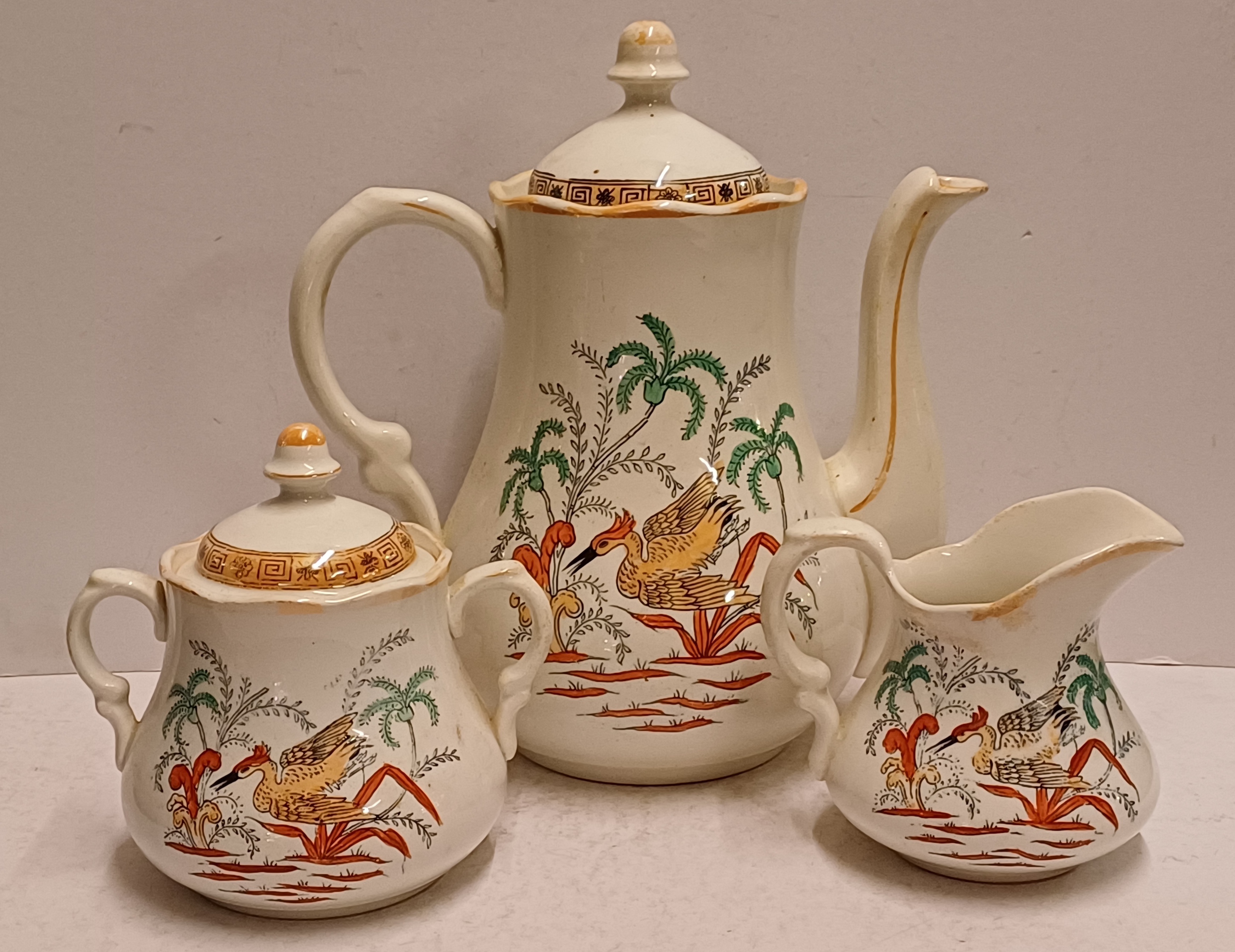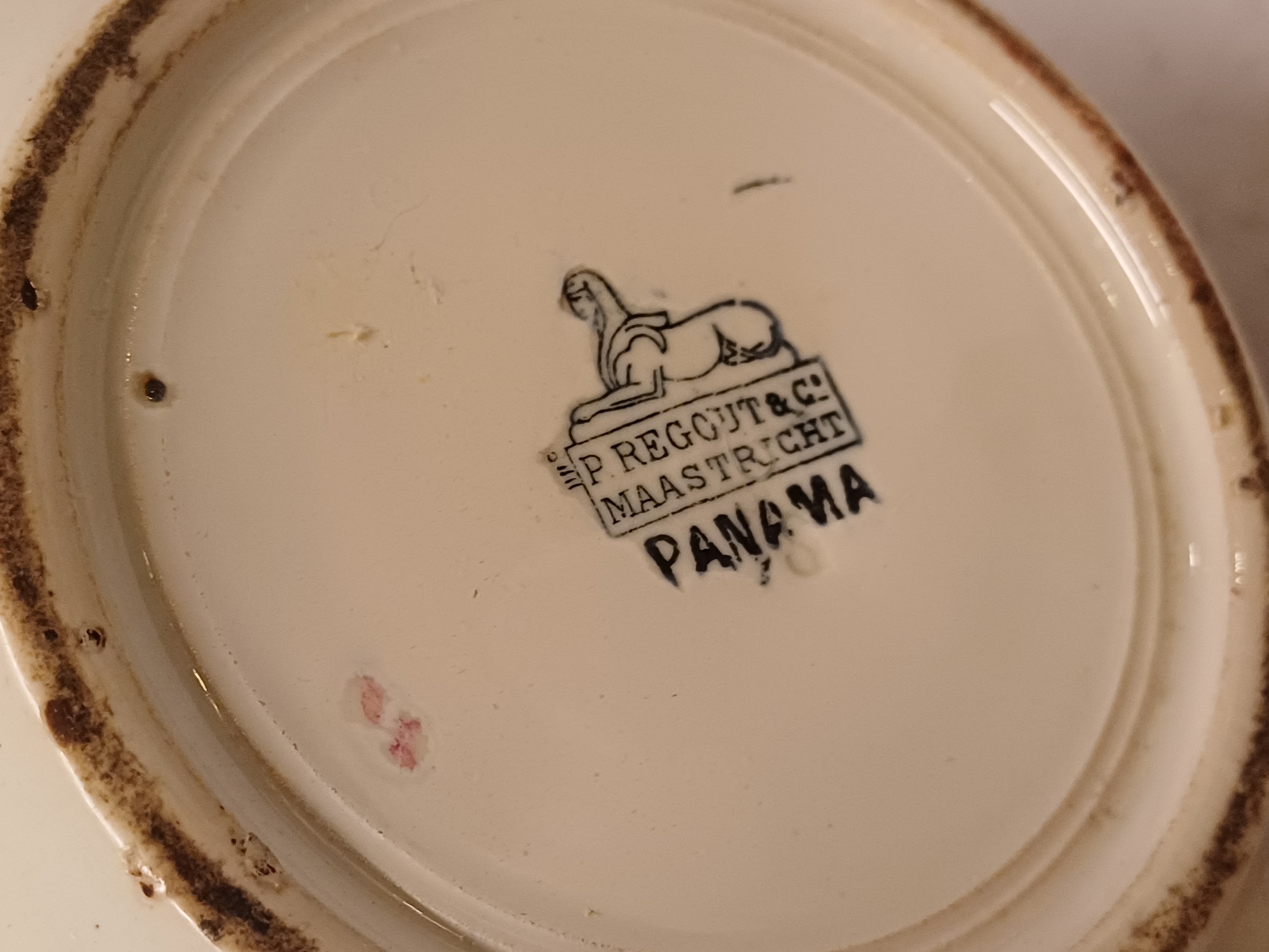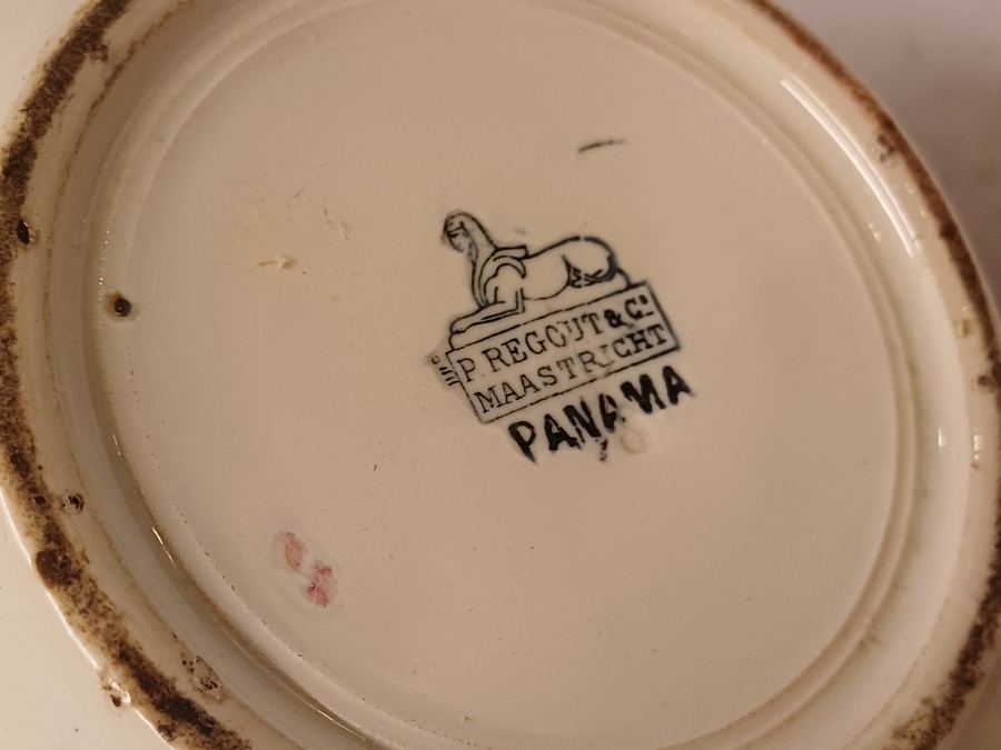Aardewerken koffiepot met roomstel met transfer decor Panama. Onderzijde met fabrieksmerk