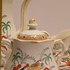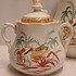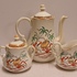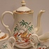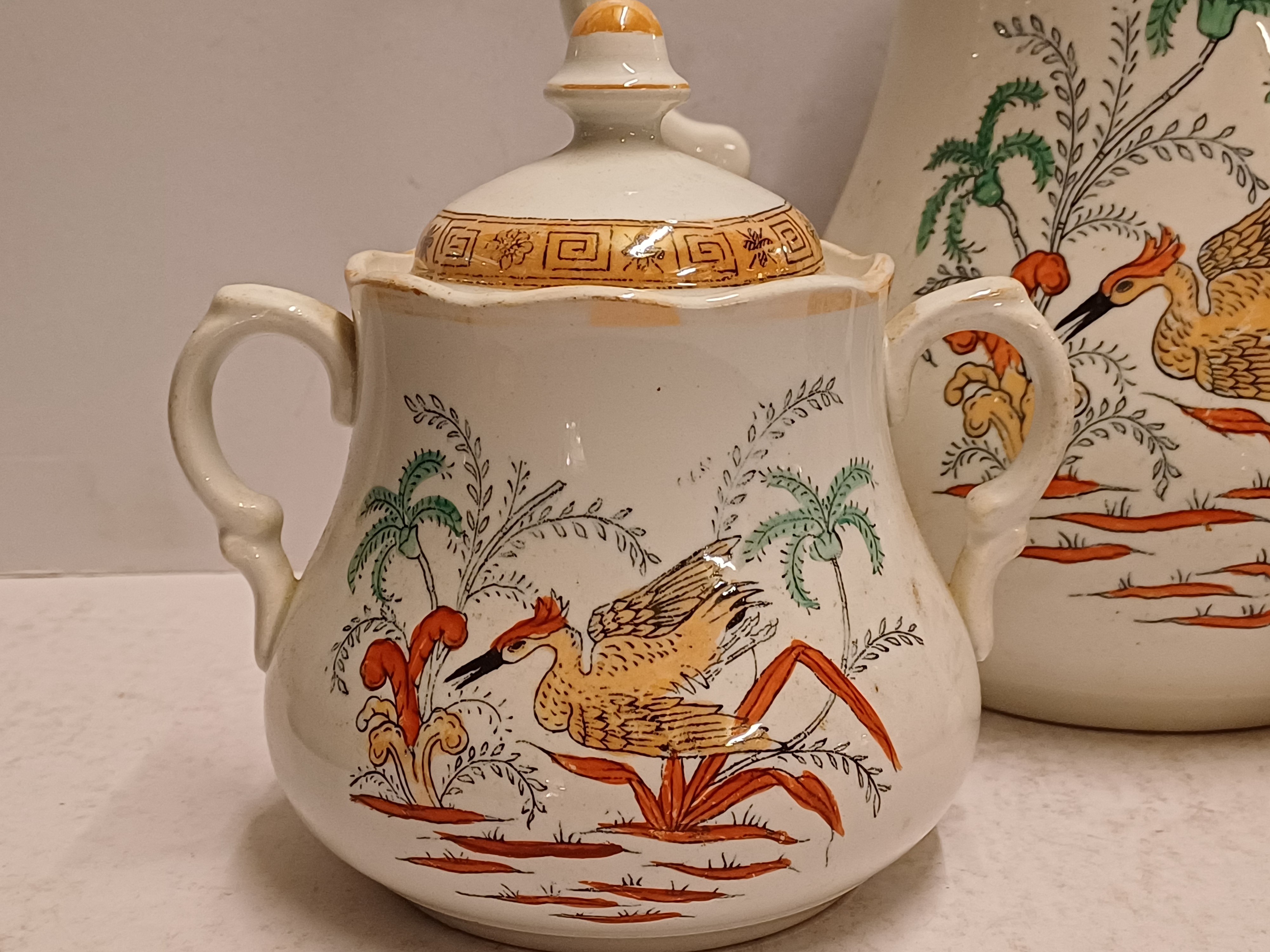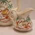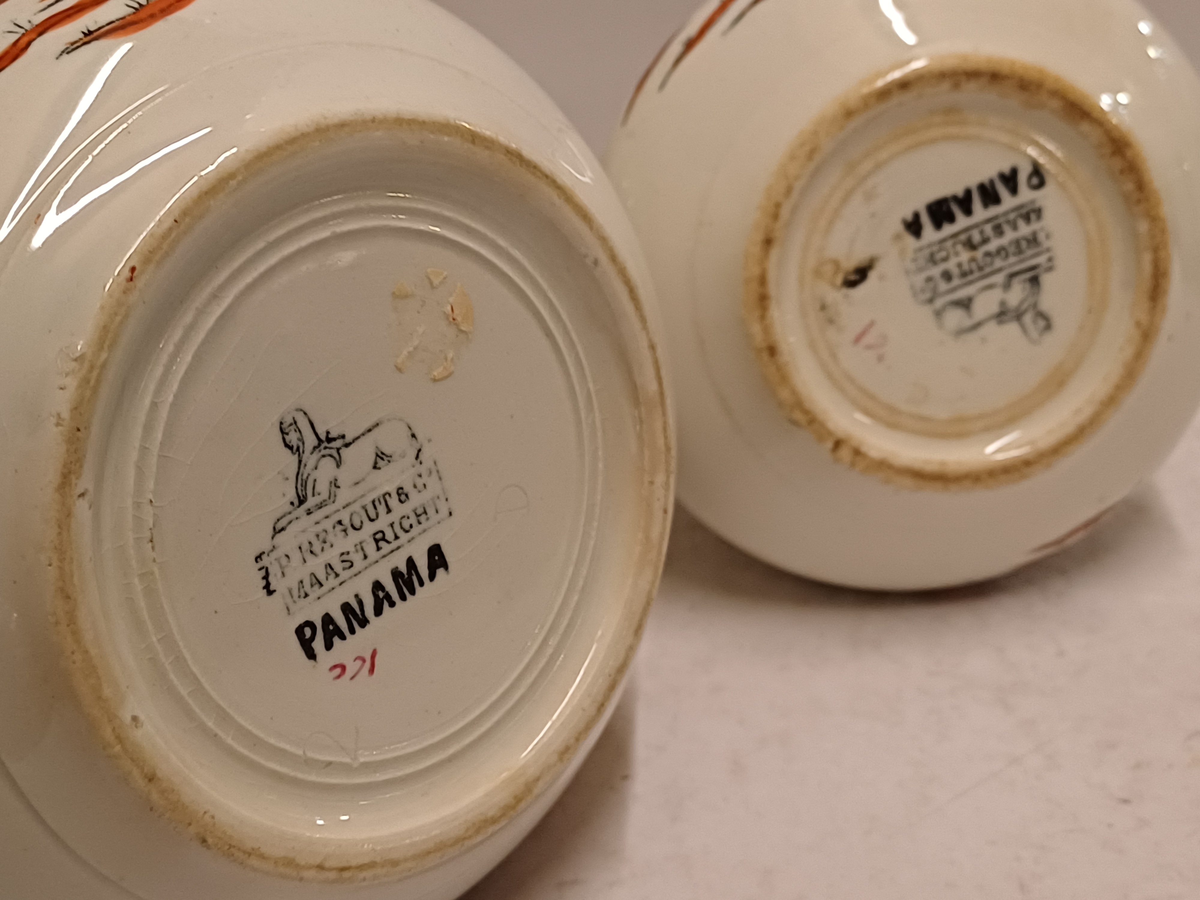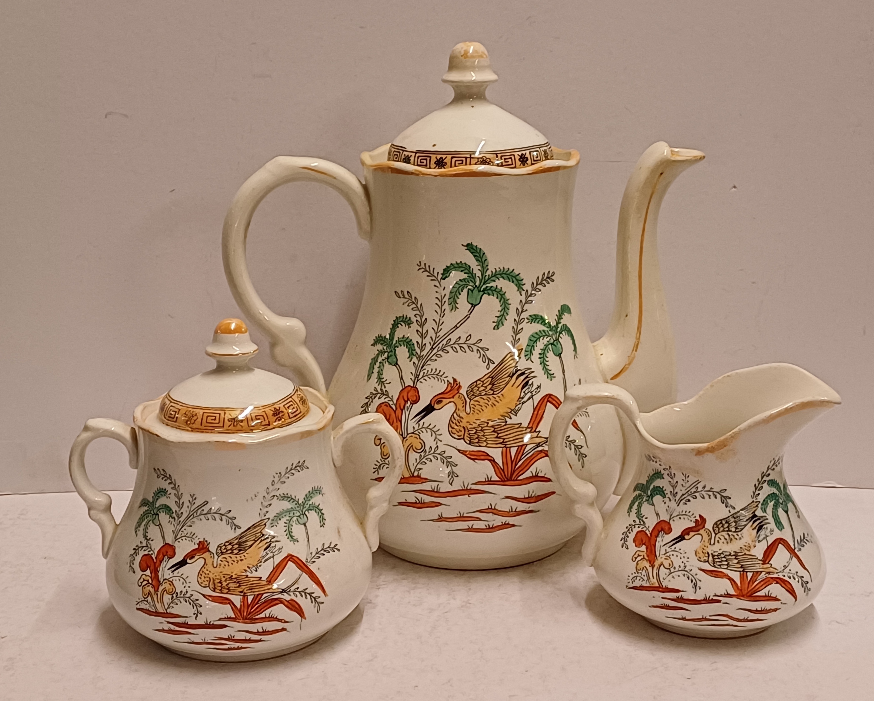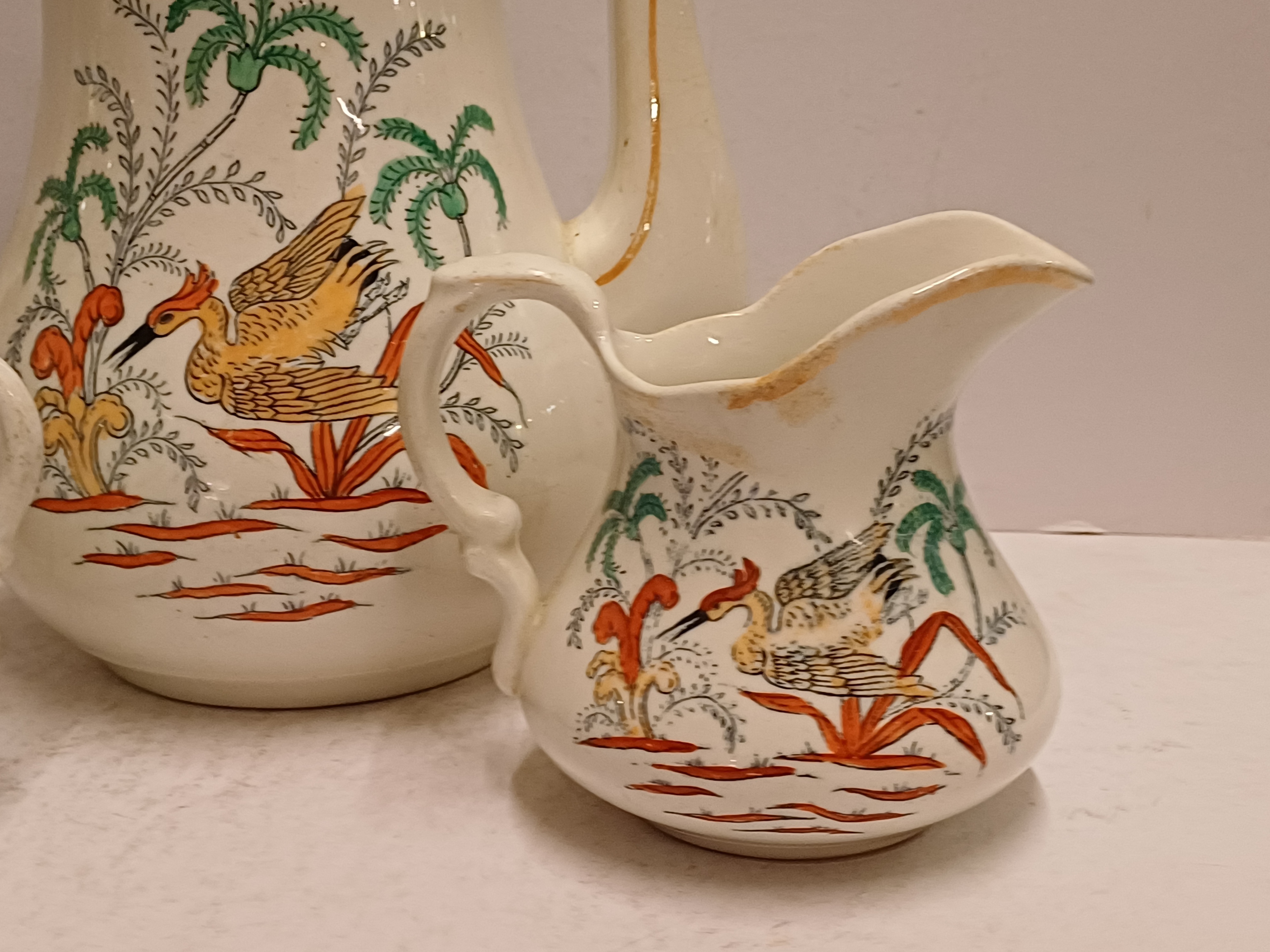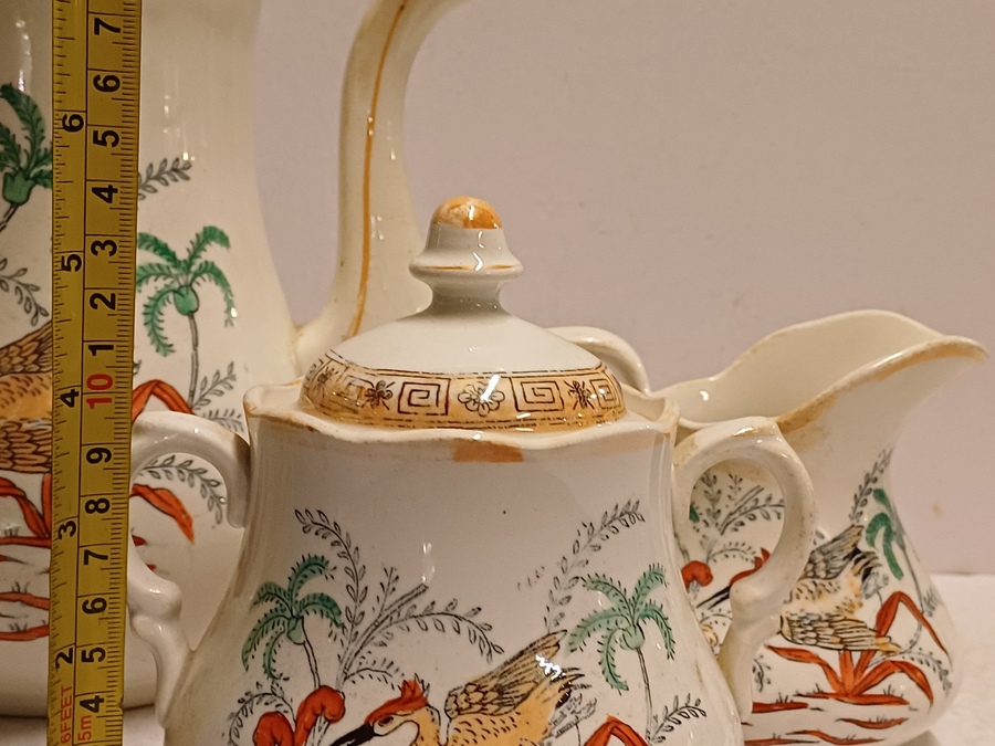 Aardewerken koffiepot met roomstel met transfer decor Panama. Onderzijde met fabrieksmerk