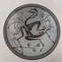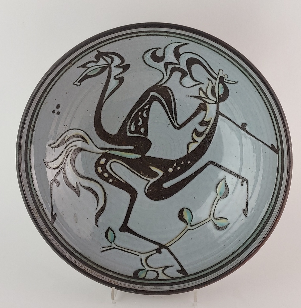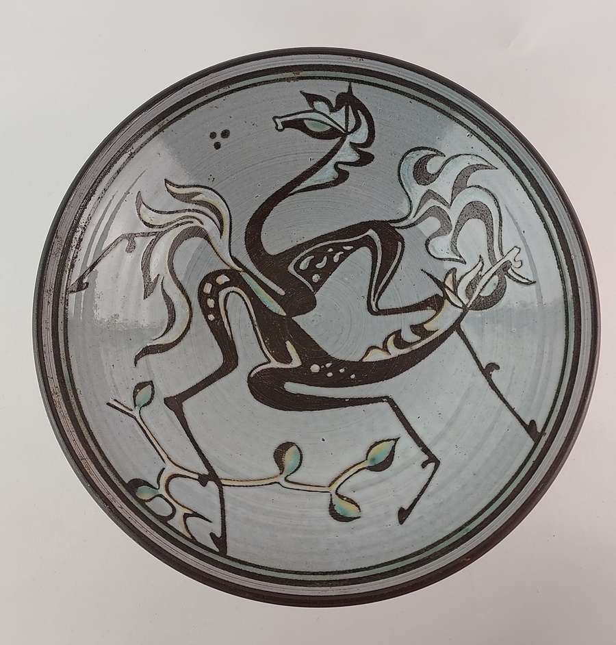 Plato con decoración estilizada de un caballo. Parte trasera con marca rayada.