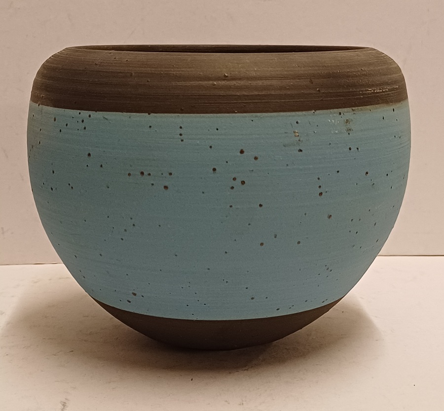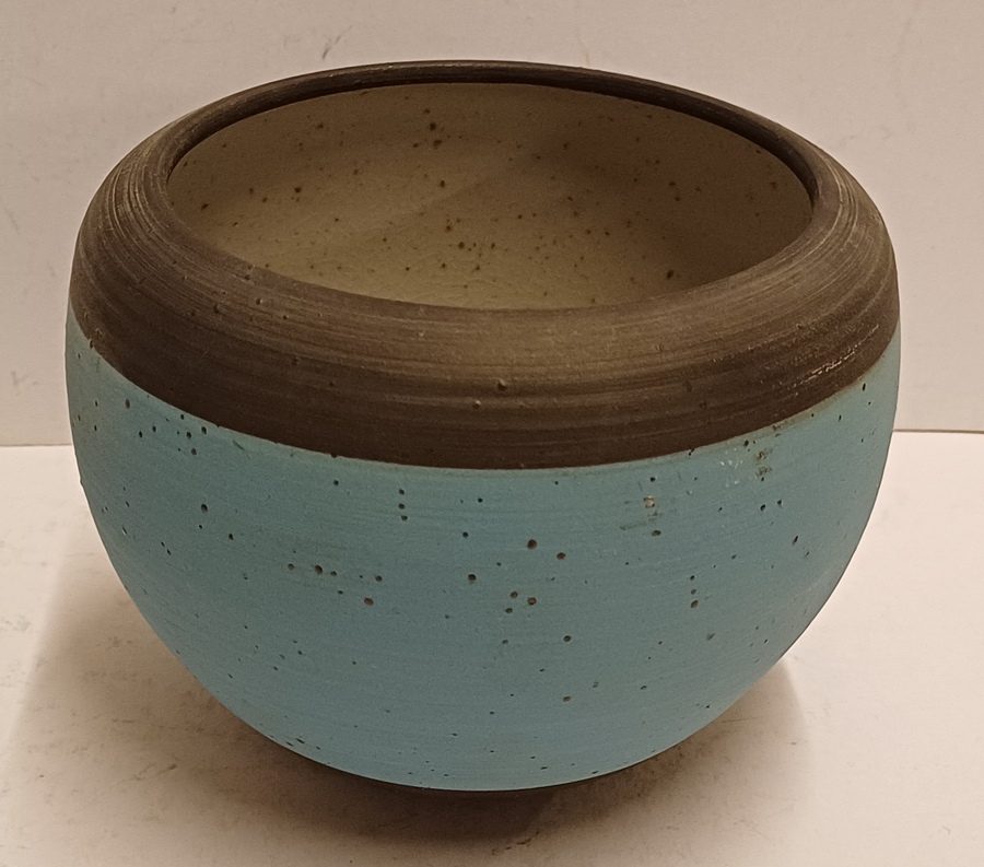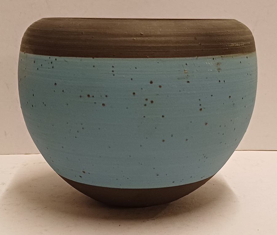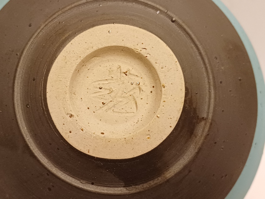 Aardewerken kom met blauwe en zwarte horizontale band. Onderzijde met monogram.