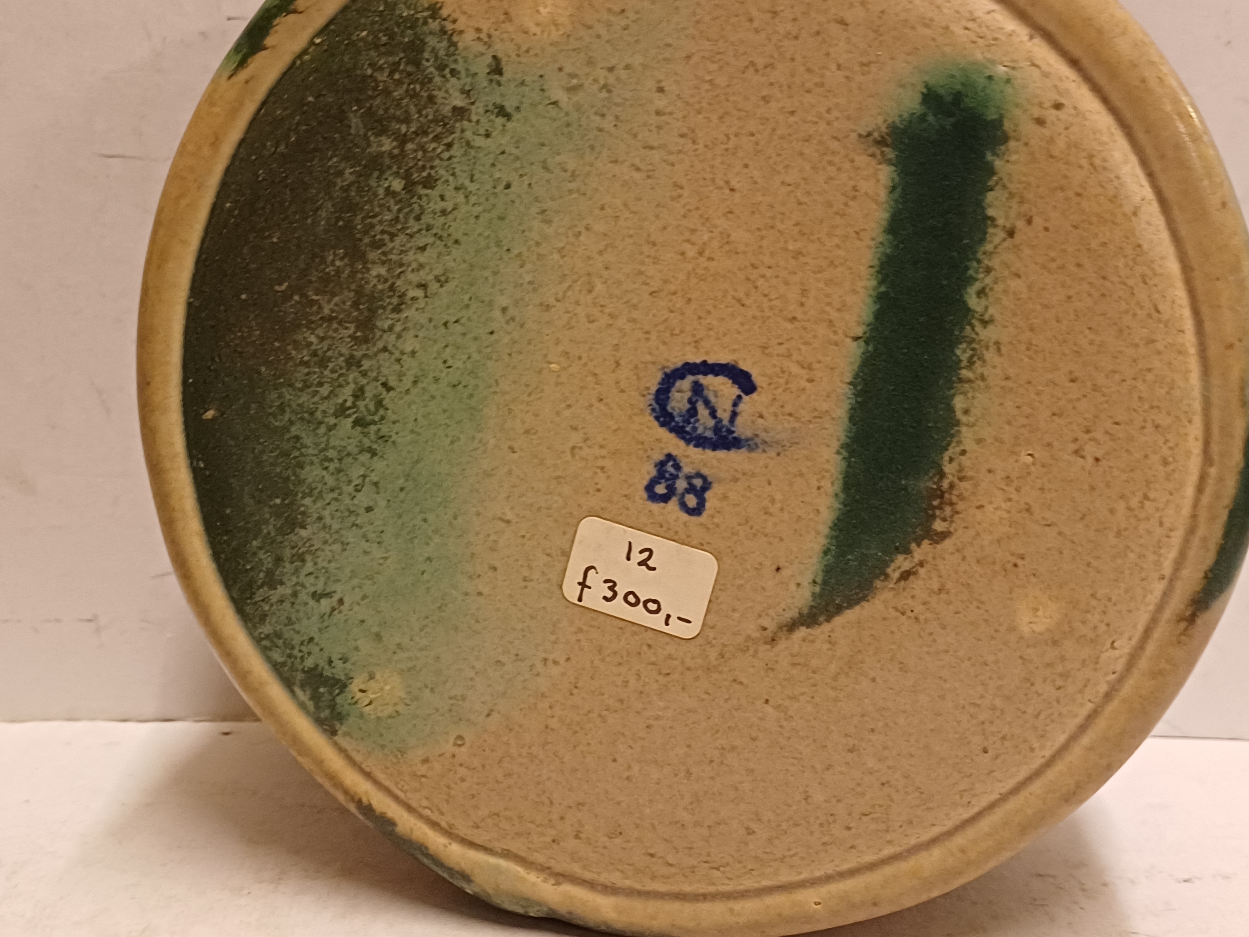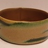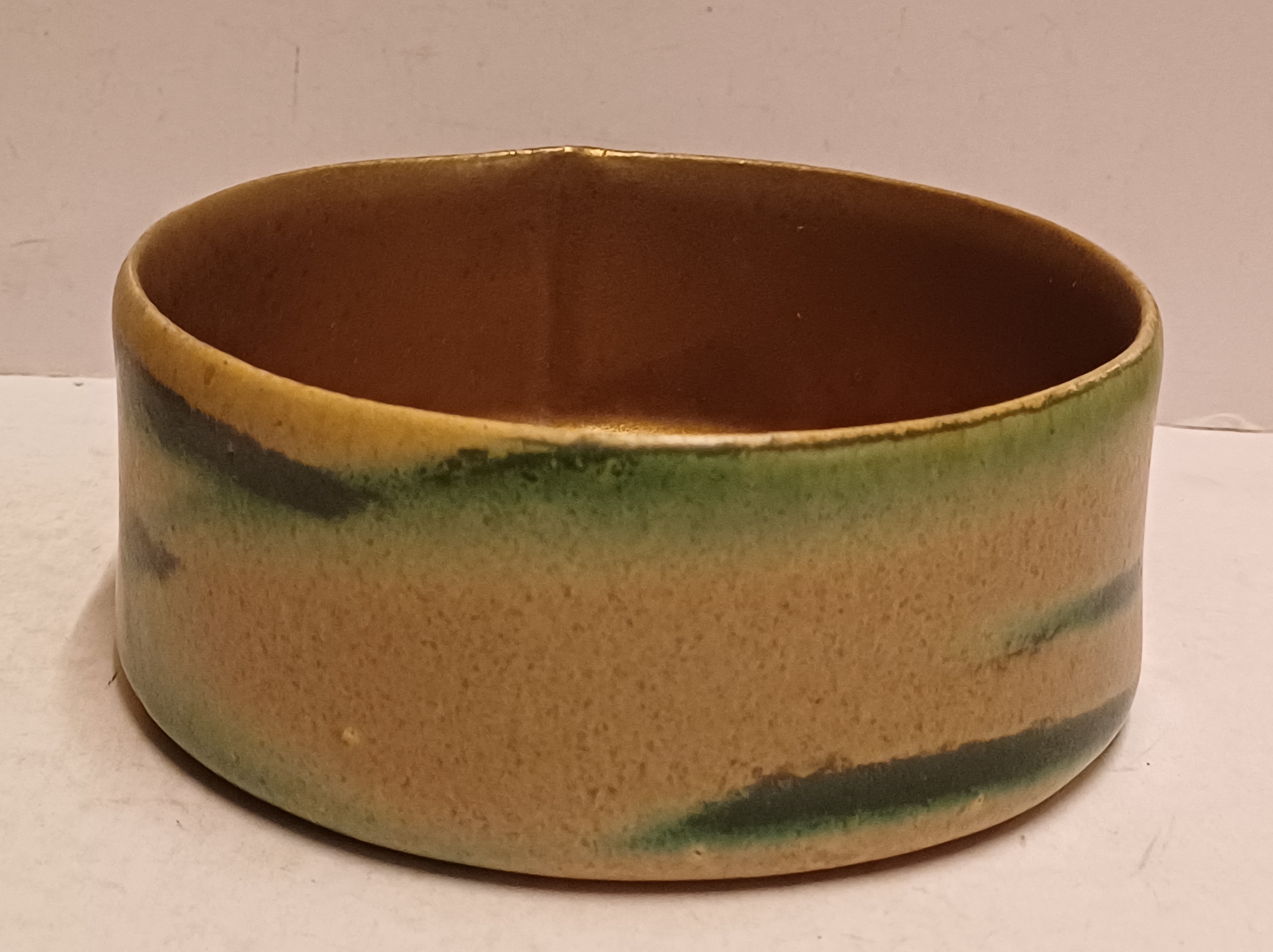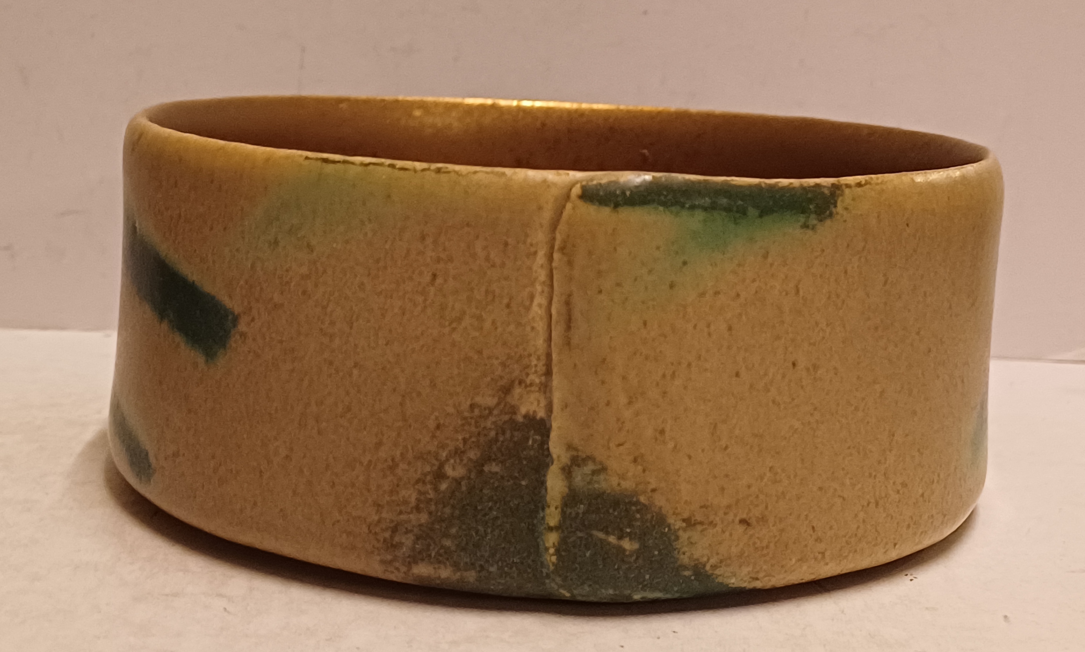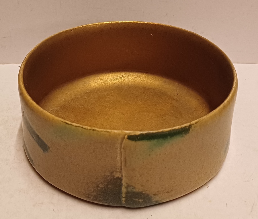 Aardewerken kom uit platen opgebouwd met gesprayde glazuur. Binnenzijde met gouden glazuur. Onderzijde gesigneerd