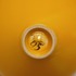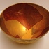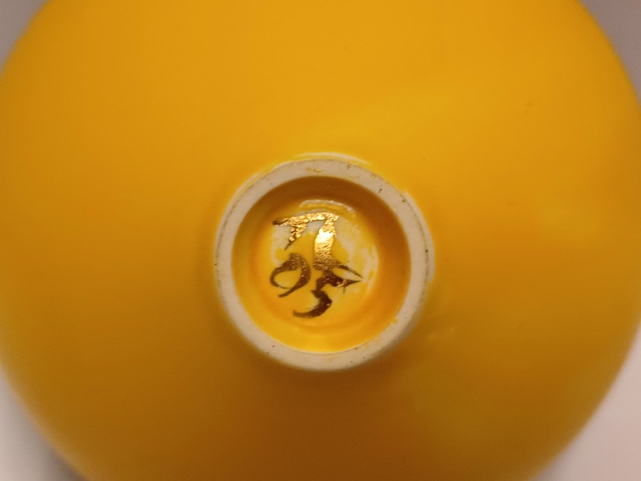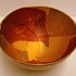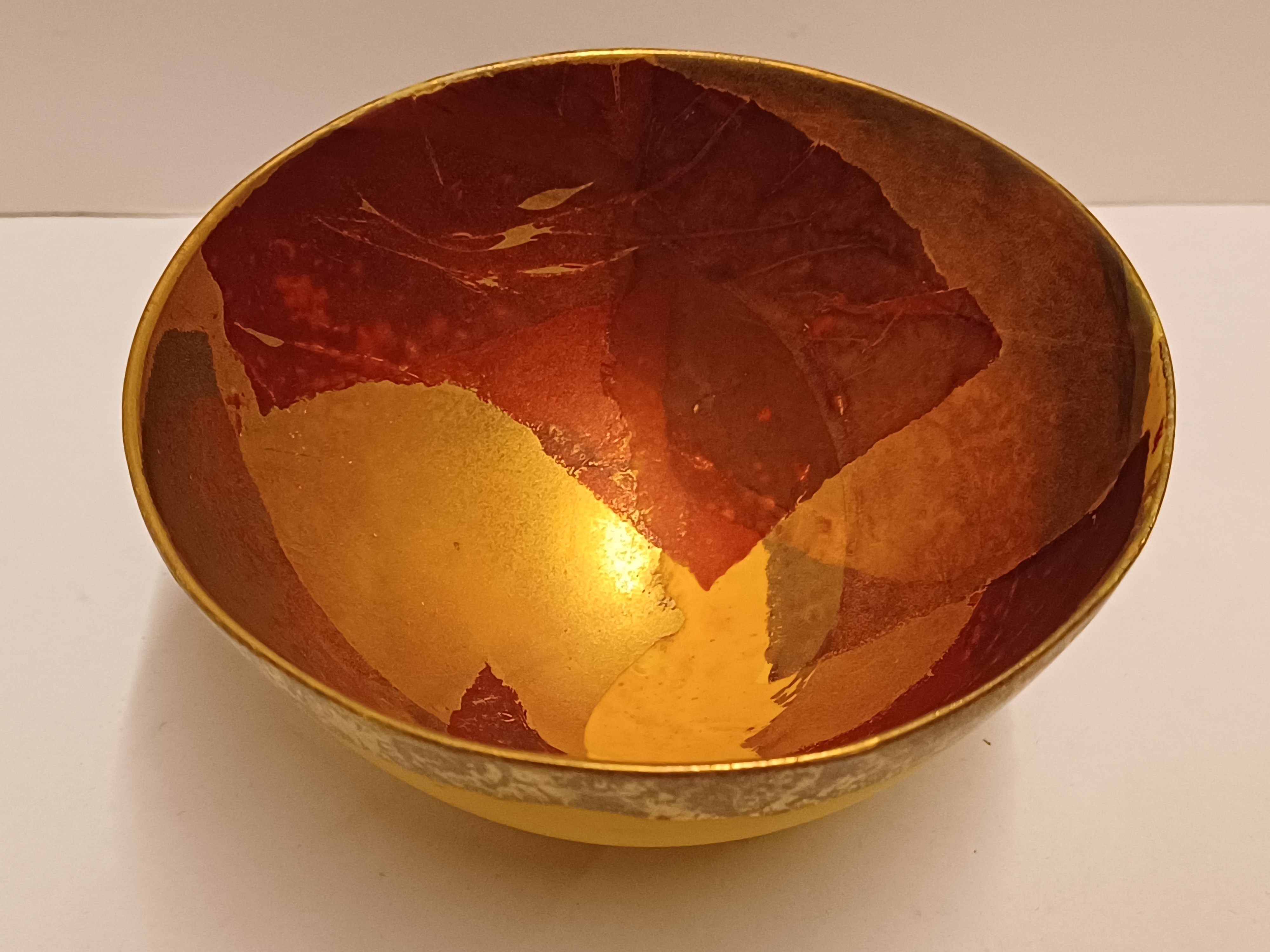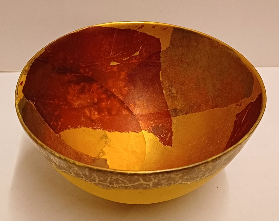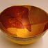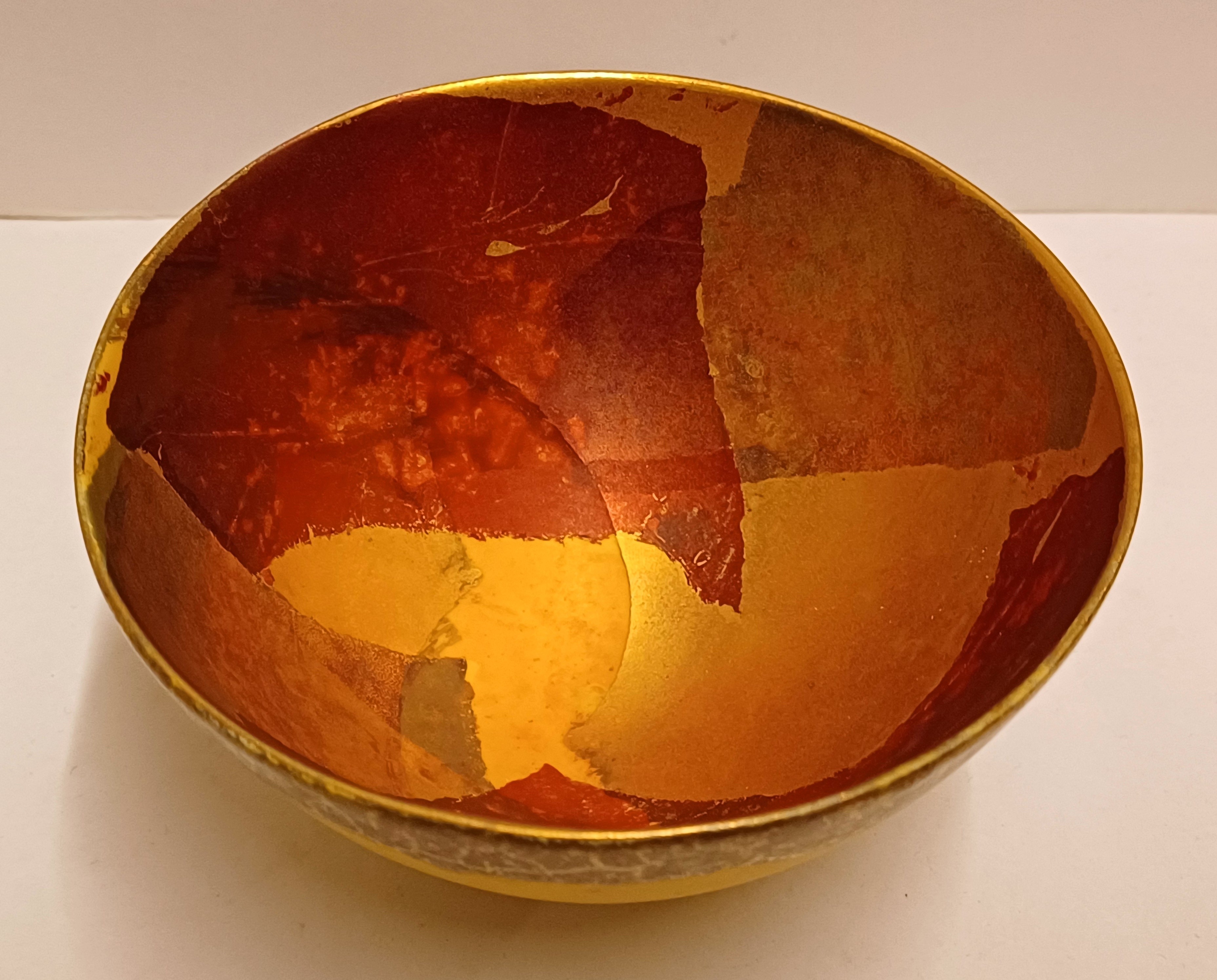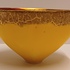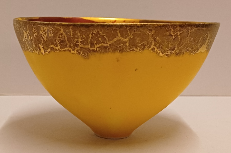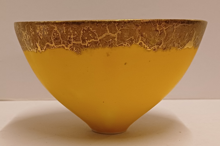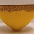Aardewerken kom met gele glazuur daaroverheen en gevlekte laag met oranje en goud accenten. Onderzijde gesigneerd met monogram.