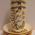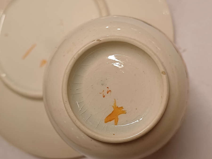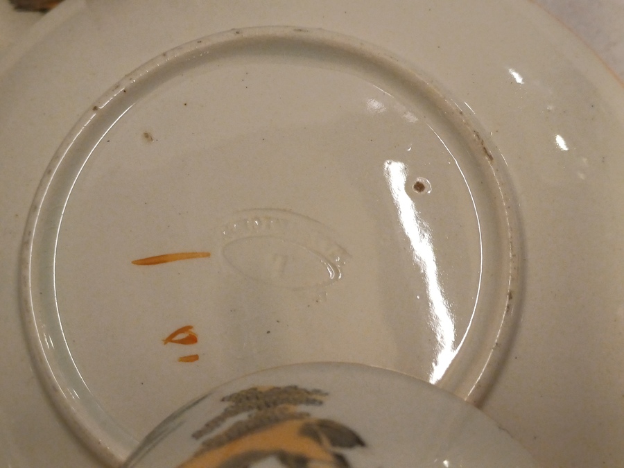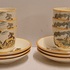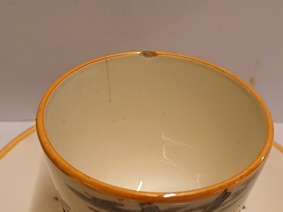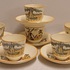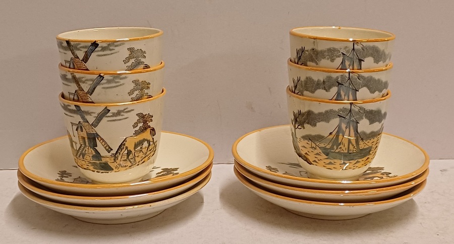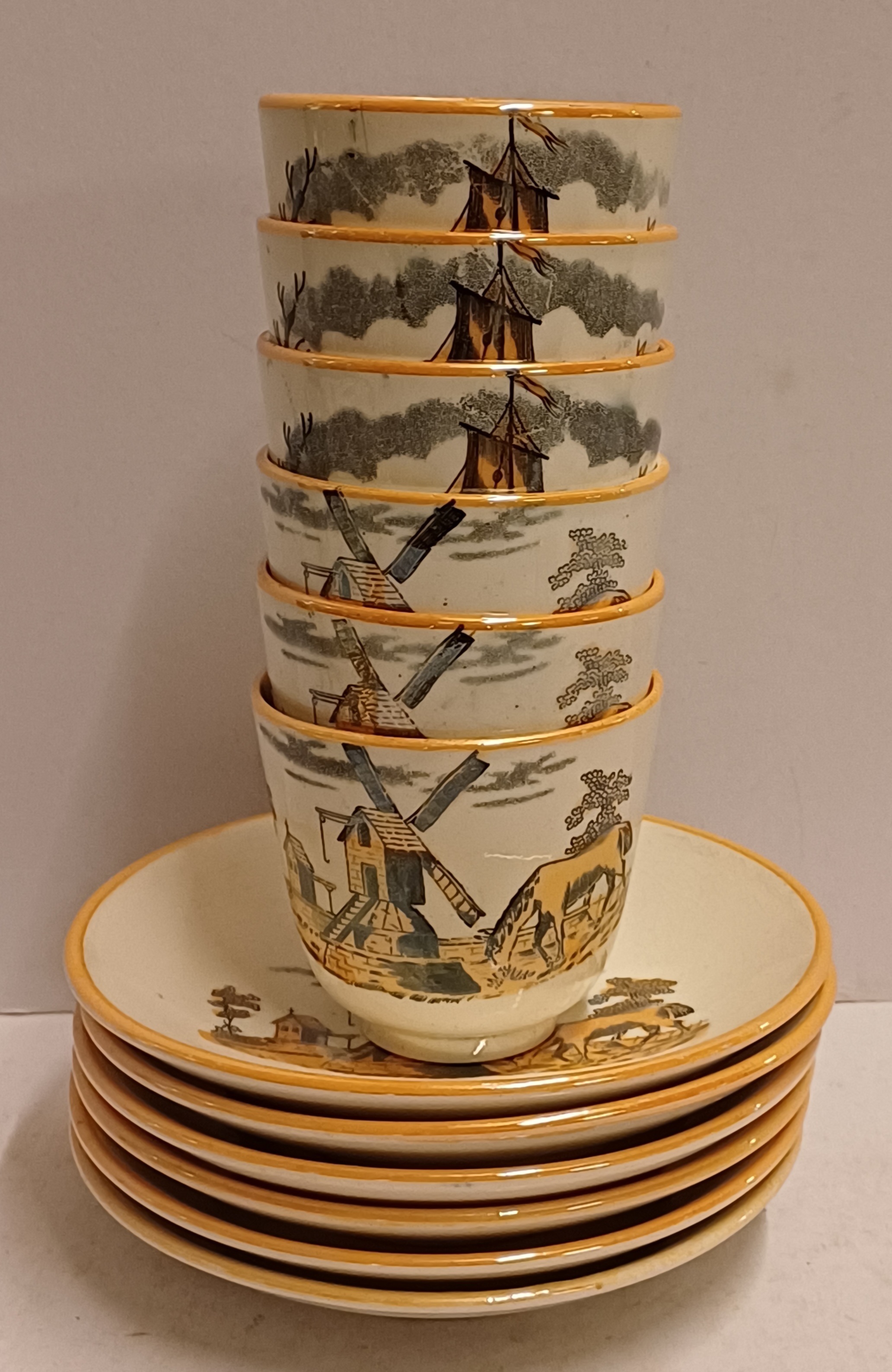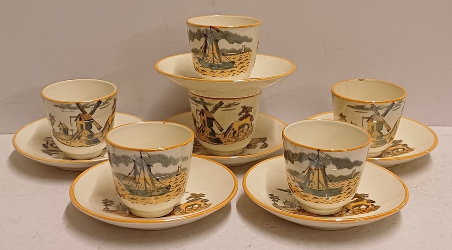 Un conjunto de 6 tazas de moca con platos. Decoradas con molino y barco en decoración de transferencia negra con lustre marrón. Parte inferior con marca ciega ovalada.