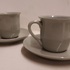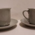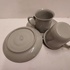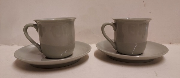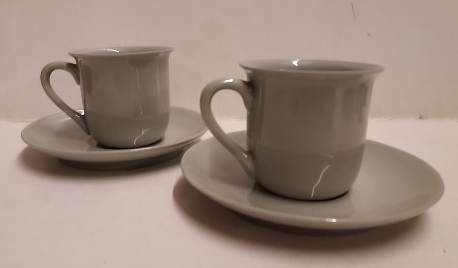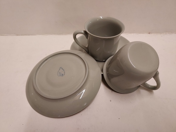 2 tazas de moca con esmalte de celadón gris. Platillos con marca de fábrica.