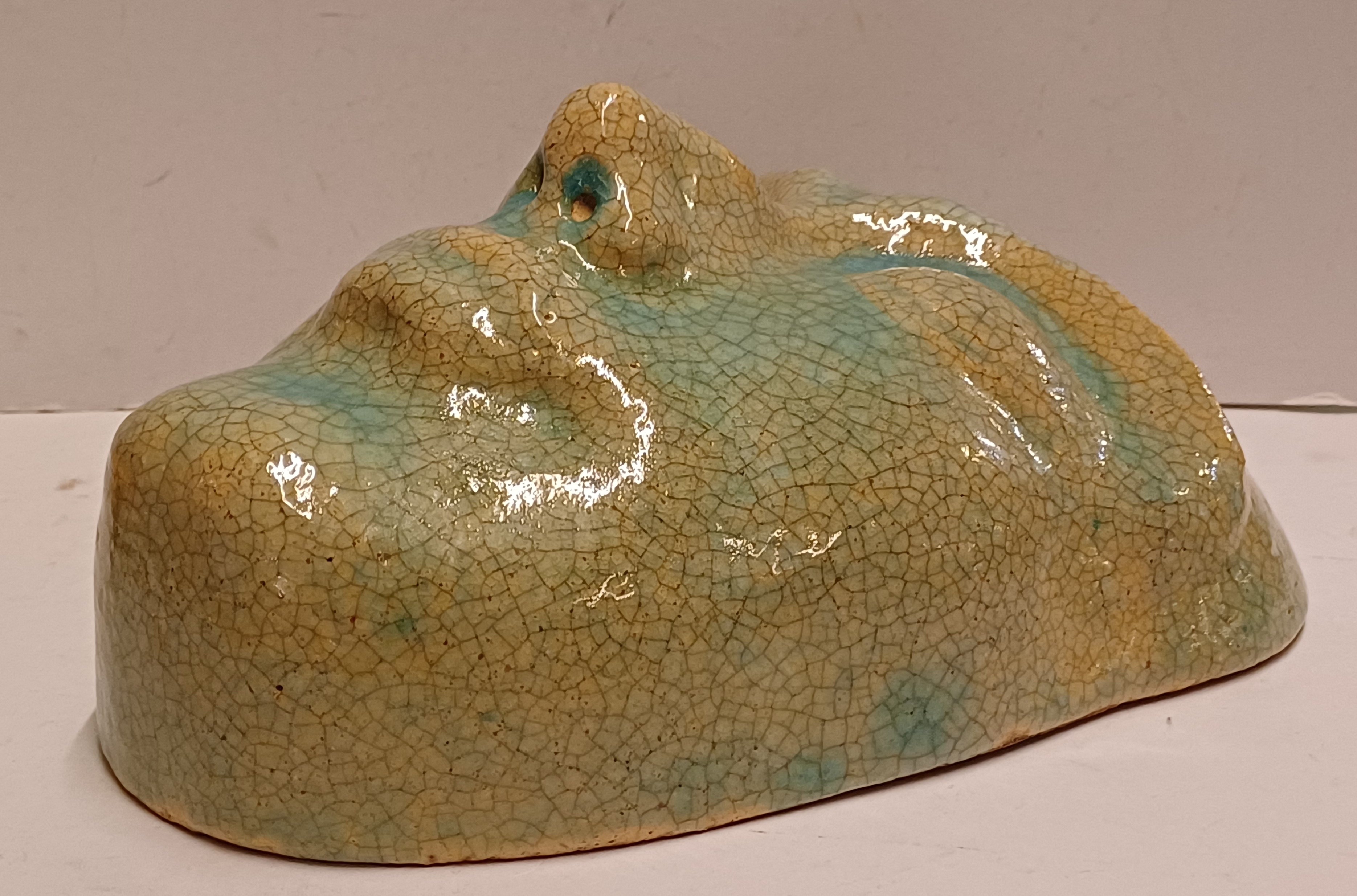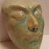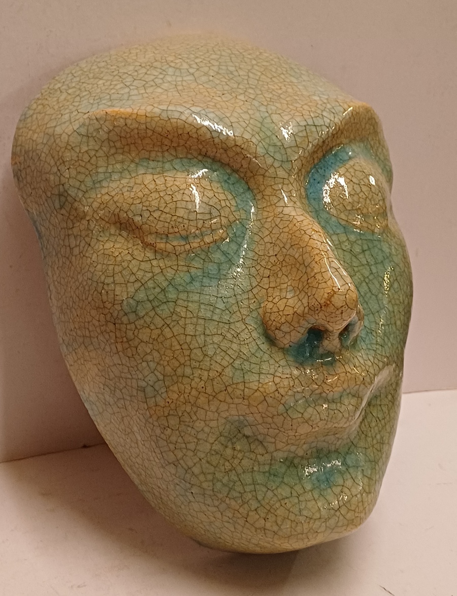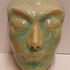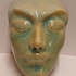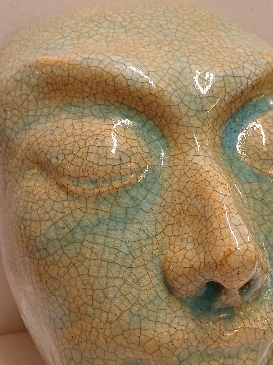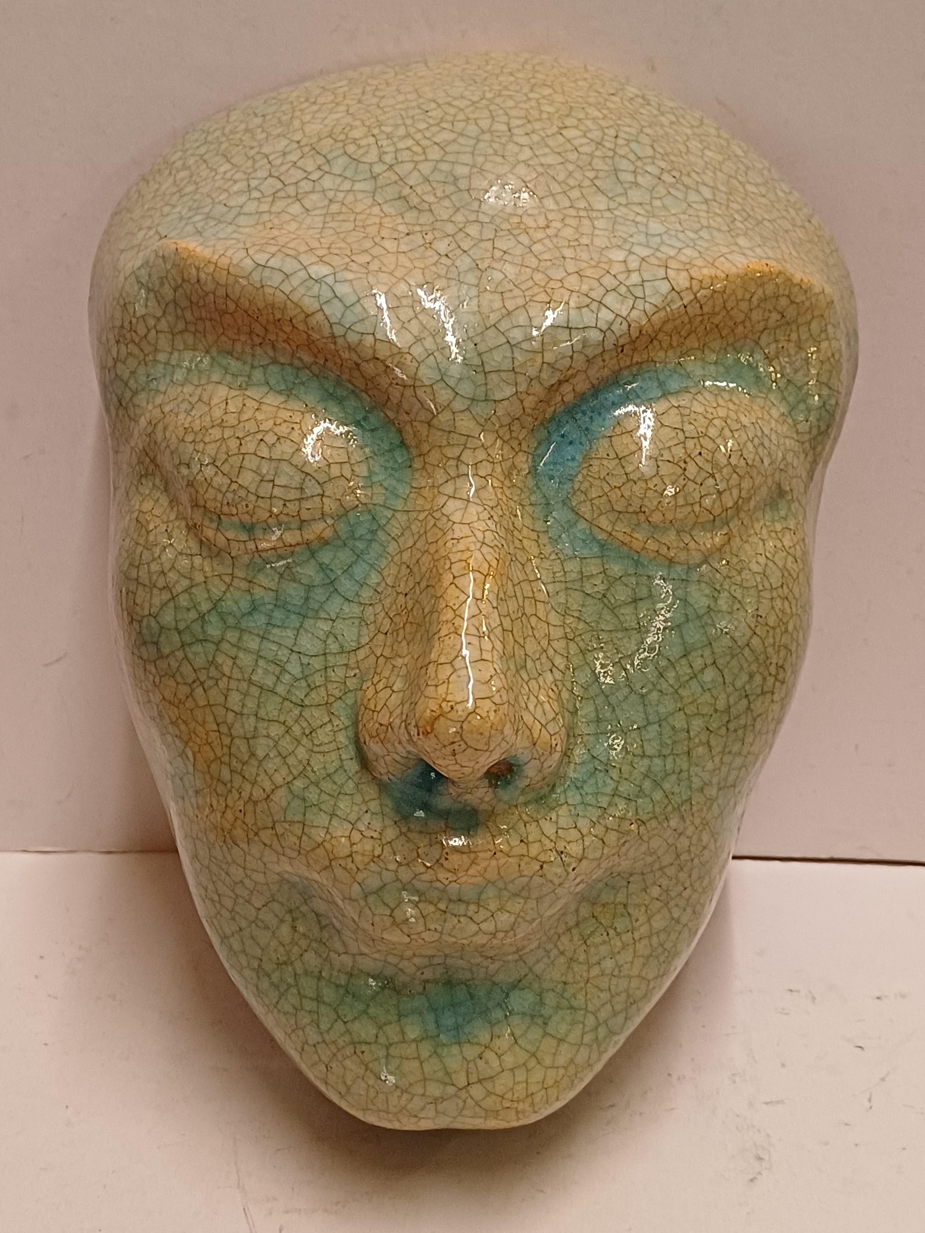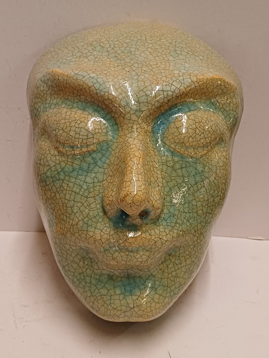 Aardewerken masker van een mannenkop met grote ogen, met fijne blauwe gecraqueleerde glazuur. Achterzijde gesigneerd PG Holland.