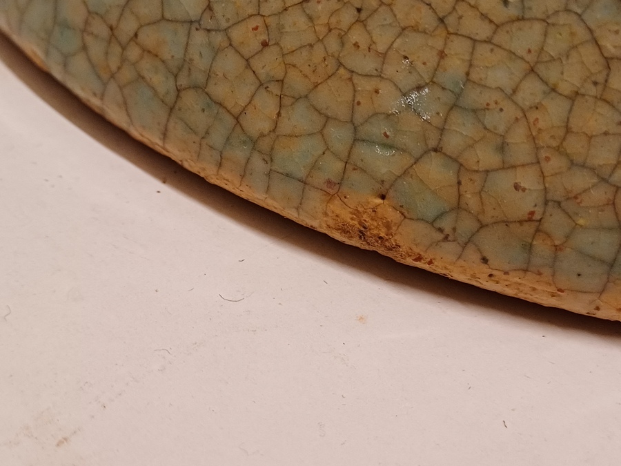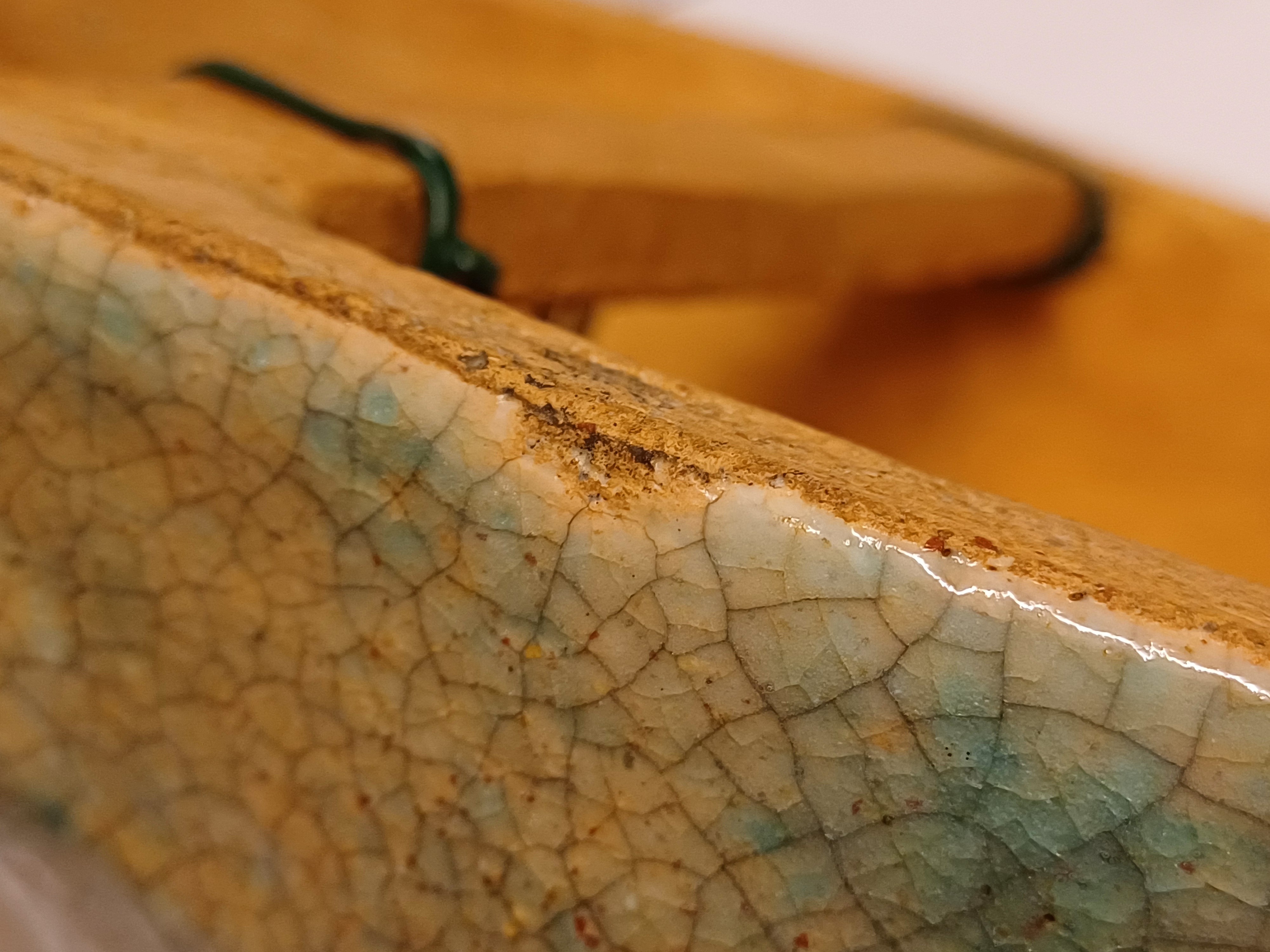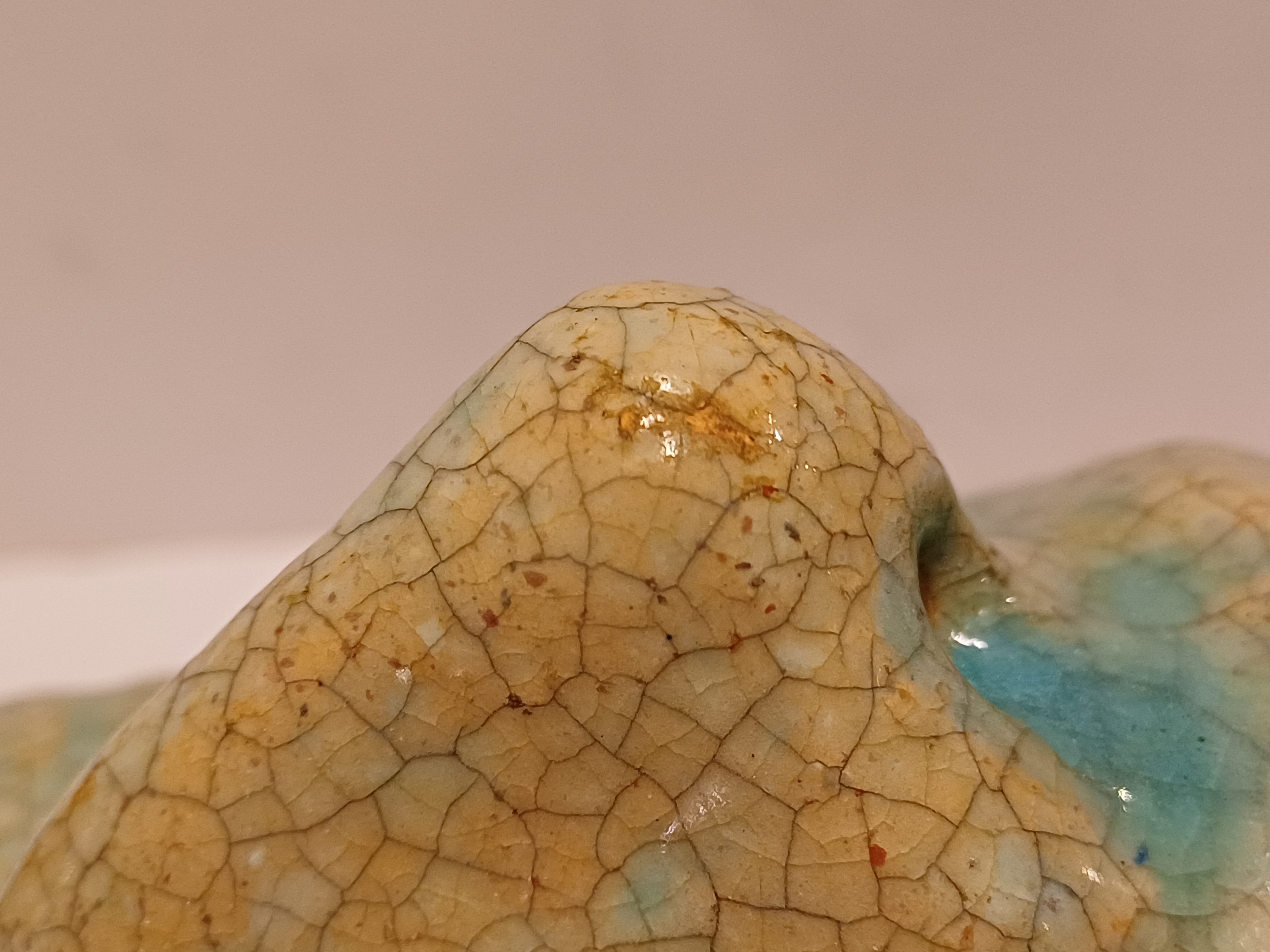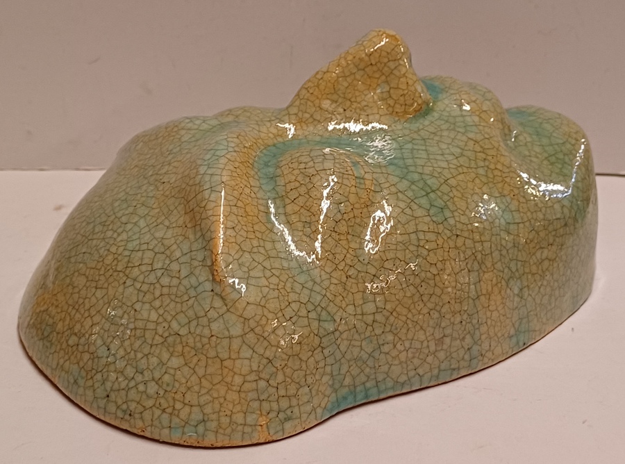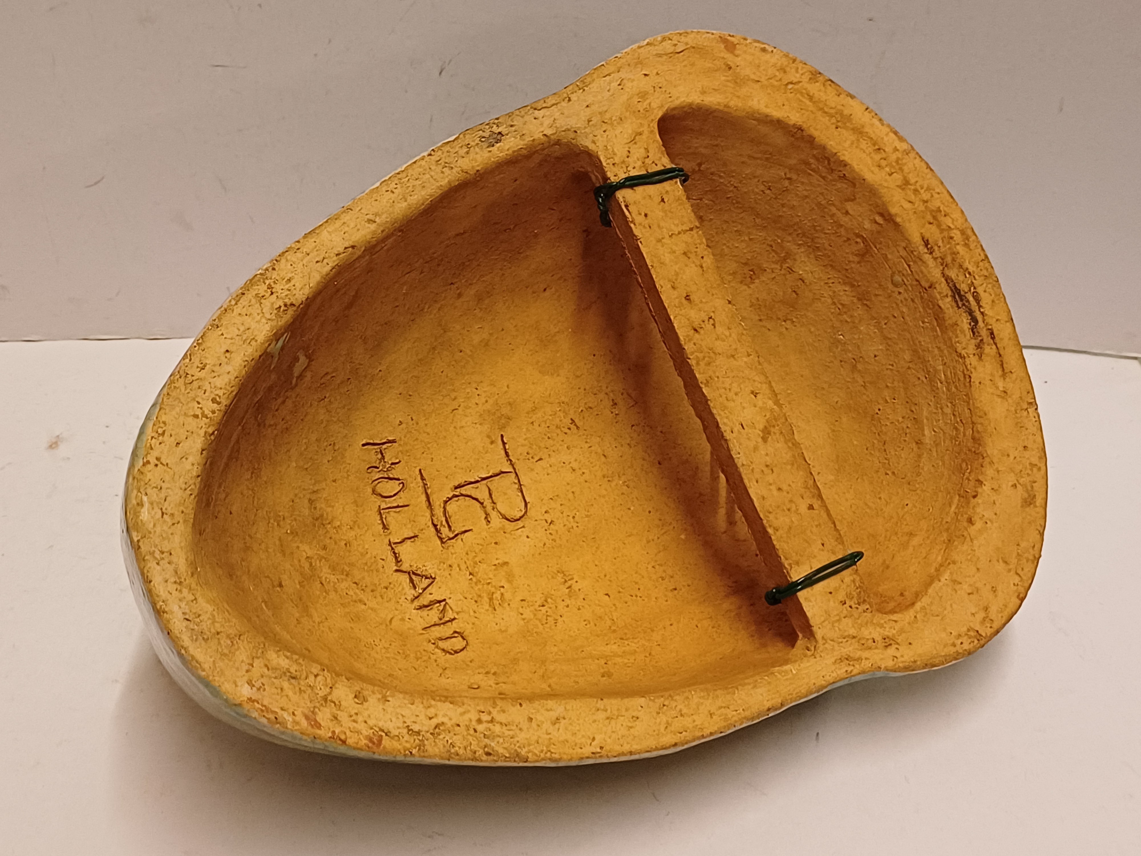 Aardewerken masker van een mannenkop met grote ogen, met fijne blauwe gecraqueleerde glazuur. Achterzijde gesigneerd PG Holland.