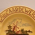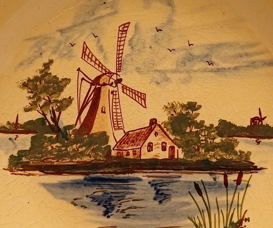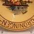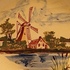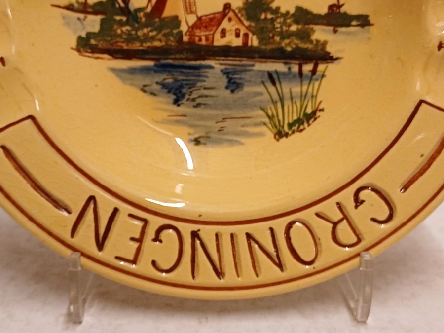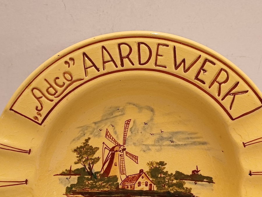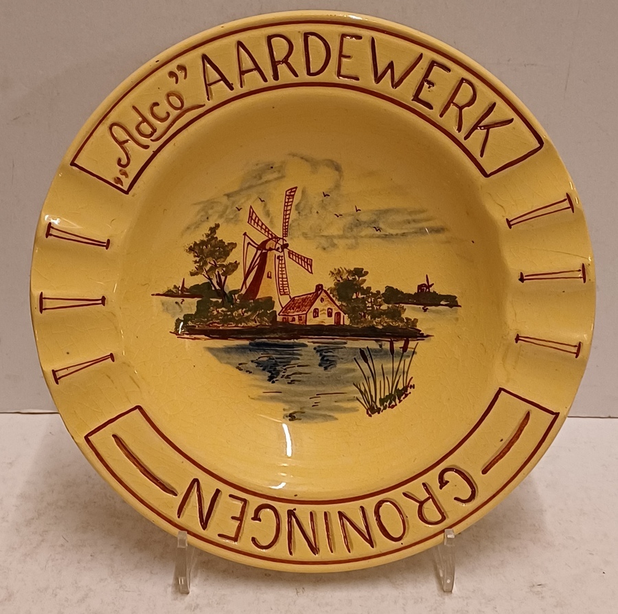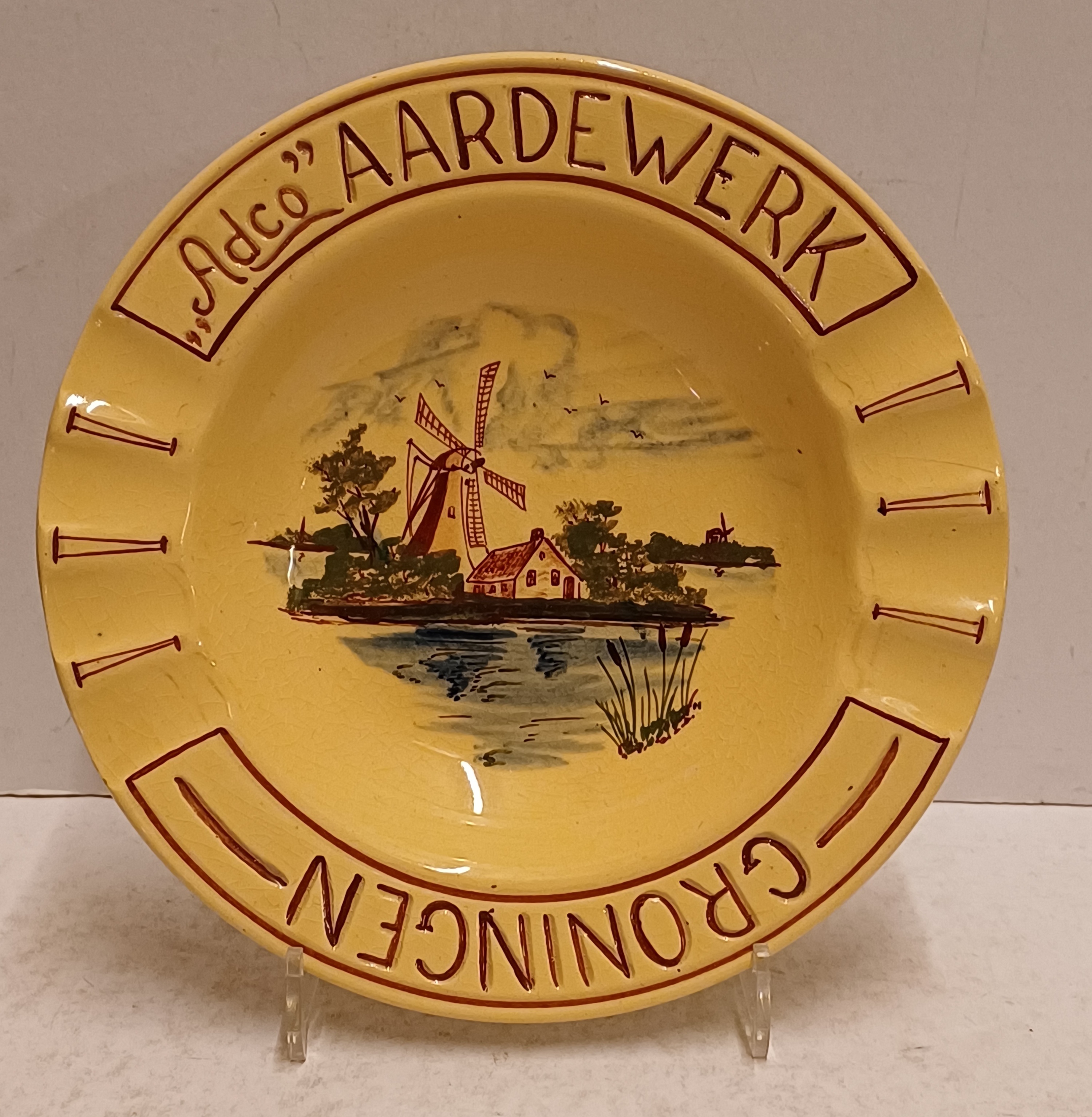 Aardewerken asbek met reclame tekst Adco's Aardewerk Groningen met decor van een landschap met molen.