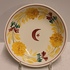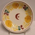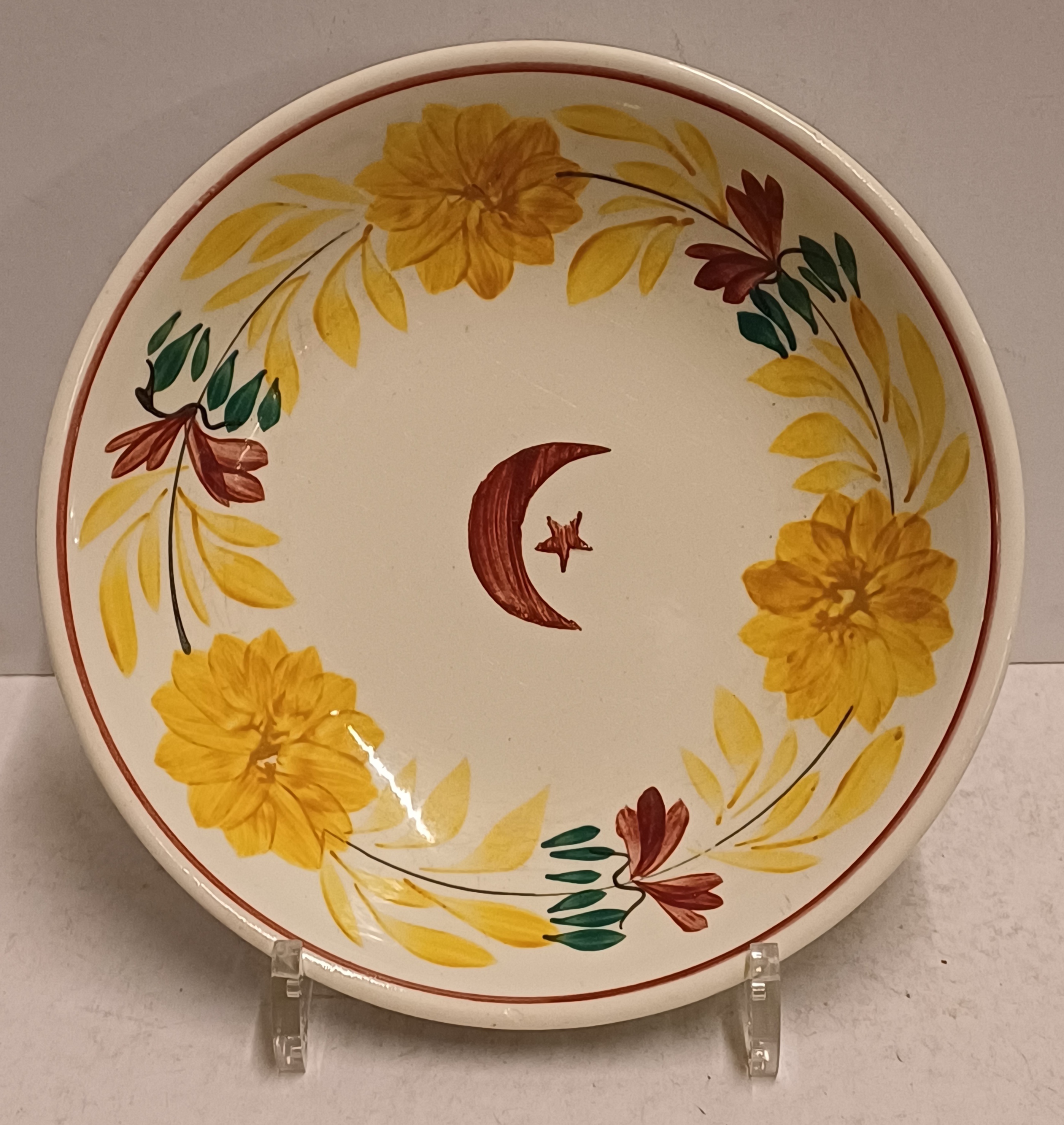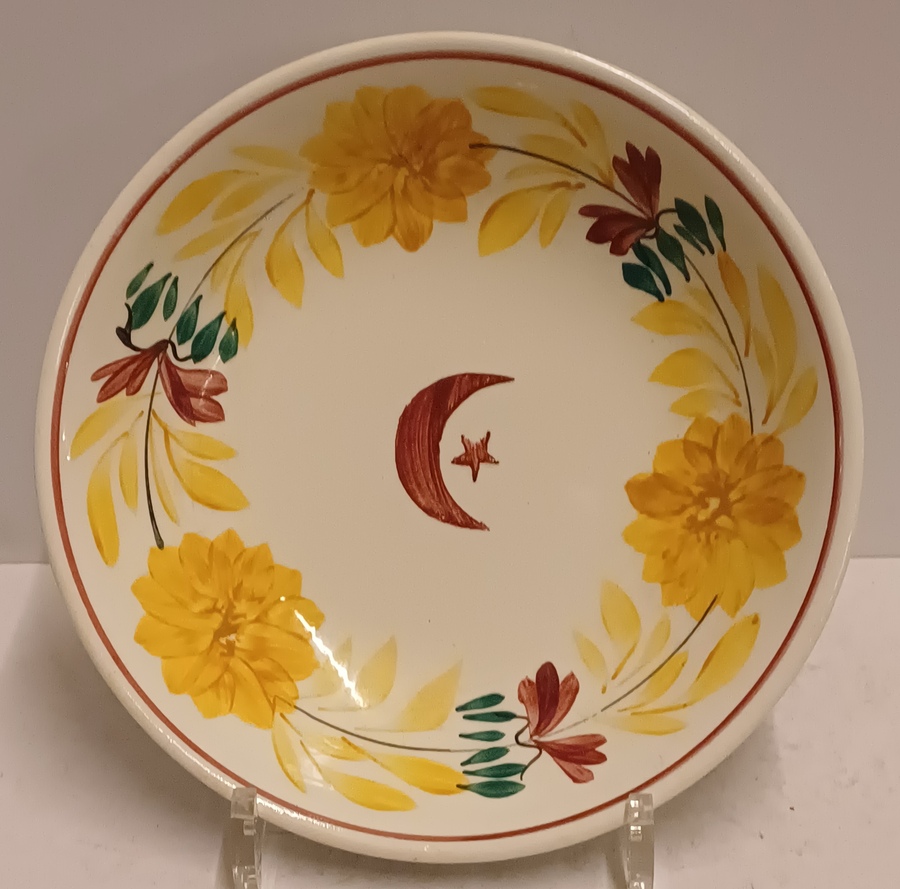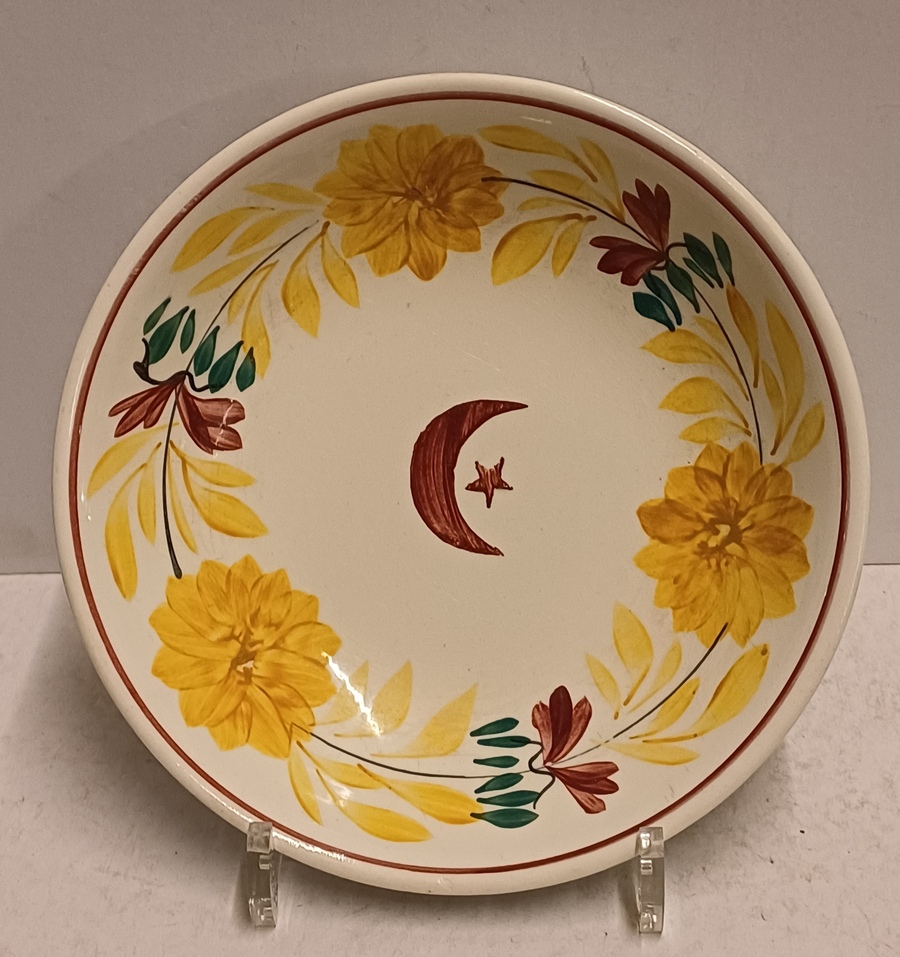 Plato de cerámica con decoración en ocre, rojo y verde, con media luna y estrella en el centro. En la parte trasera lleva la marca de fábrica.