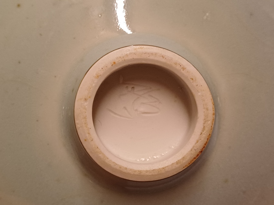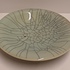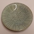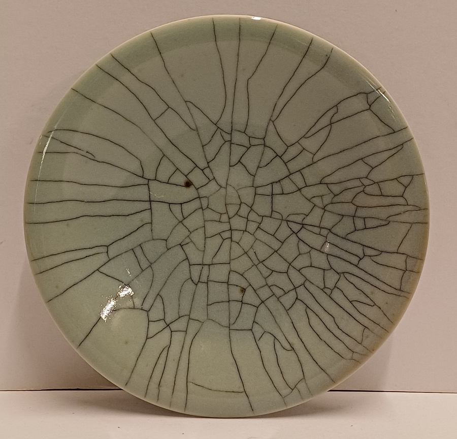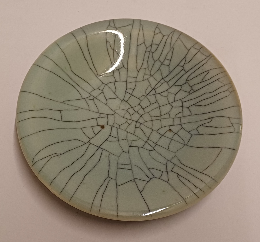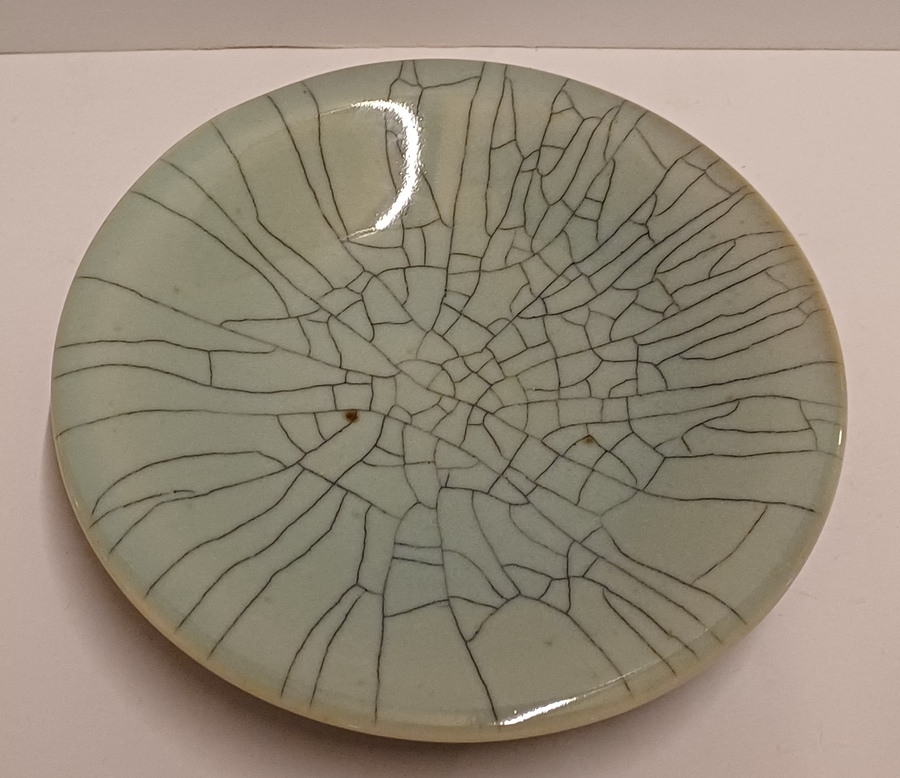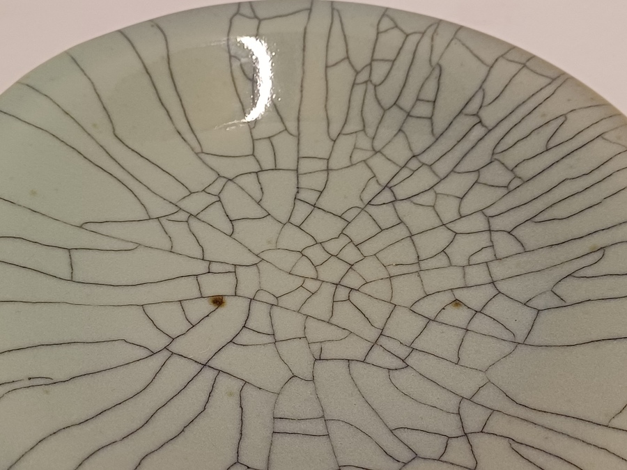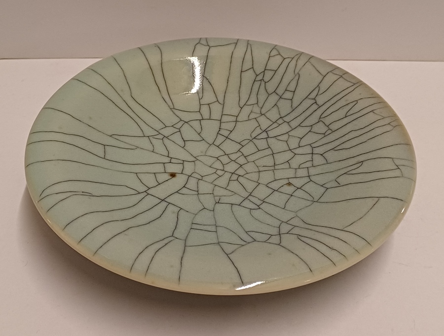 Steengoed schaal in blauw groene celadon glazuur met dikke zwarte craquele lijnen. Onderzijde met kunstenaars monogram.
