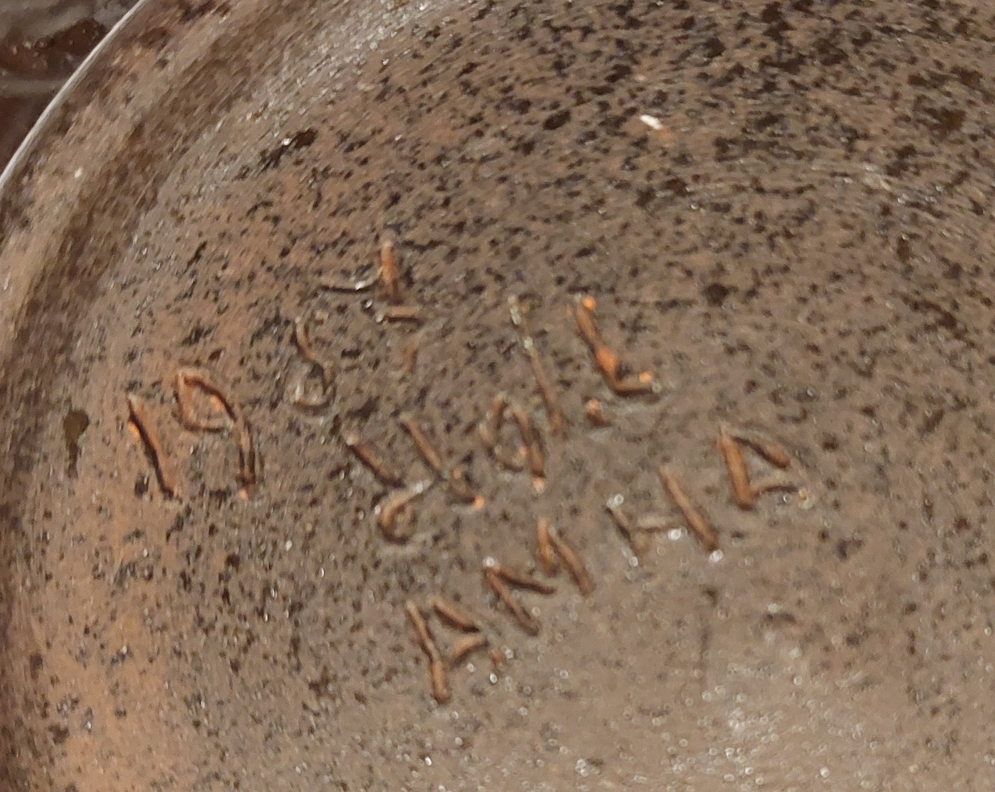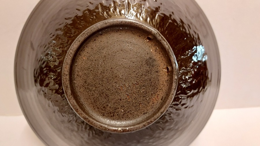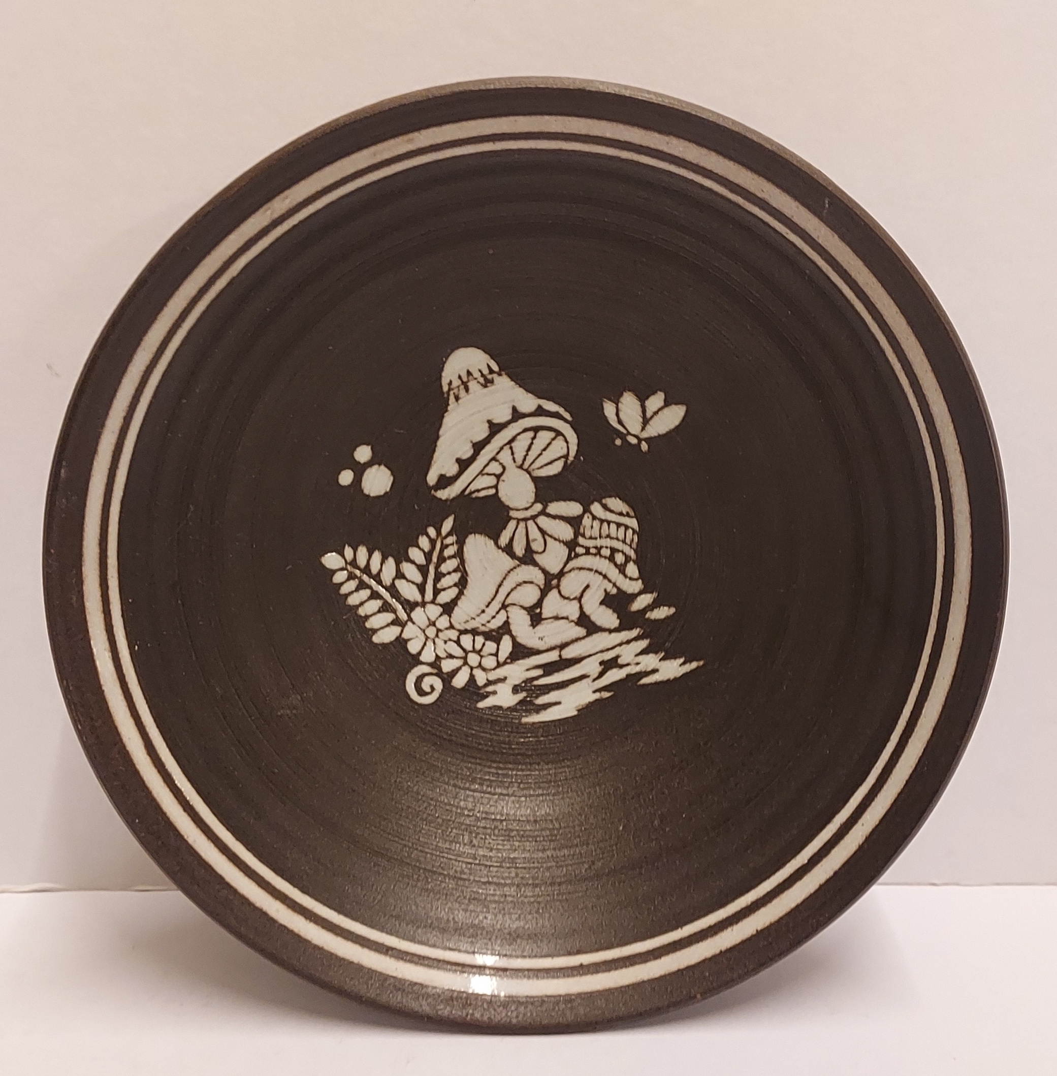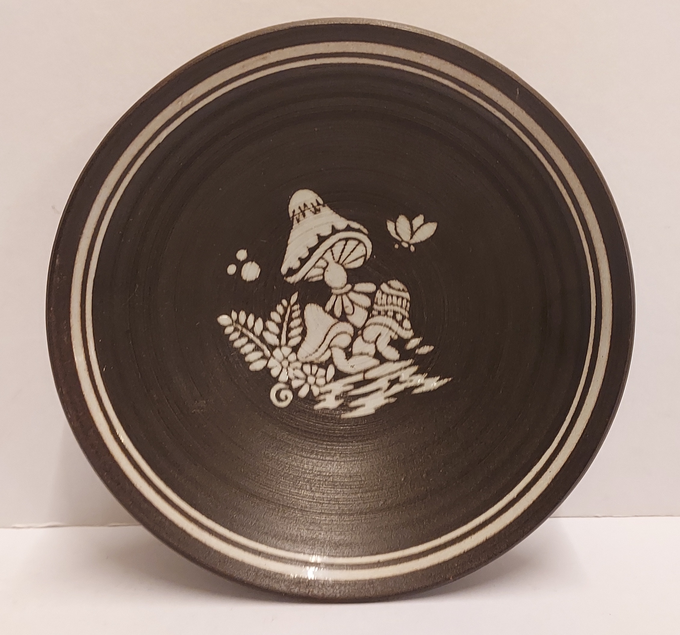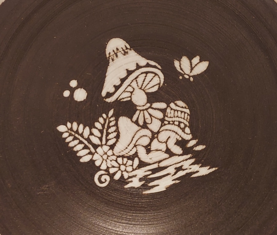 Arcilla de cocción roja con engobe oscuro decorado con setas. La parte trasera lleva una marca.