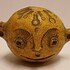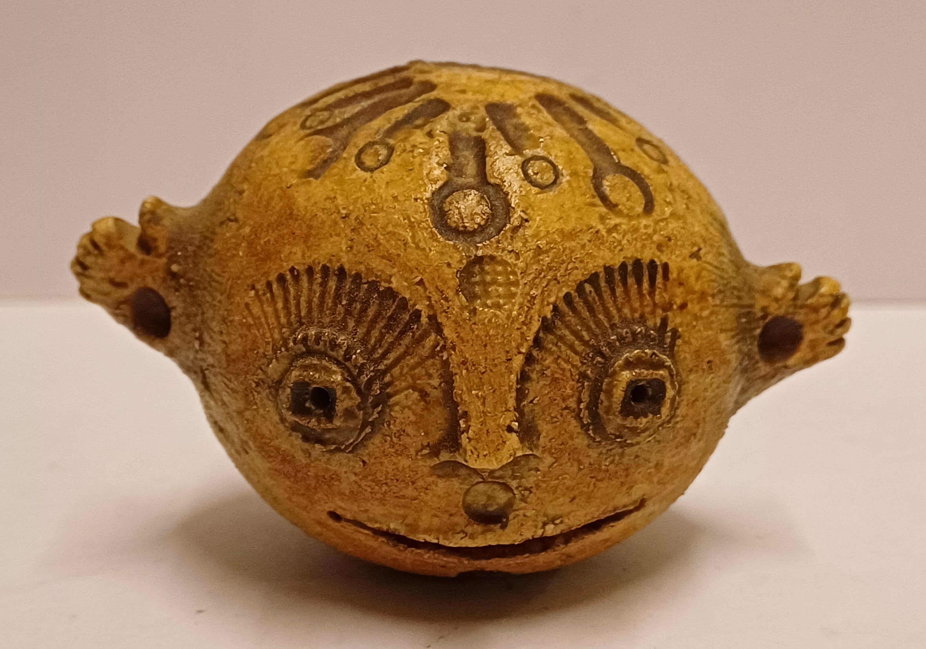 Klein sculptuur van een gezichtje met handjes met bruine glazuur. Niet gesigneerd