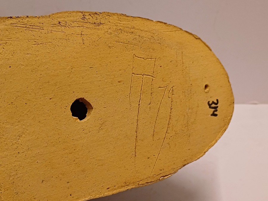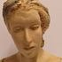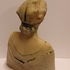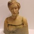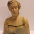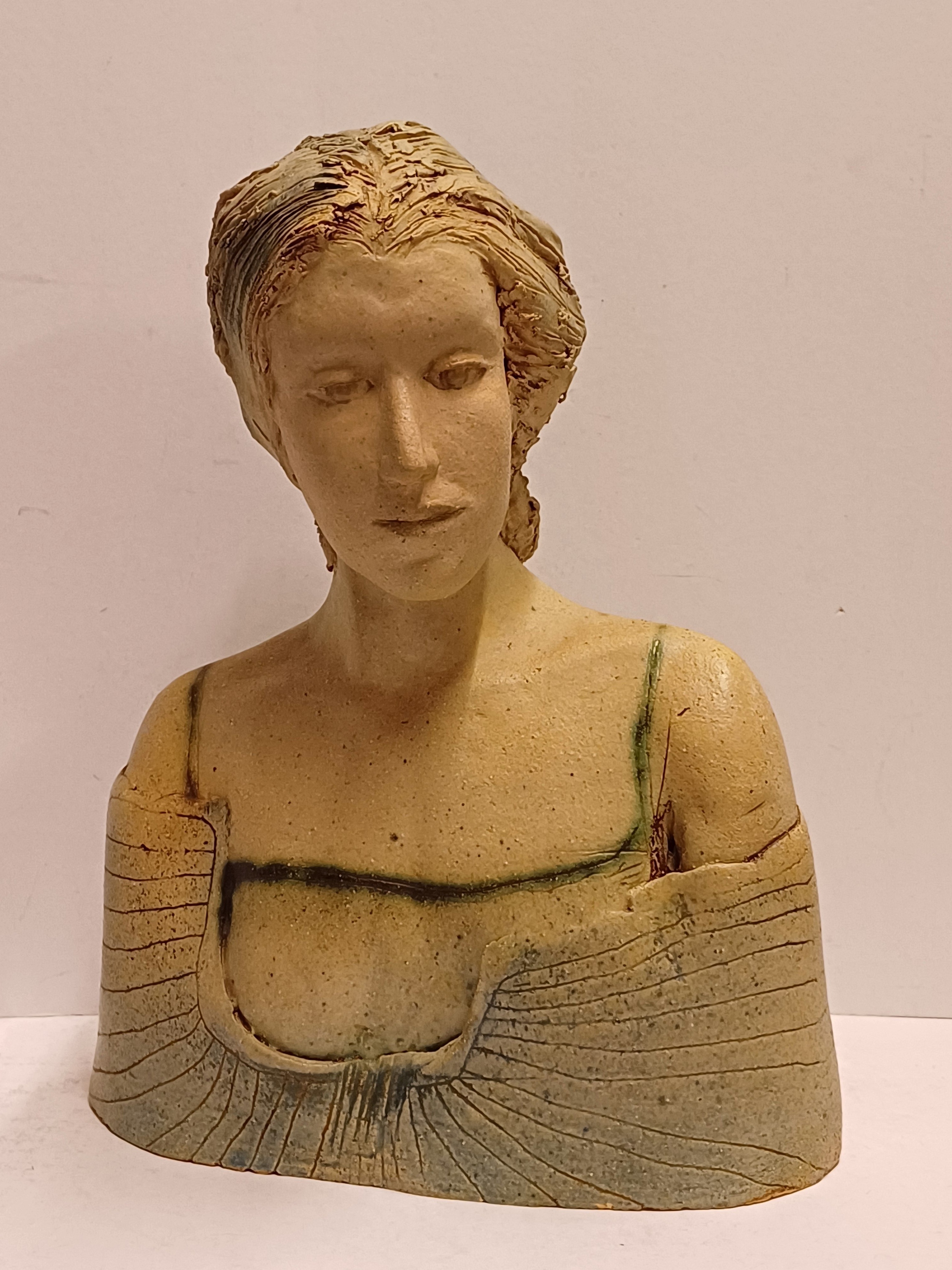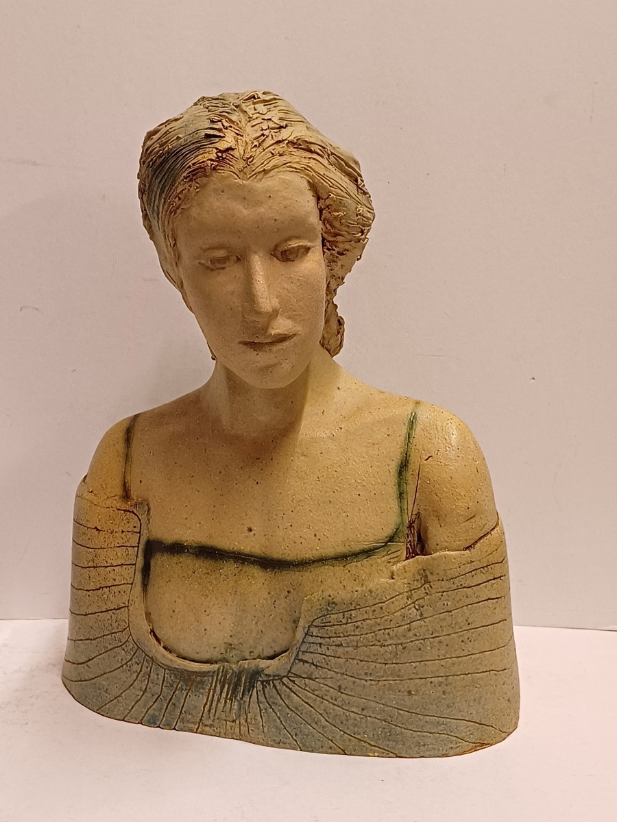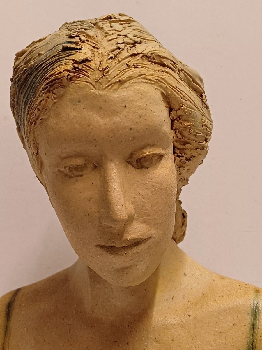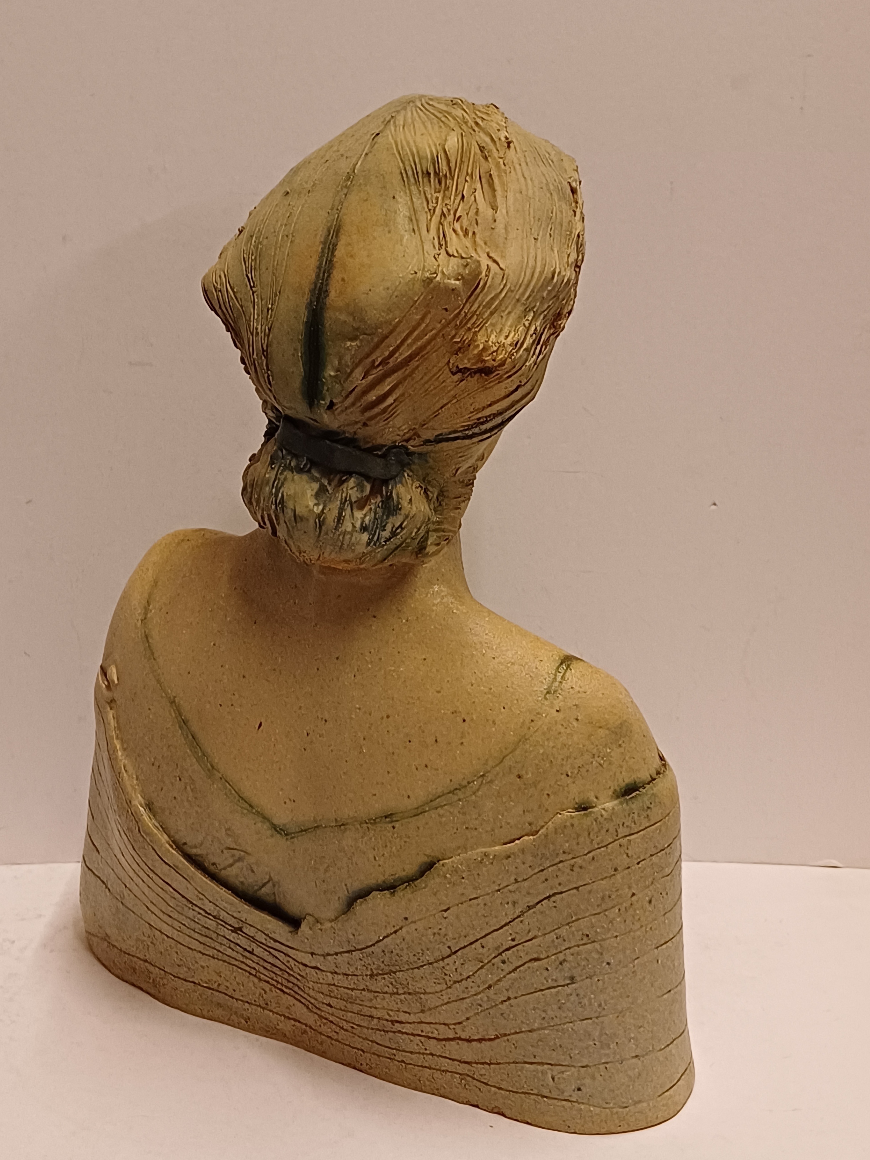 Aardewerken buste van een jonge vrouw met groen bruine glazuur. Onderzijde met monogram en datering '79.