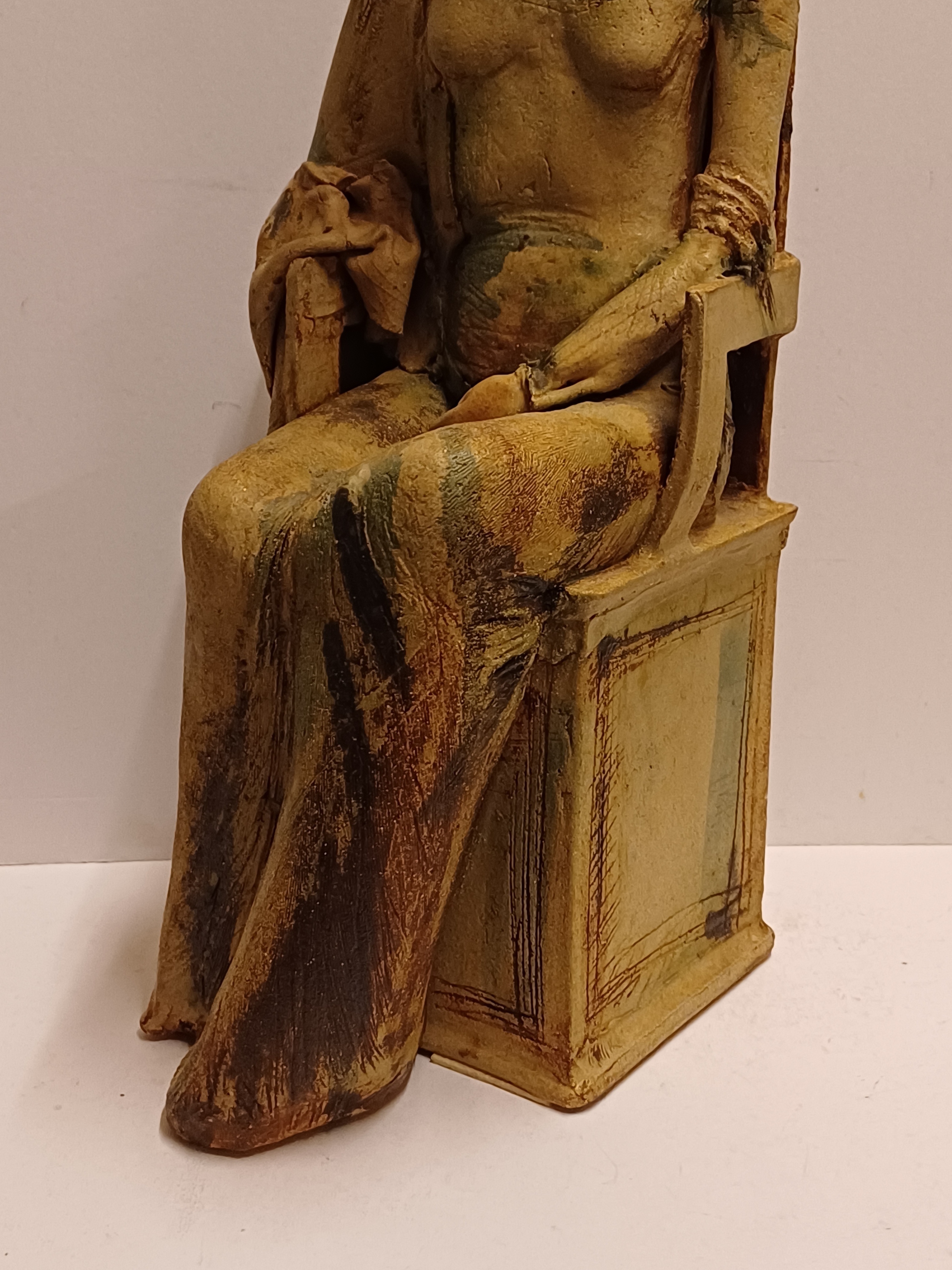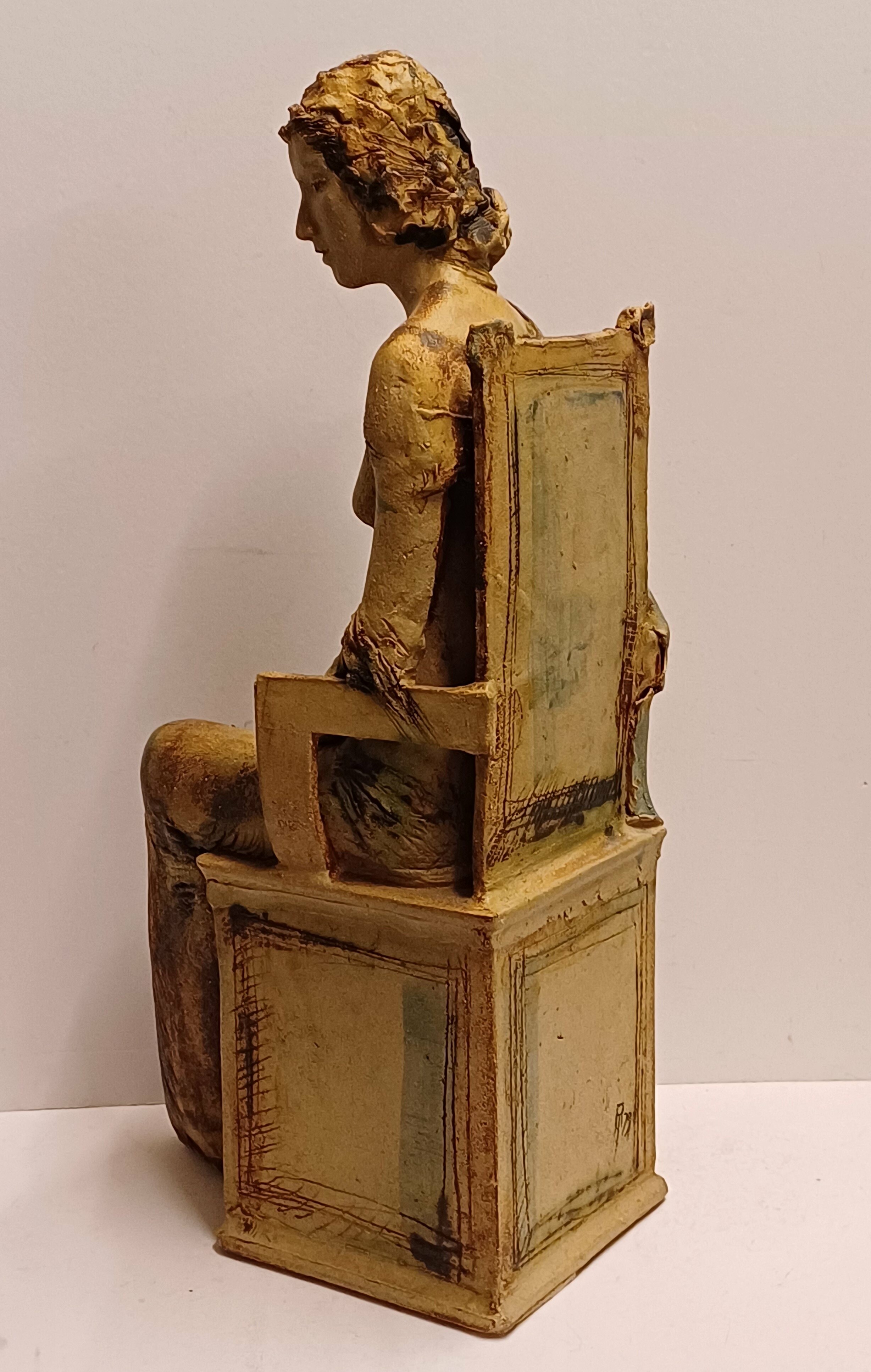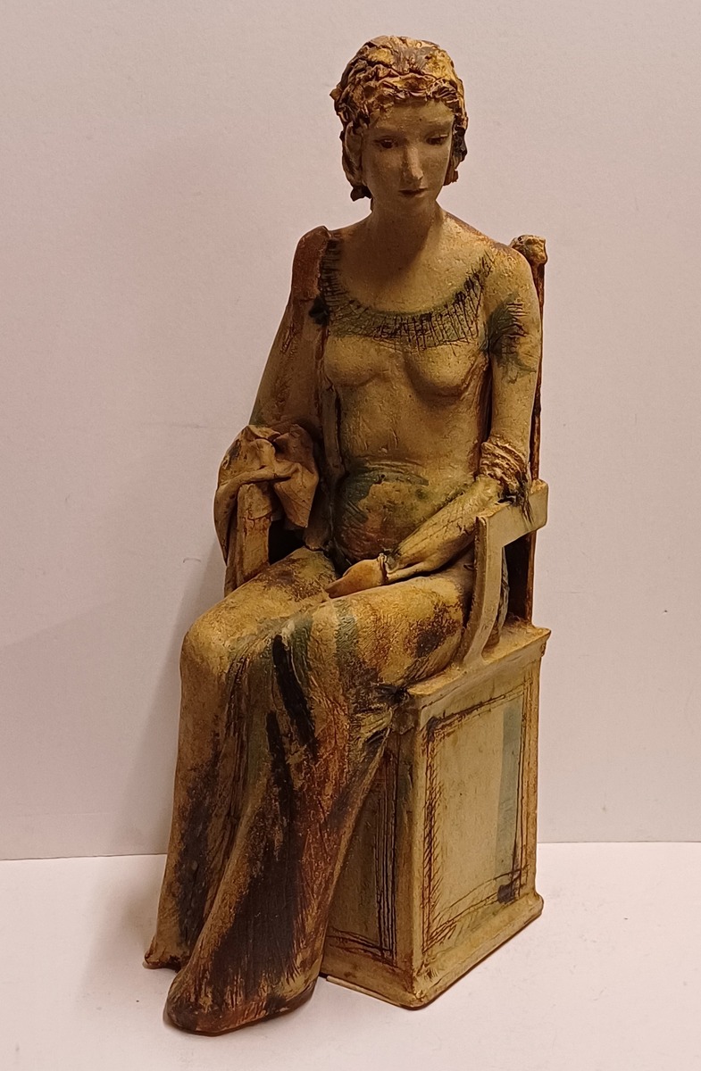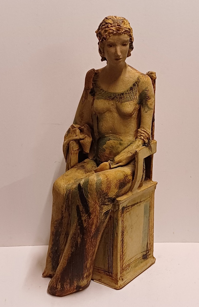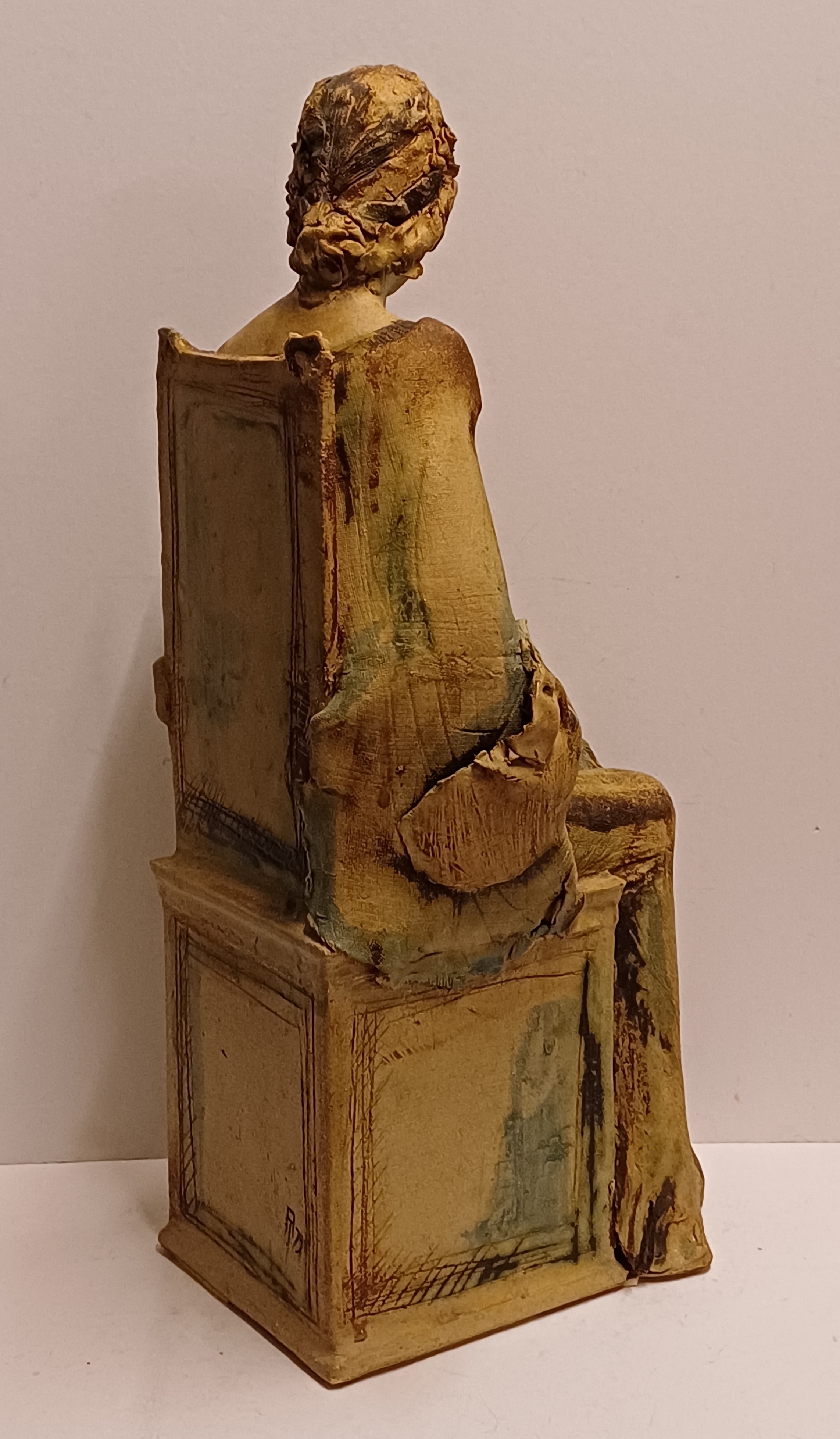 Escultura de gres de una dama sentada en una silla. Con esmalte verde marrón, firmada con monograma y '74.