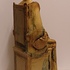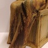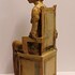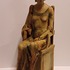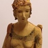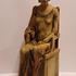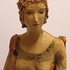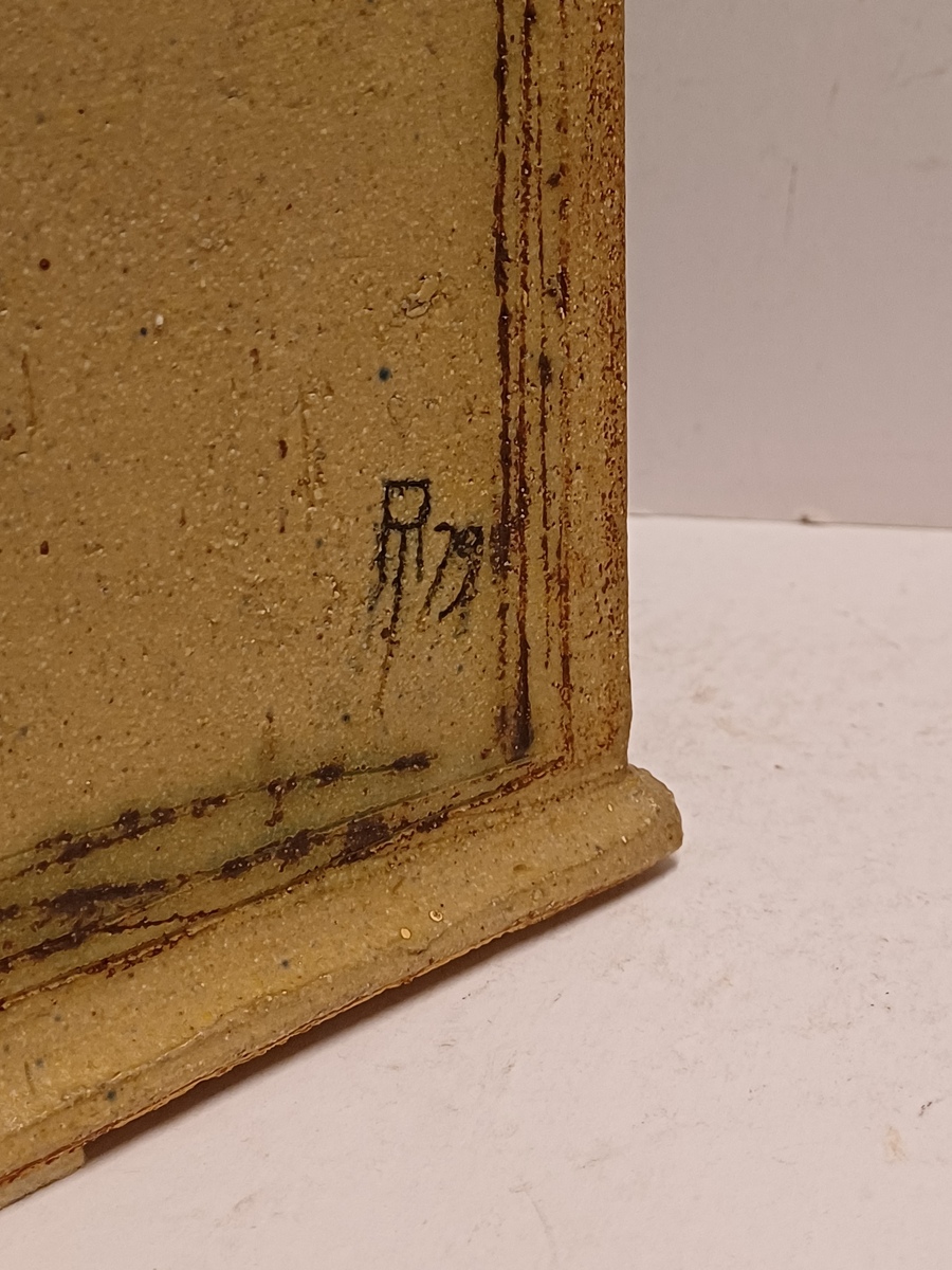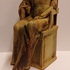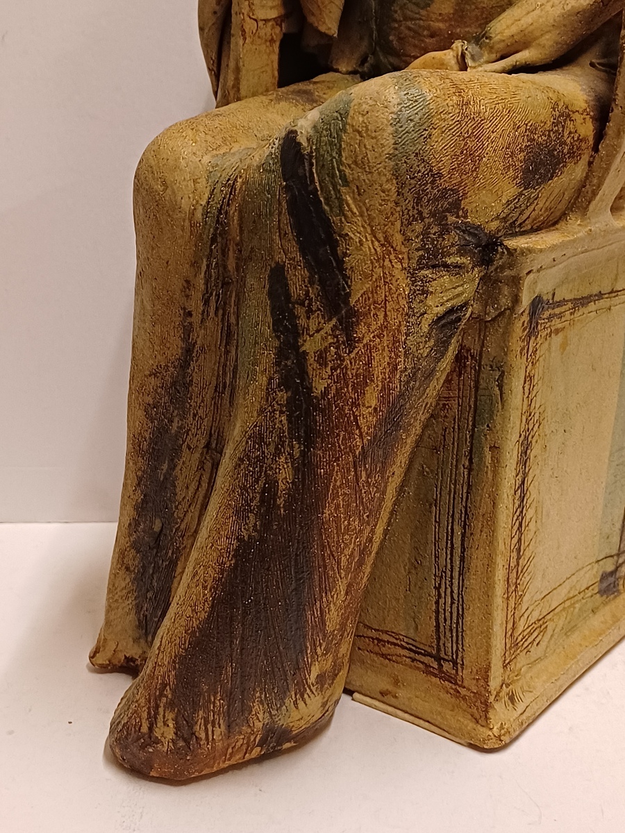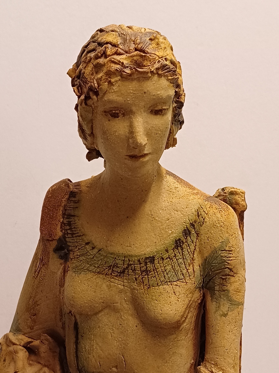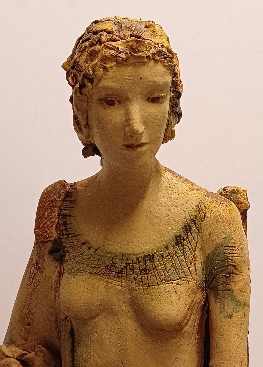 Escultura de gres de una dama sentada en una silla. Con esmalte verde marrón, firmada con monograma y '74.