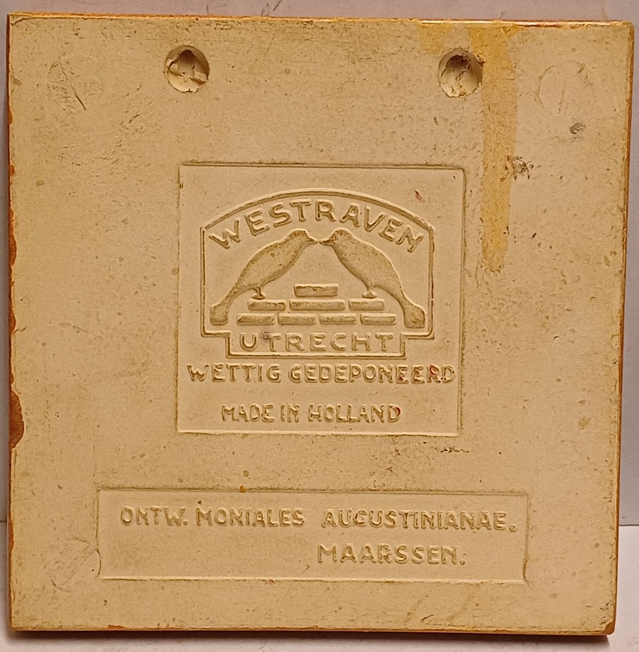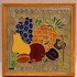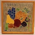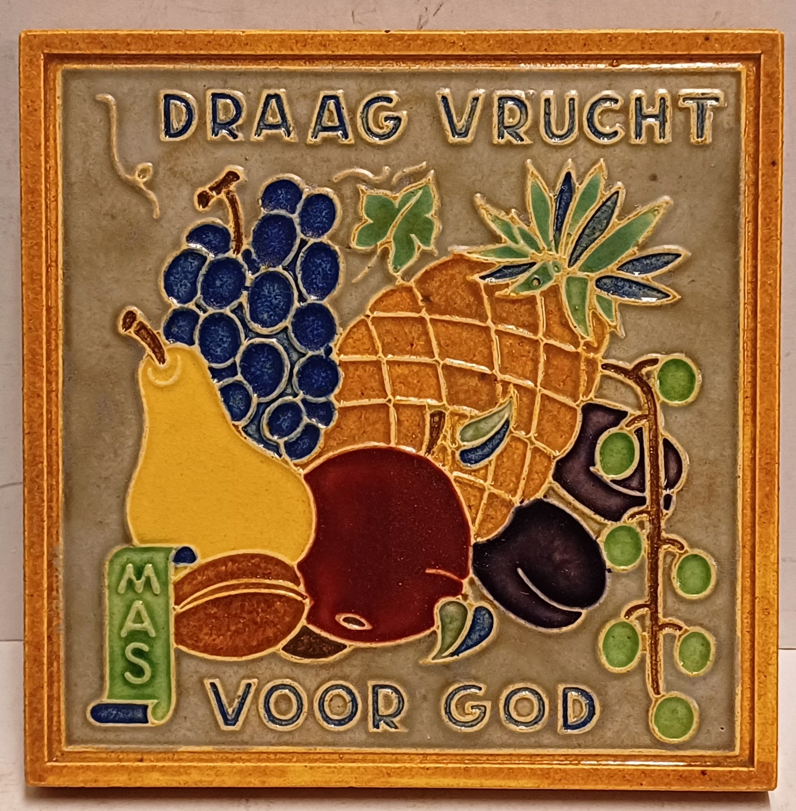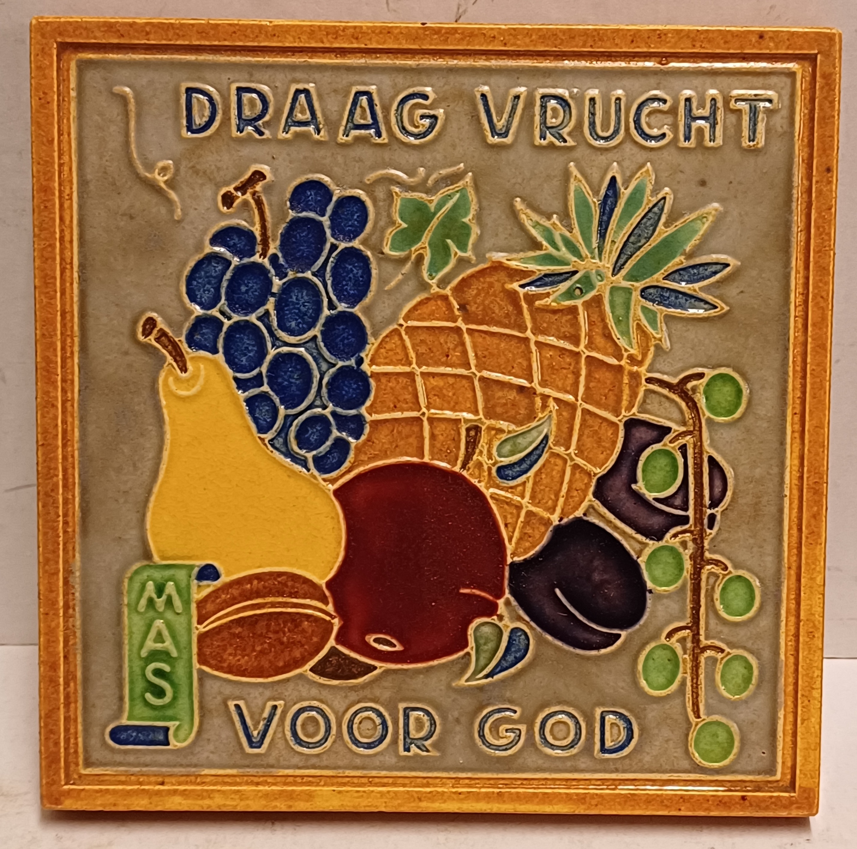 Cloissone tegel met decor van vruchten en de tekst. Uitvoering westraven Utrecht