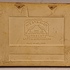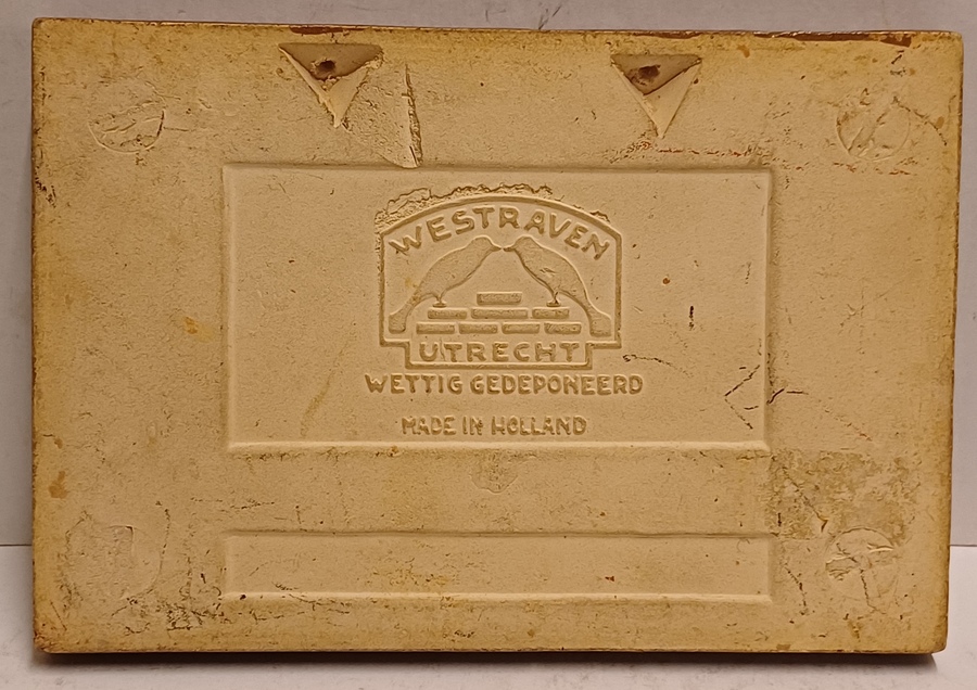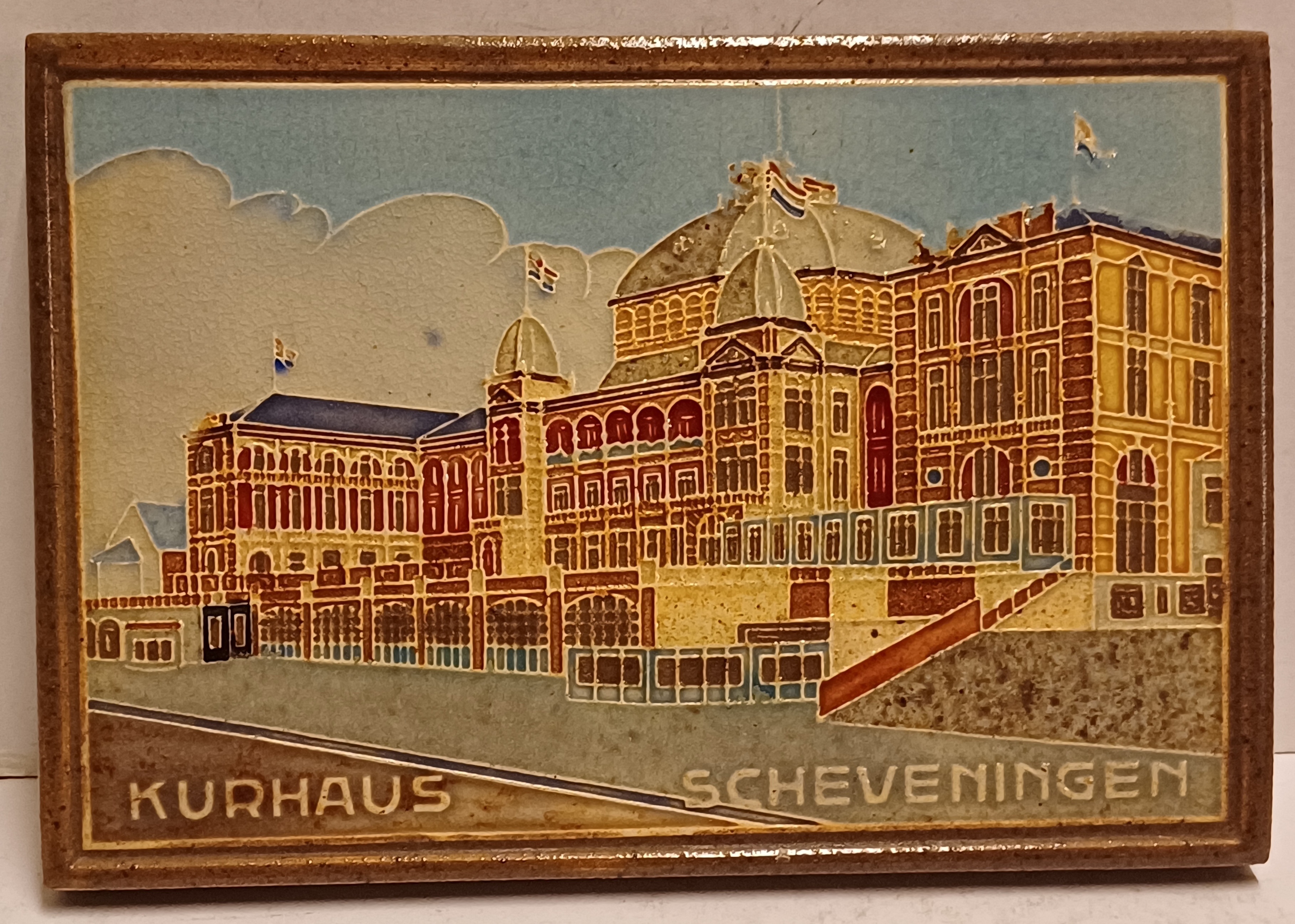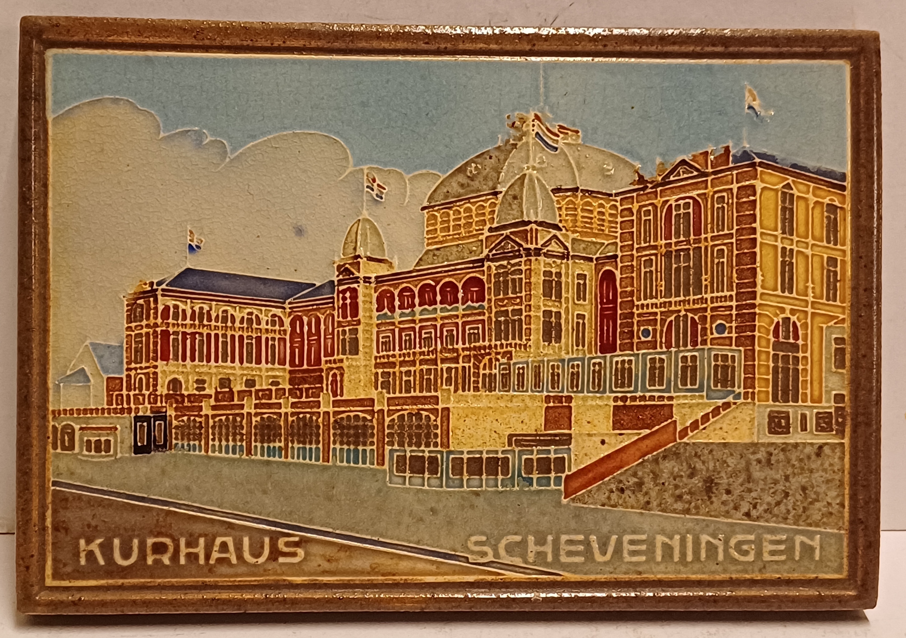Liggende aardewerken tegel met cloisonne voorstelling van het Kurhaus te Scheveningen. Achterzijde met fabrieksmerk.