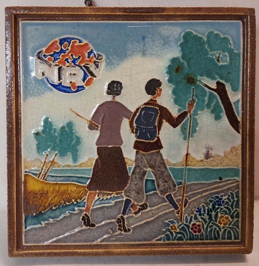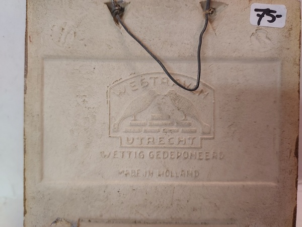 Representación de 2 caminantes en un paisaje. Parte trasera marcada con Westraven.