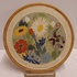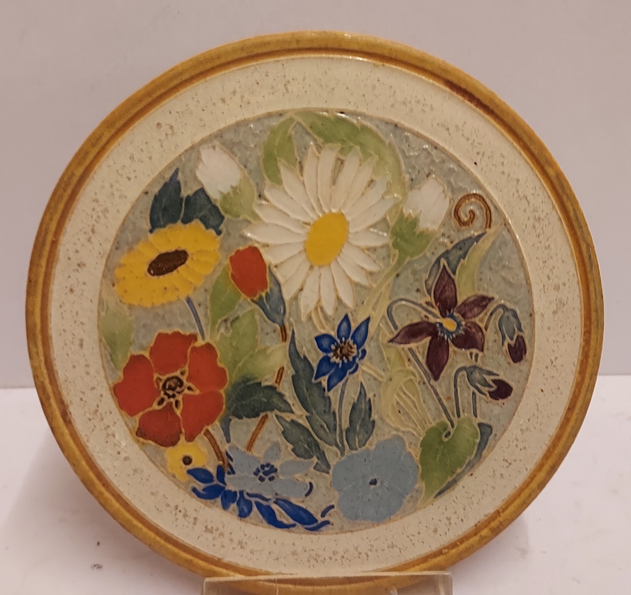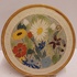 Representación de flores con borde beige y amarillo ocre. Parte trasera con marca de fábrica.