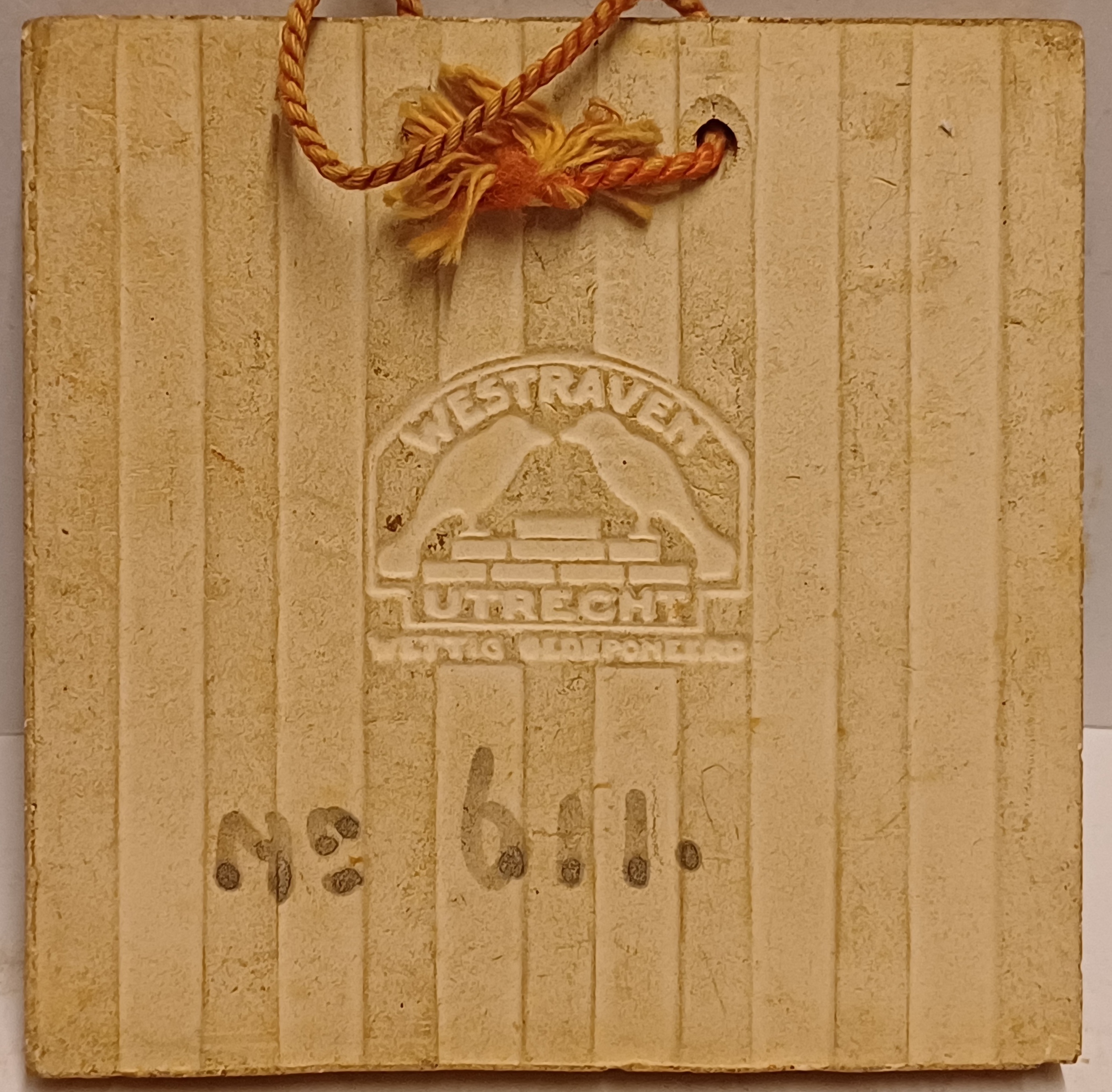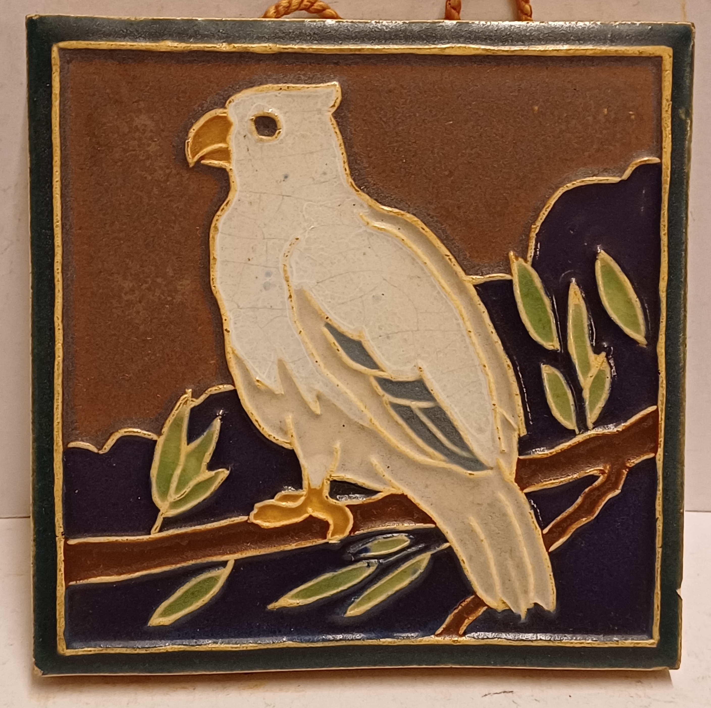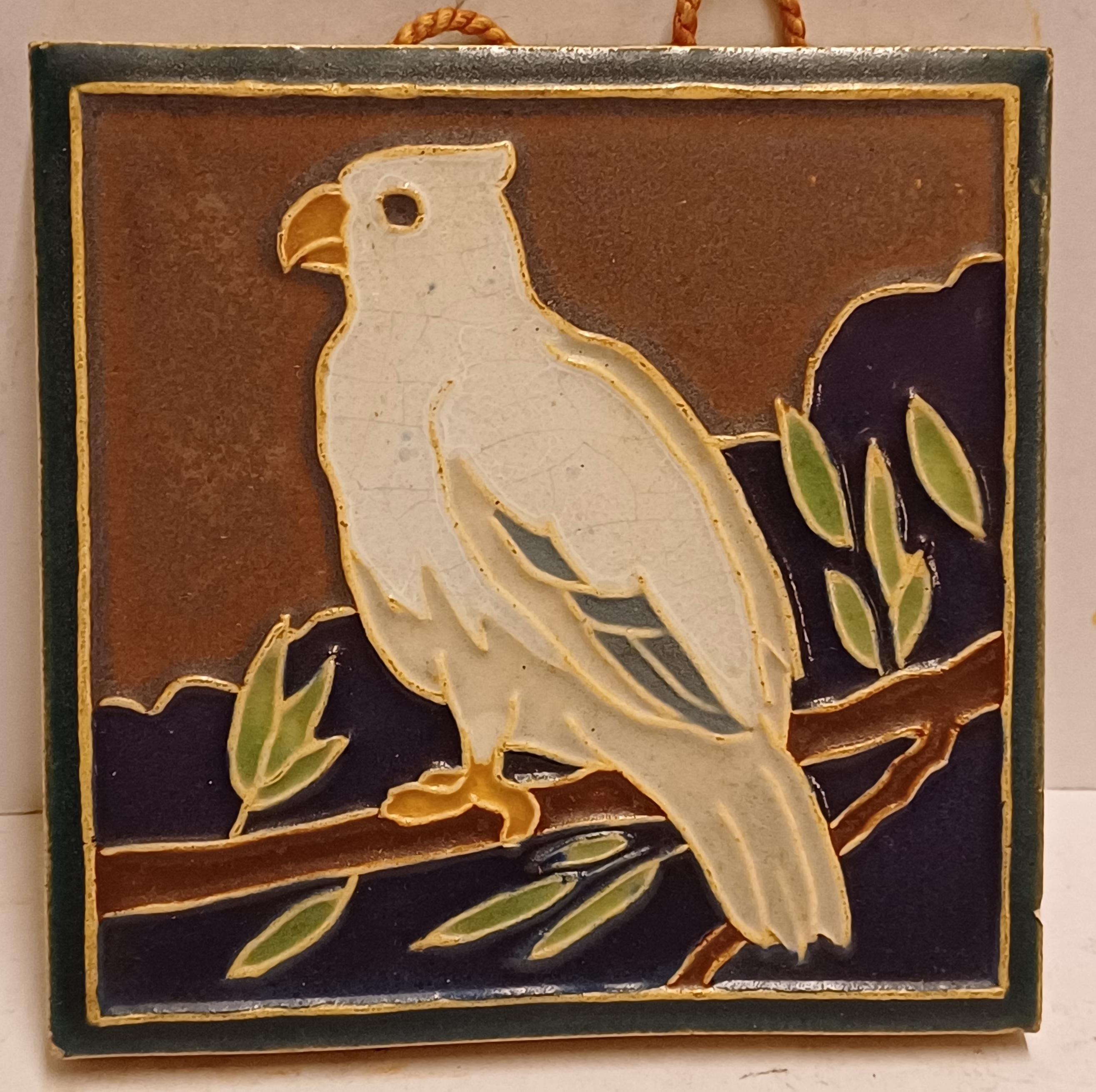 Cloisonne tegel met decor van roofvogel op tak. Achterzijde met fabrieksmerk.