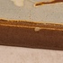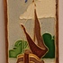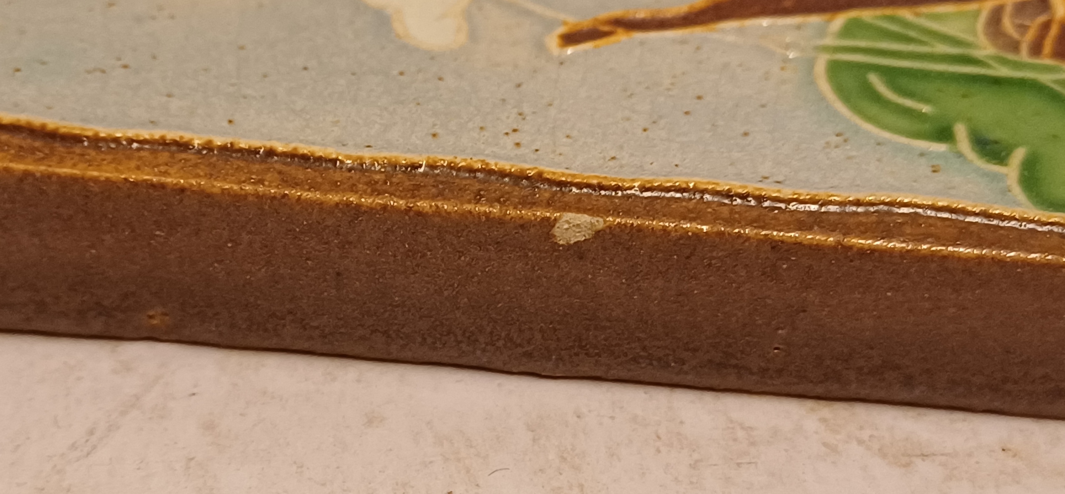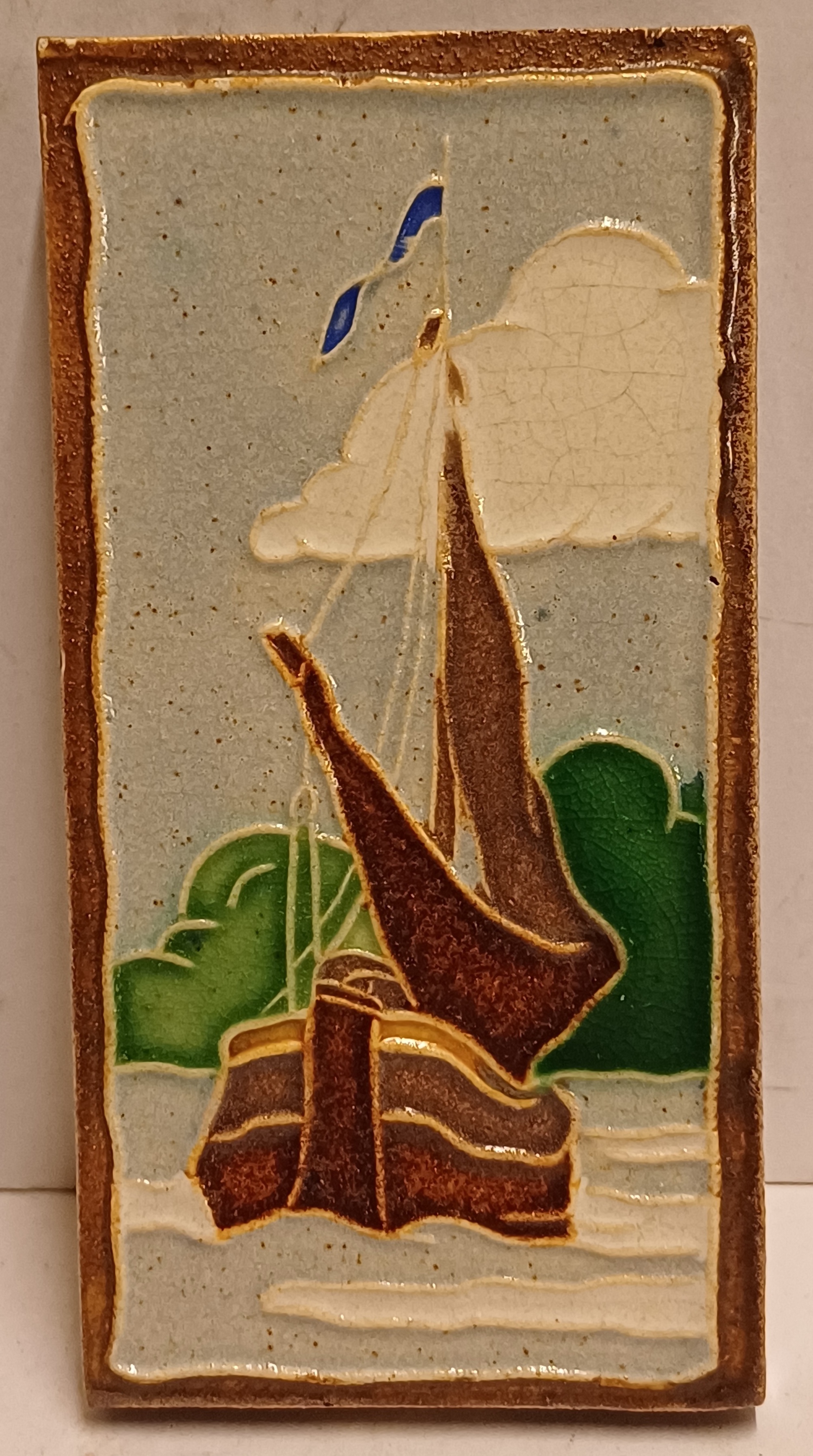 Azulejo estrecho de cloisonné con decoración de un barco. Reverso con marca de fábrica.