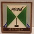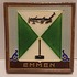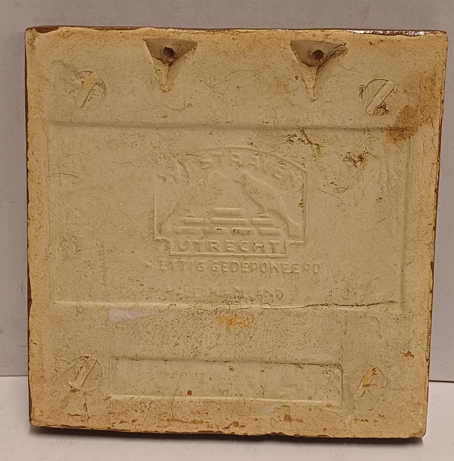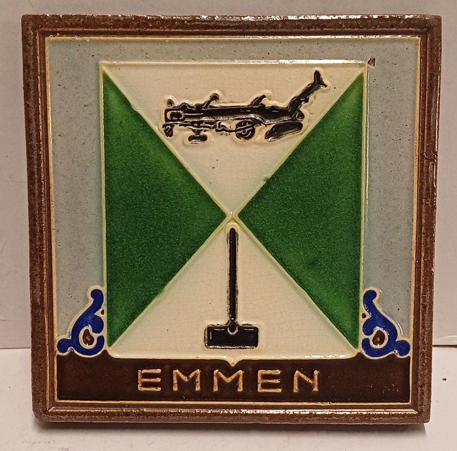 Aardewerken tegel met het stadswapen van de stad Emmen. Achterzijde met fabrieksmerk.