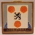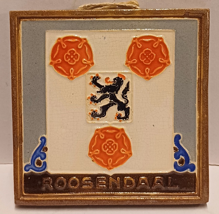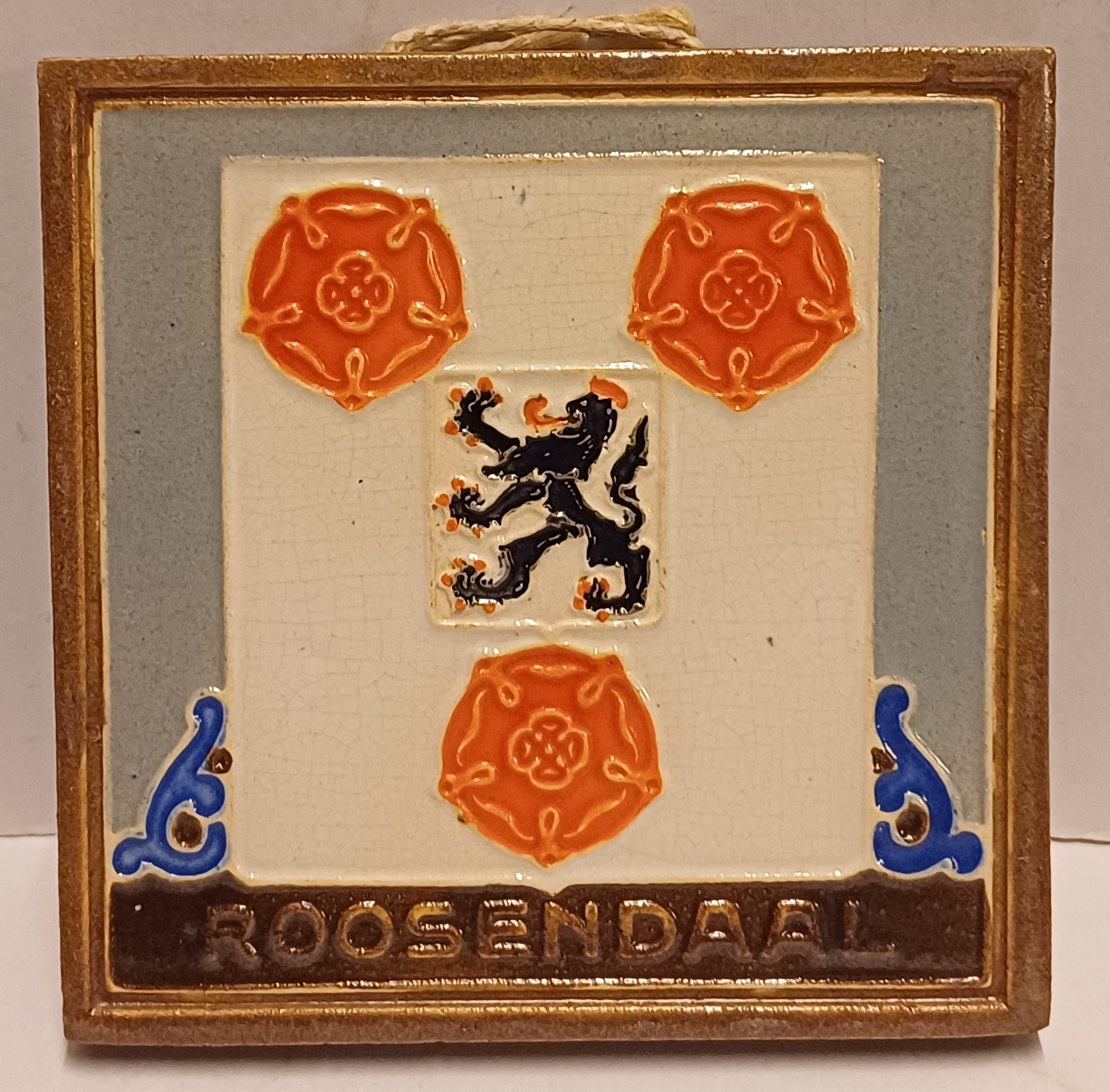 Aardewerken tegel met het stadswapen van de stad Roosendaal. Achterzijde met fabrieksmerk.