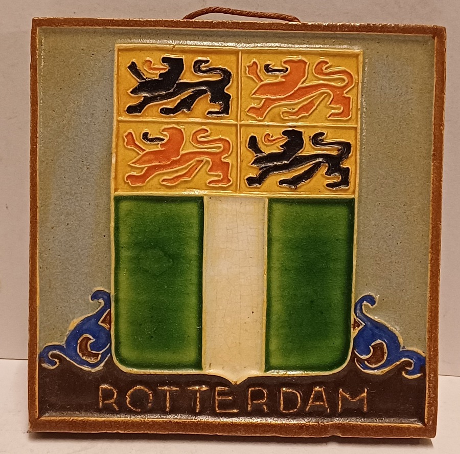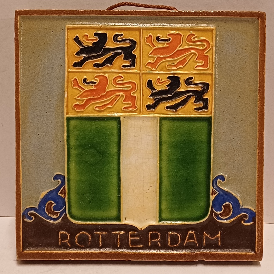 Aardewerken cloisonne tegel met het wapen van Rotterdam. Achterzijde met fabrieksmerk.