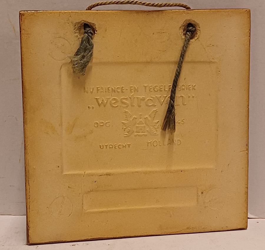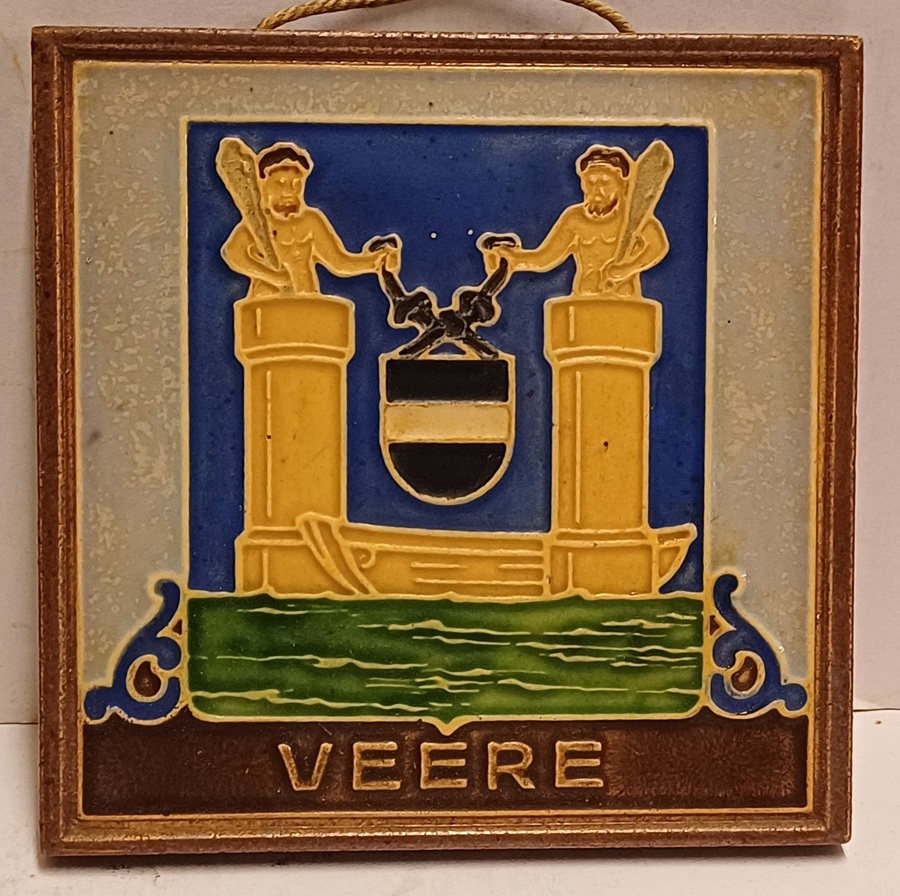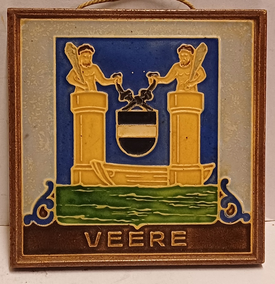 Aardewerken cloisonne tegel met het wapen van Veere. Achterzijde met fabrieksmerk.