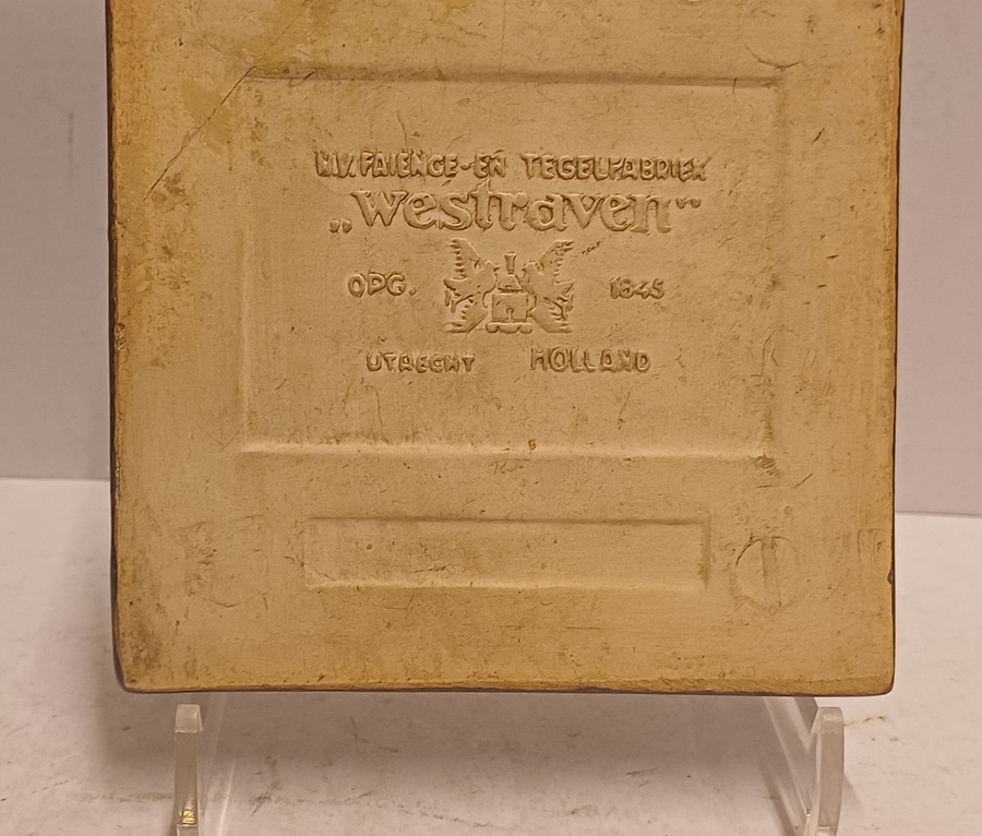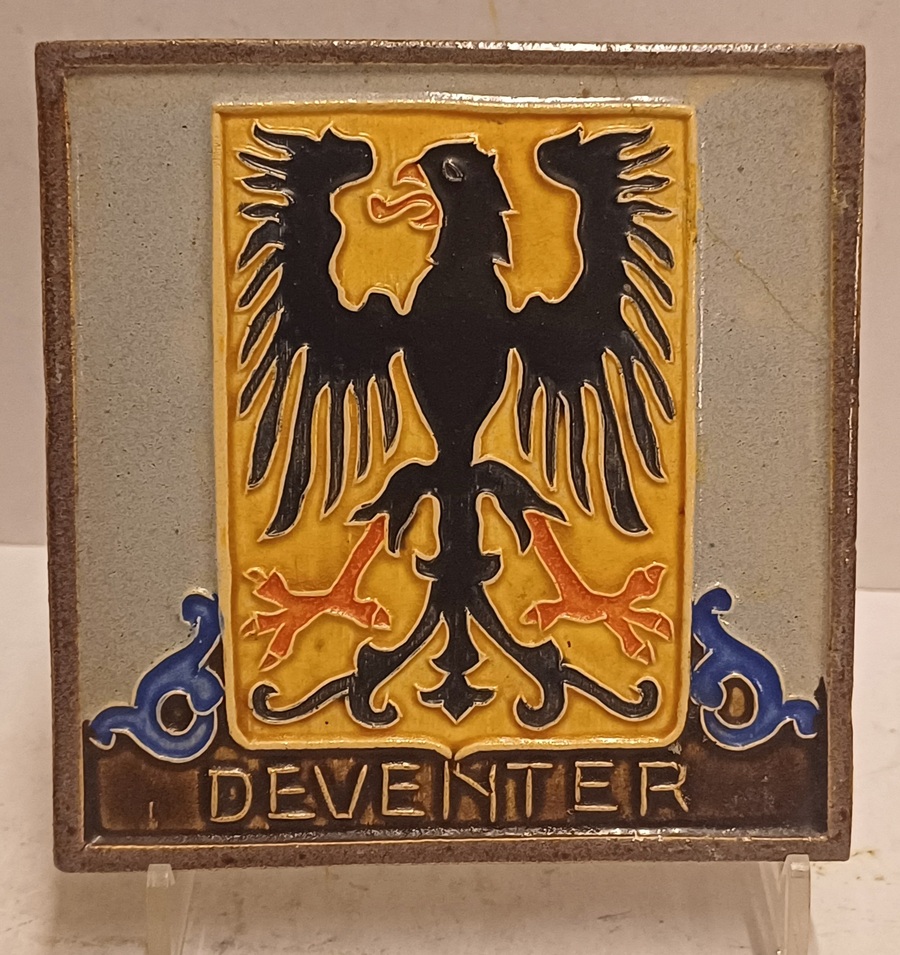 Aardewerken cloisonne tegel met het wapenschild van de stad Deventer. Achterzijde met fabrieksmerk.