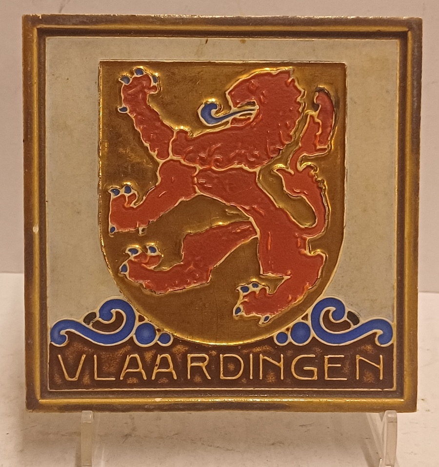 Aardewerken cloisonne tegel met het wapenschild van de stad Vlaardingen. Achterzijde met fabrieksmerk.