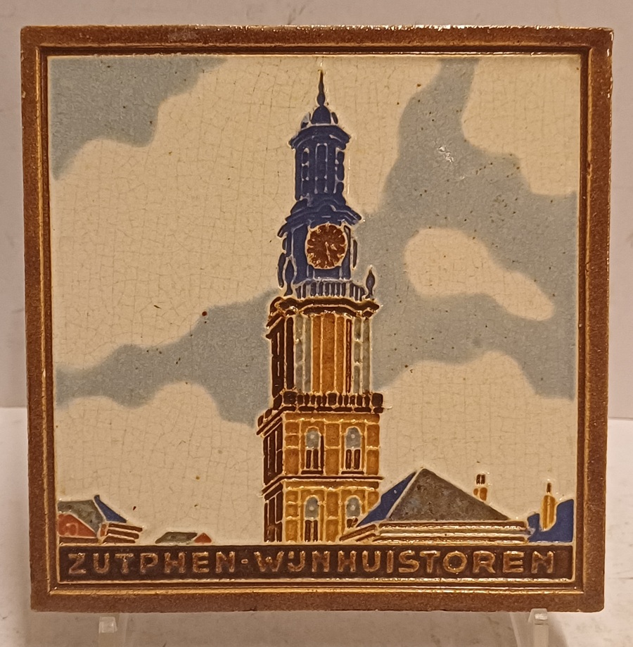 Cloisonne tegel met afbeelding van Wijhuistoren te Zutphen. Uitvoering Westravne Utrecht.