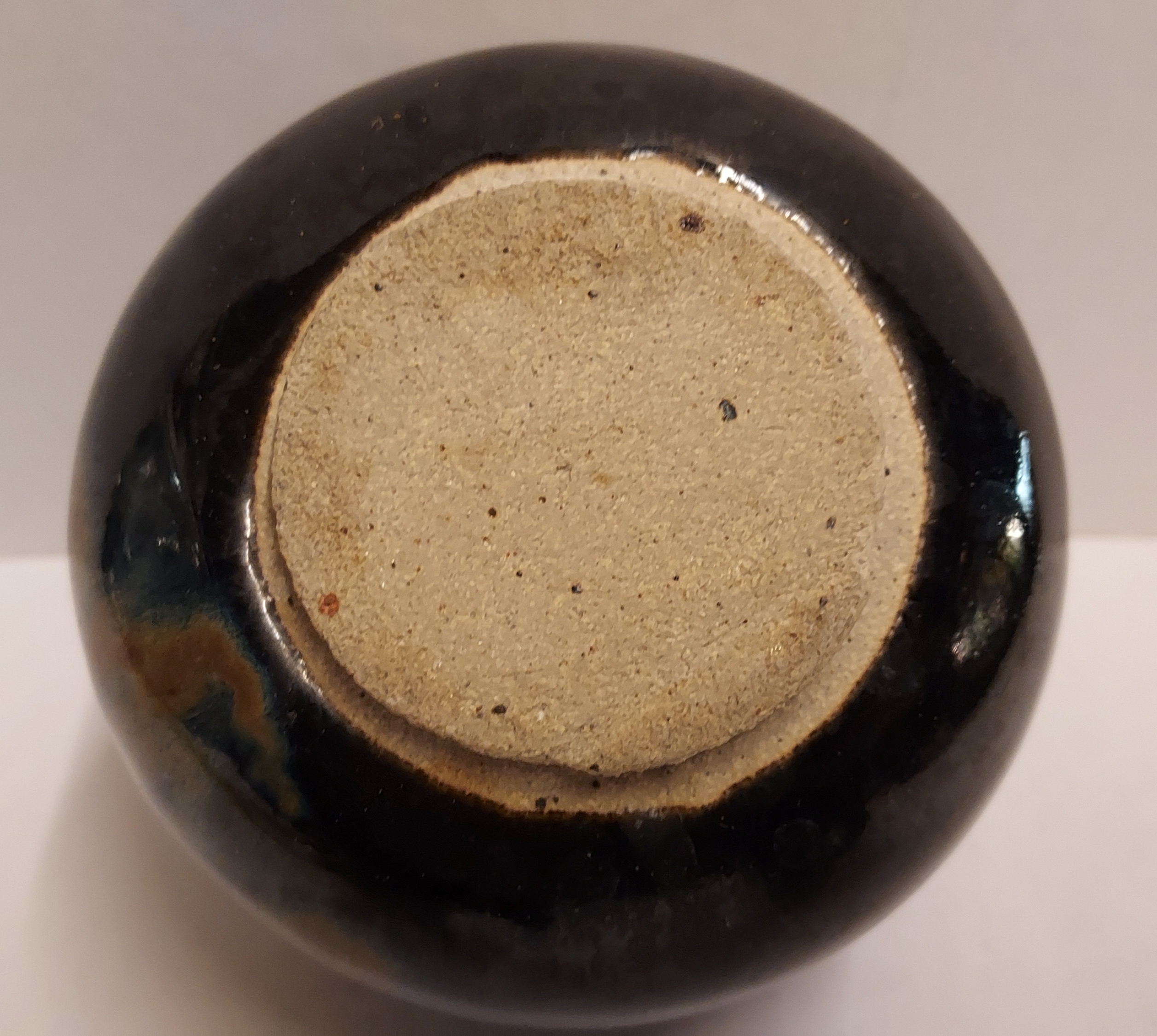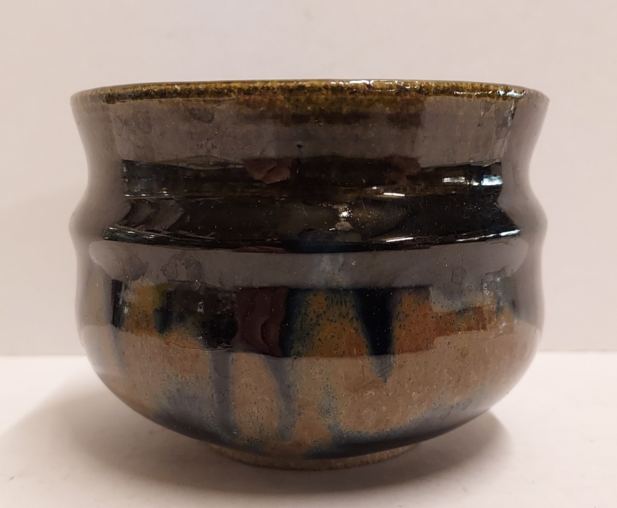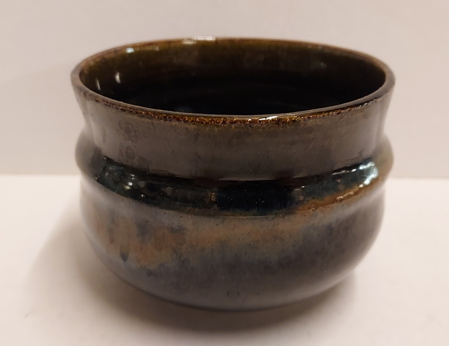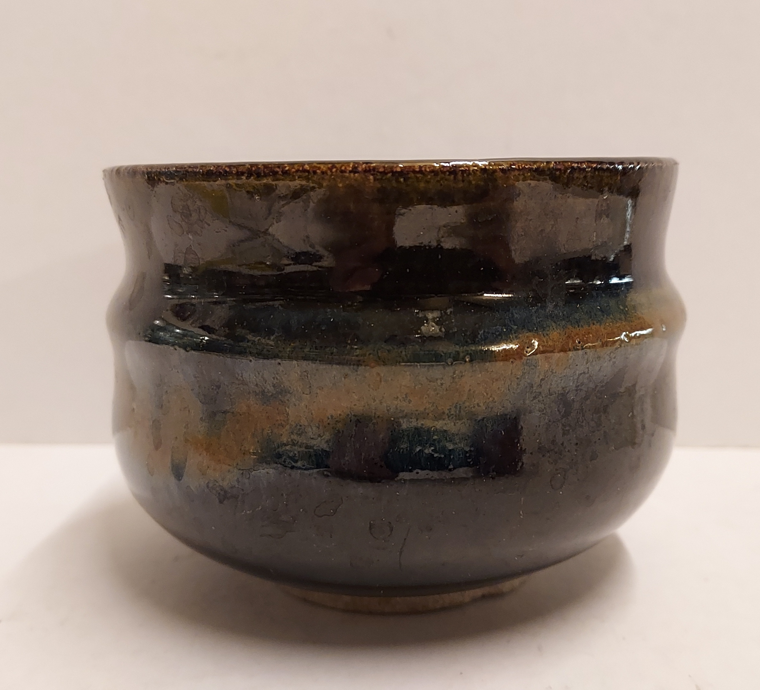 Taza de té de gres con esmalte Tenmoku y ligera constreñimiento. No firmado.