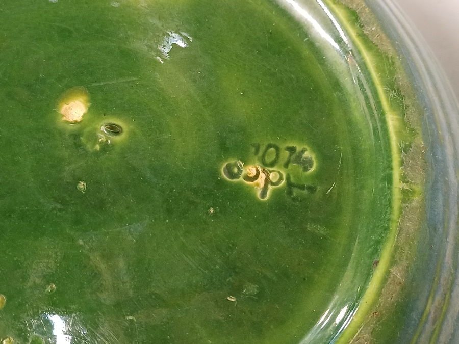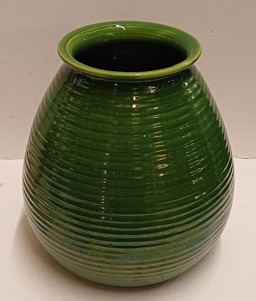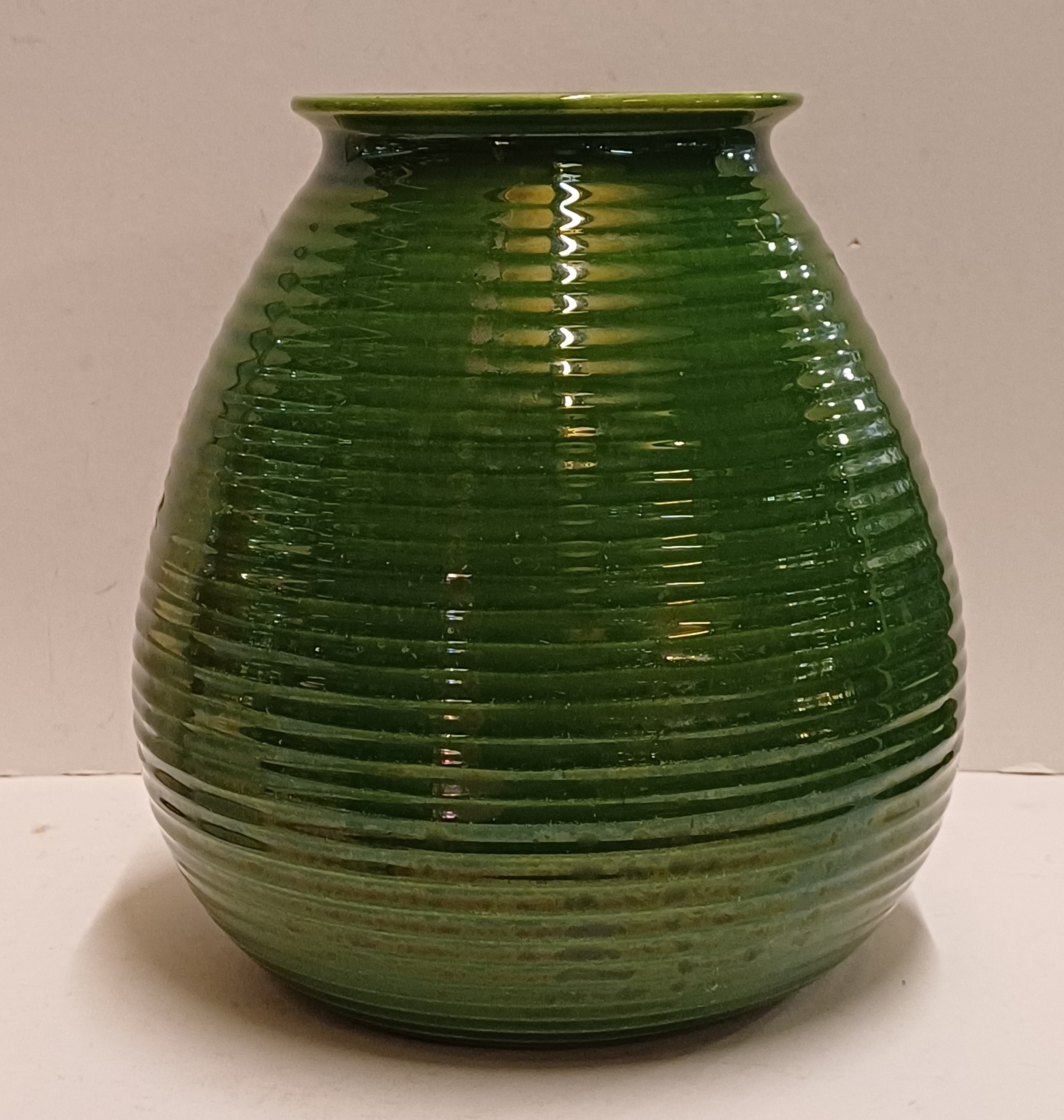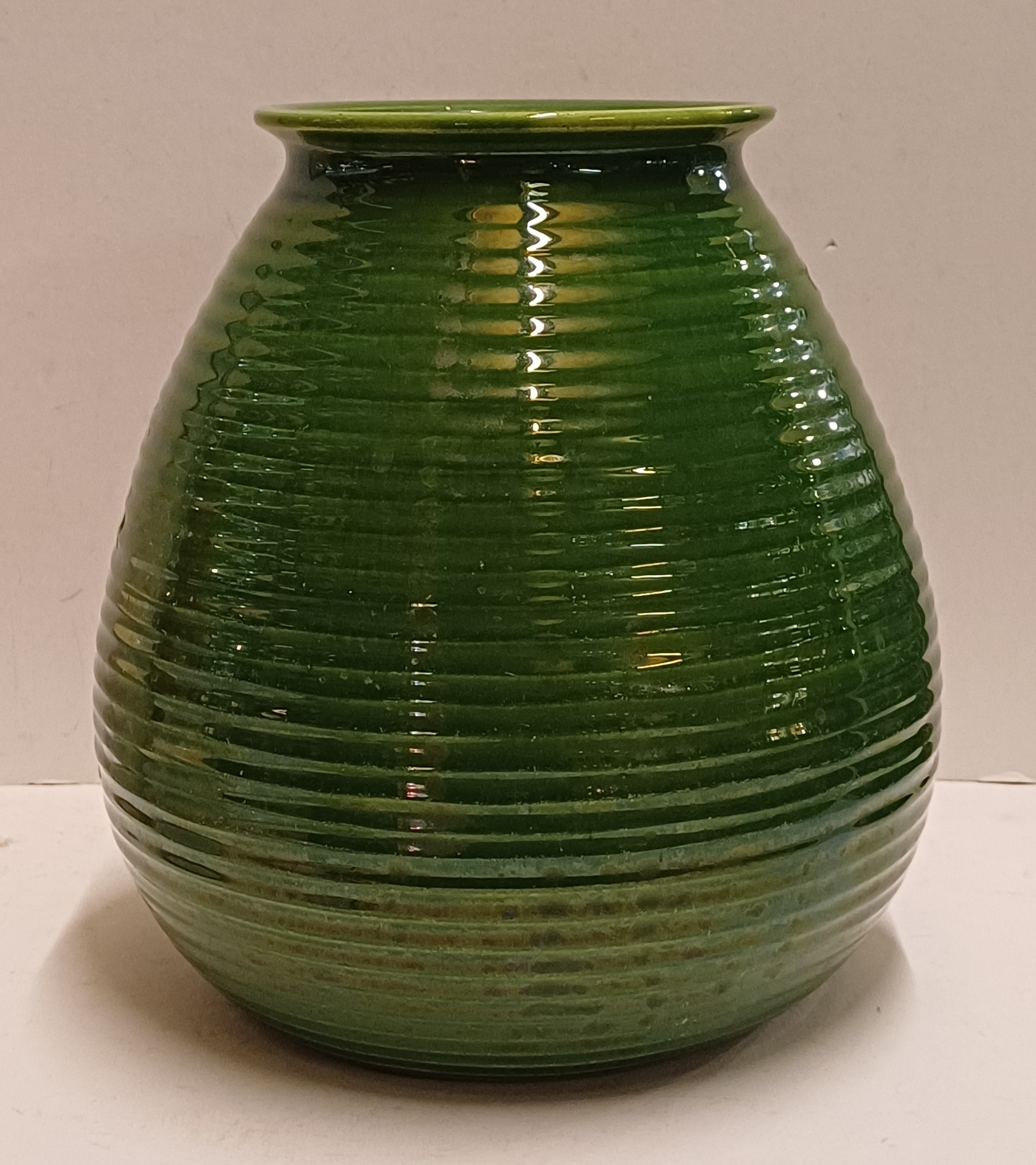 Aardewerken groen geglazuurde vaas. Onderzijde met fabrieksmerk en modelnummer.